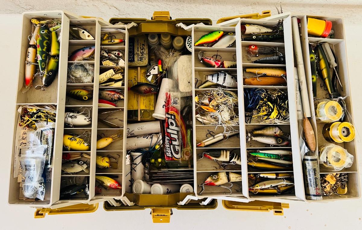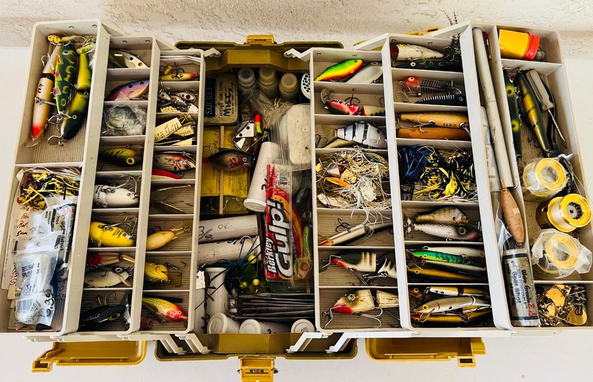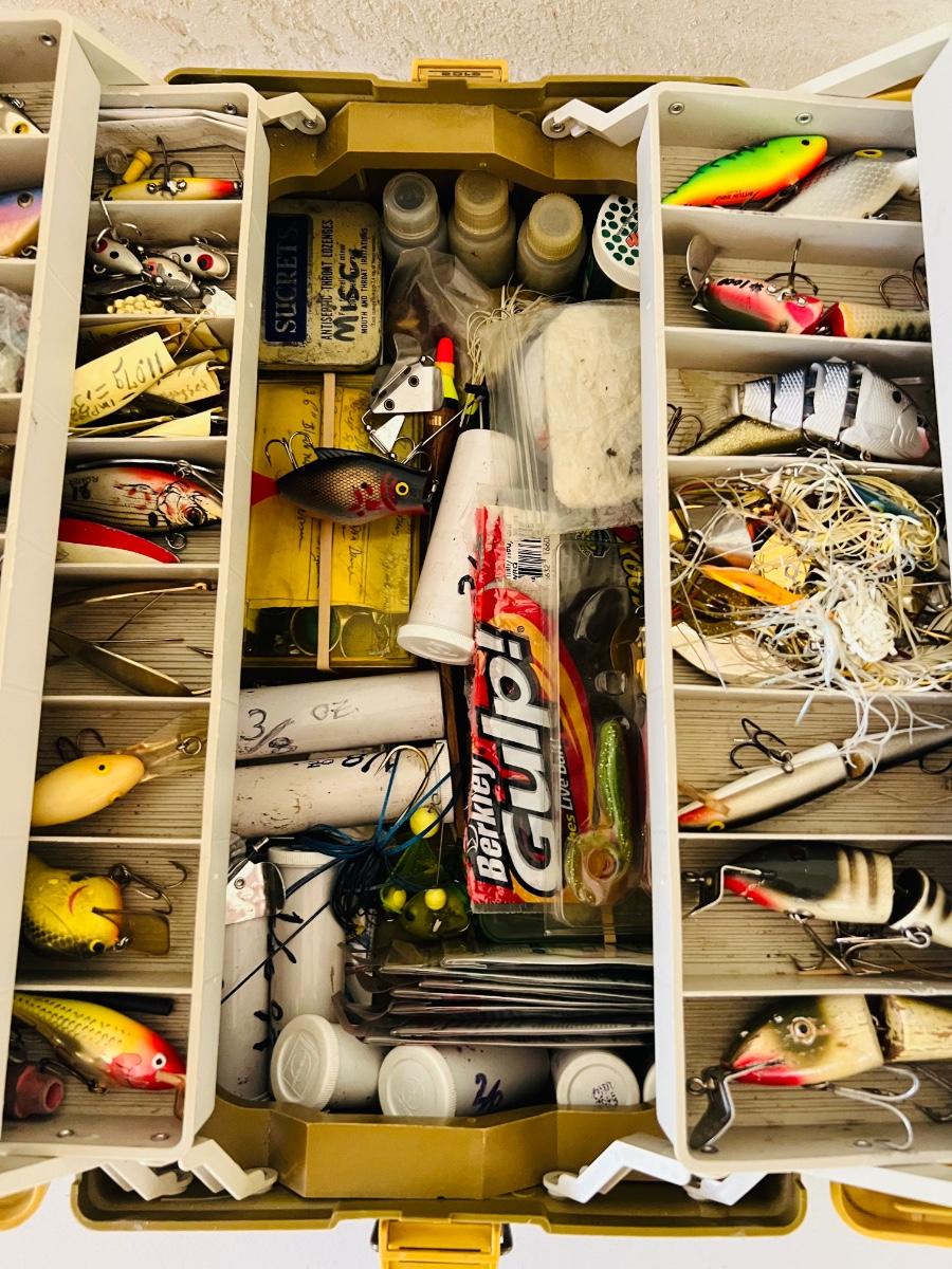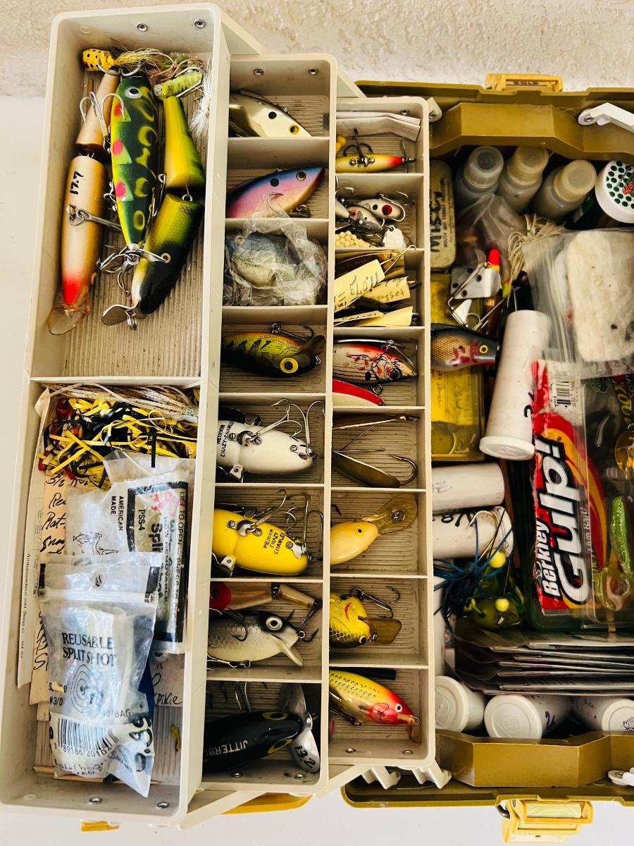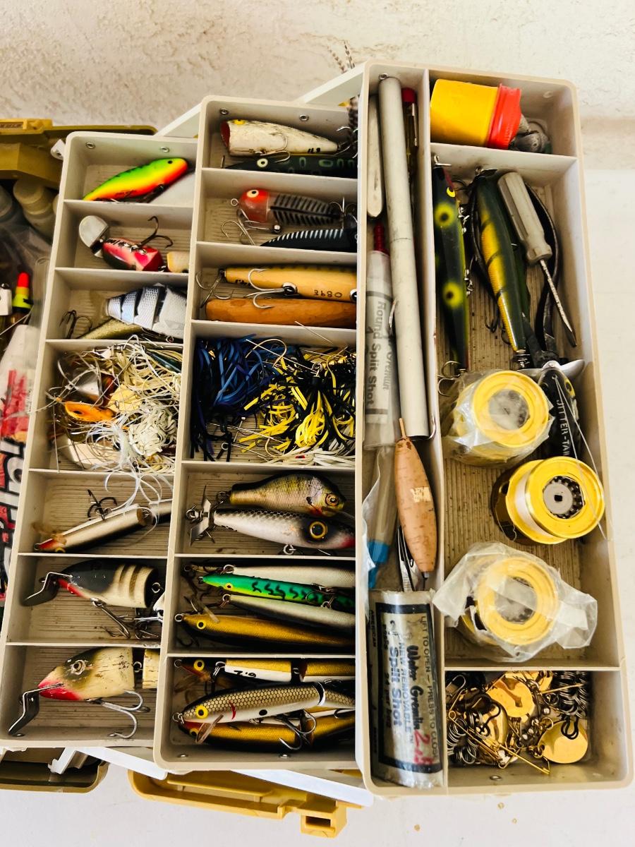 This Tackle Box Lot of This & That has a little bit of everything. You are bidding on everything you see pictured. Table not included.