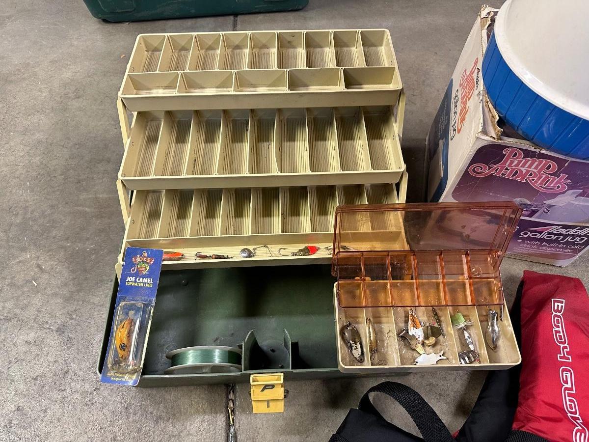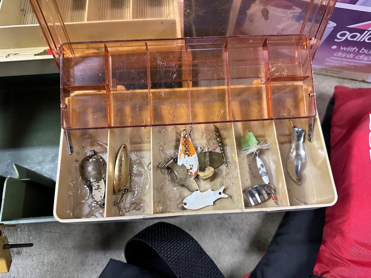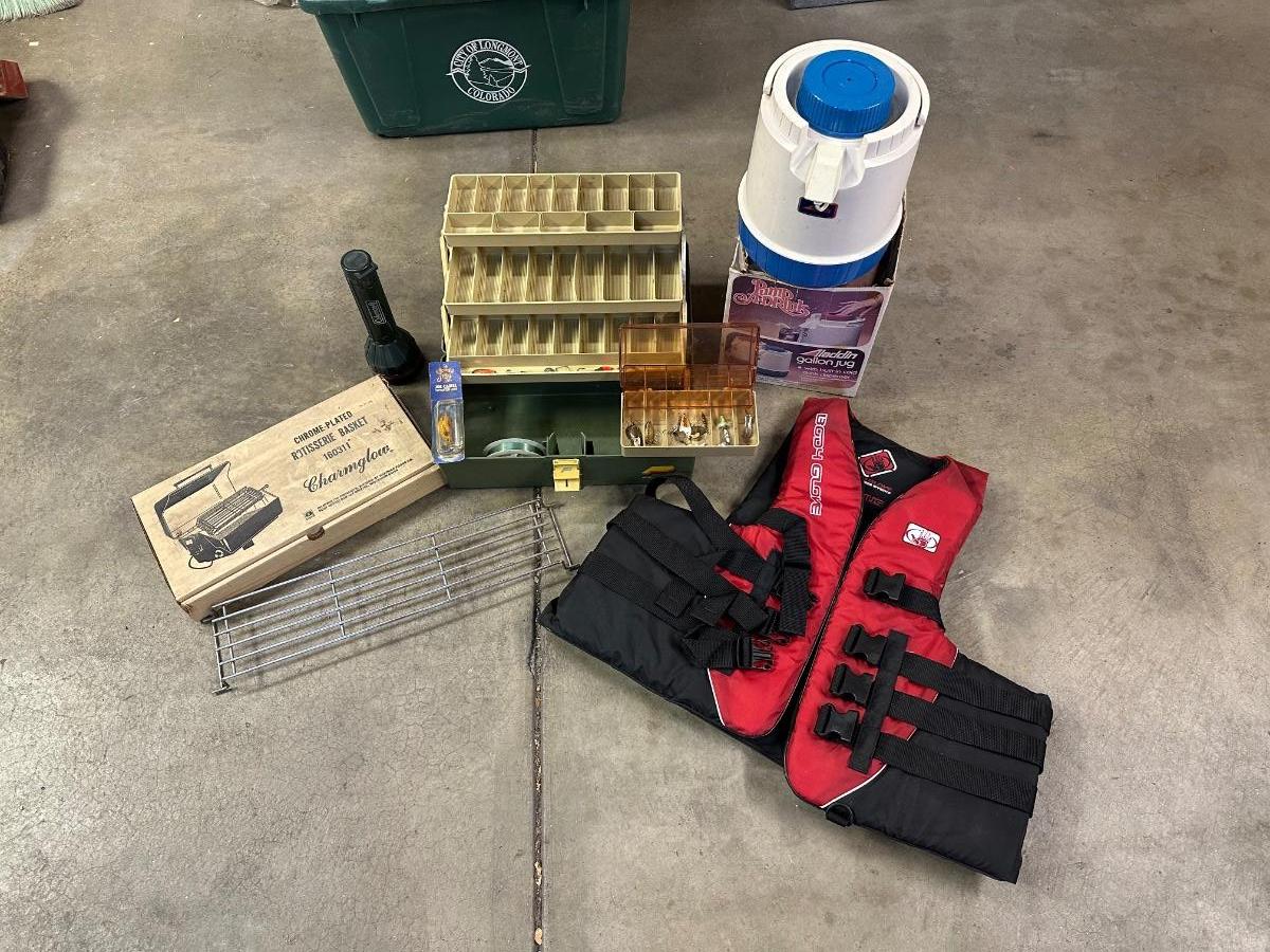 TACKLE BOX WITH SOME TACKLE, ADULT LIFE VEST AND MORE