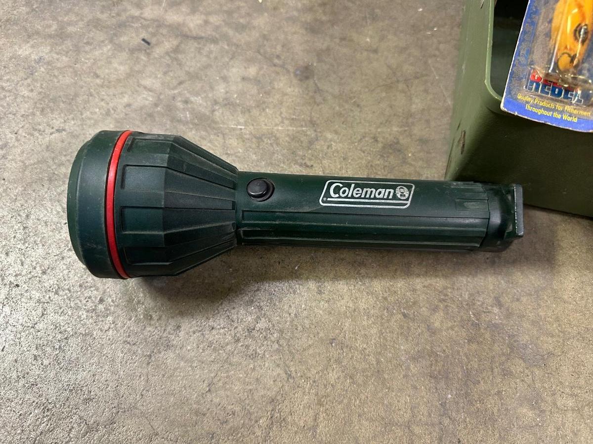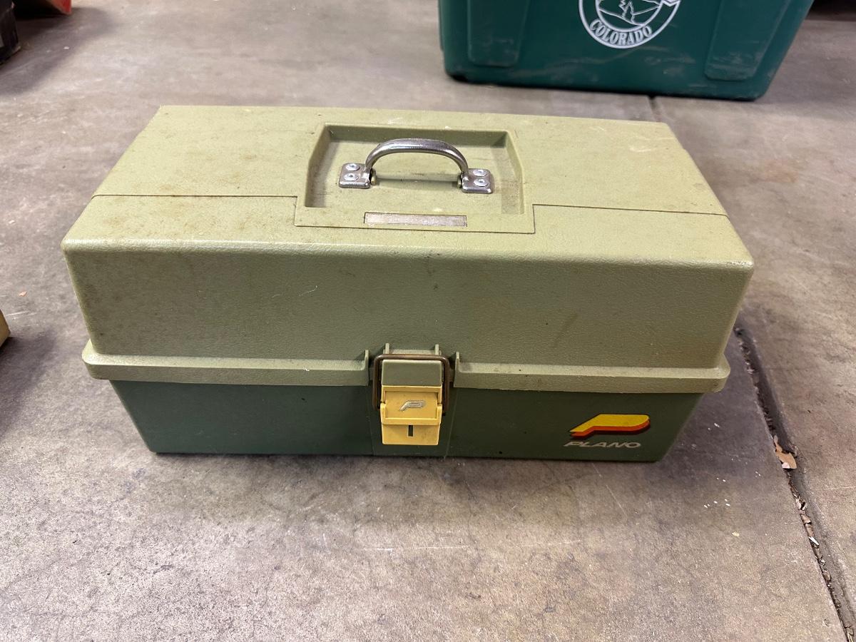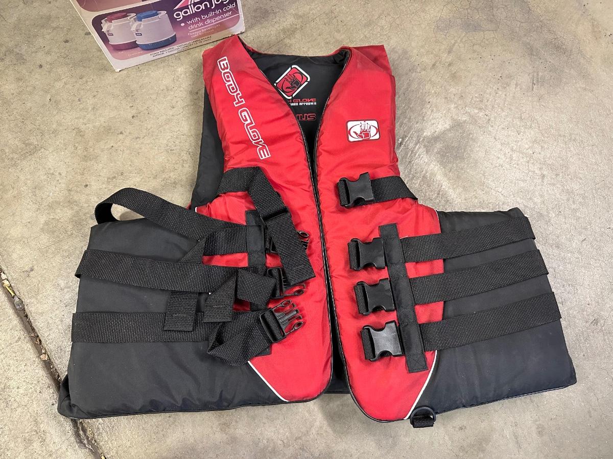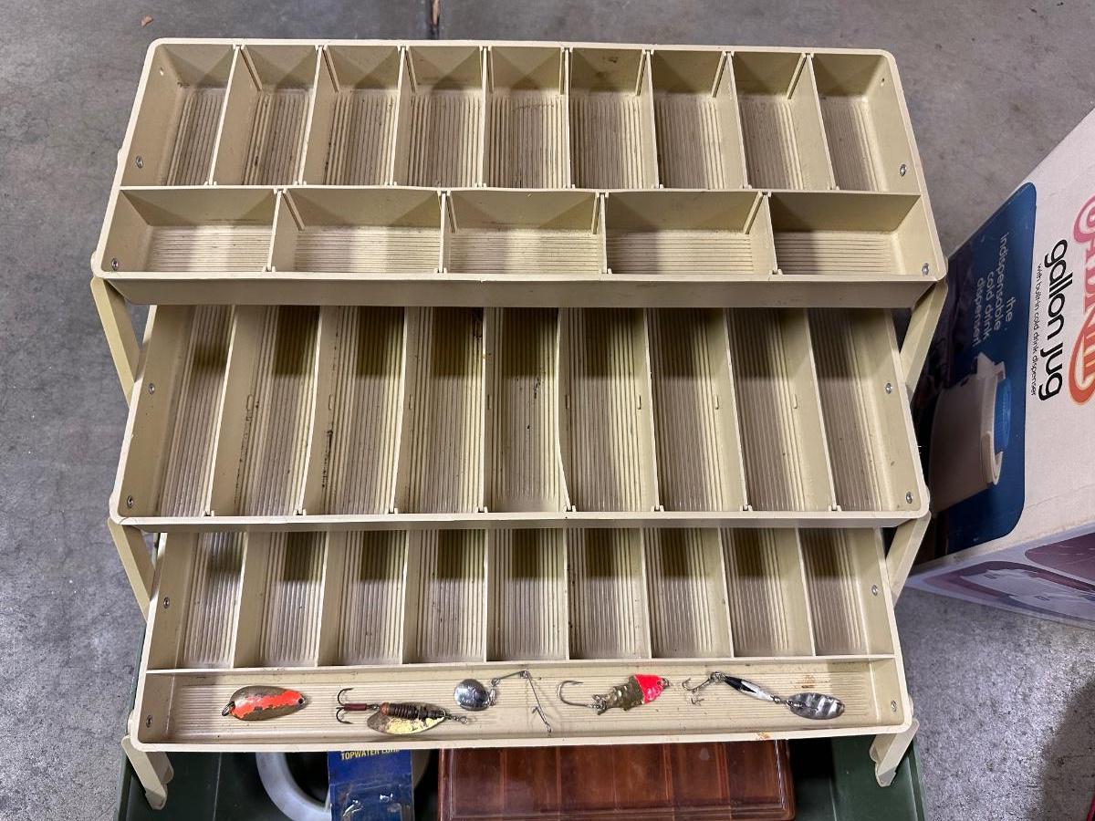 TACKLE BOX WITH SOME TACKLE, ADULT LIFE VEST AND MORE