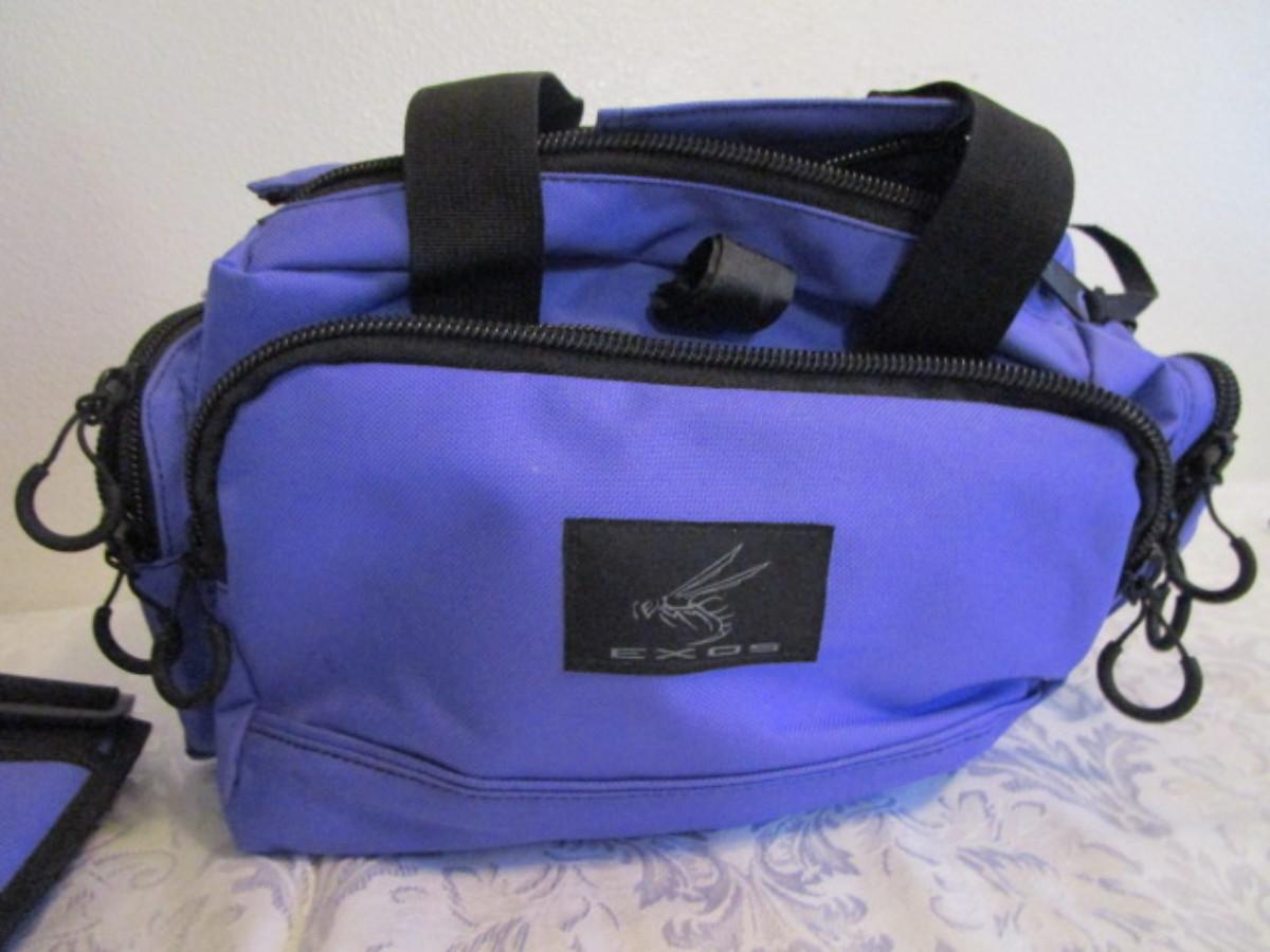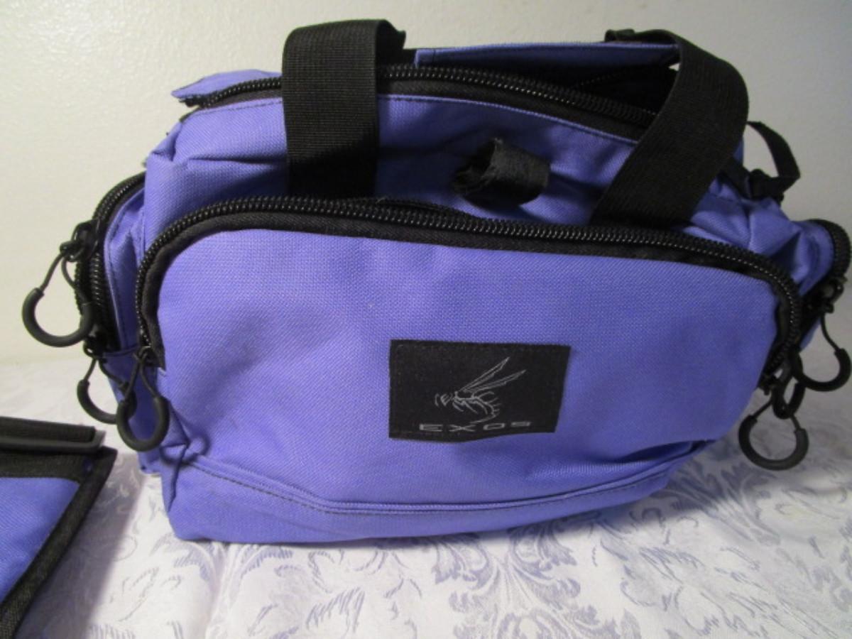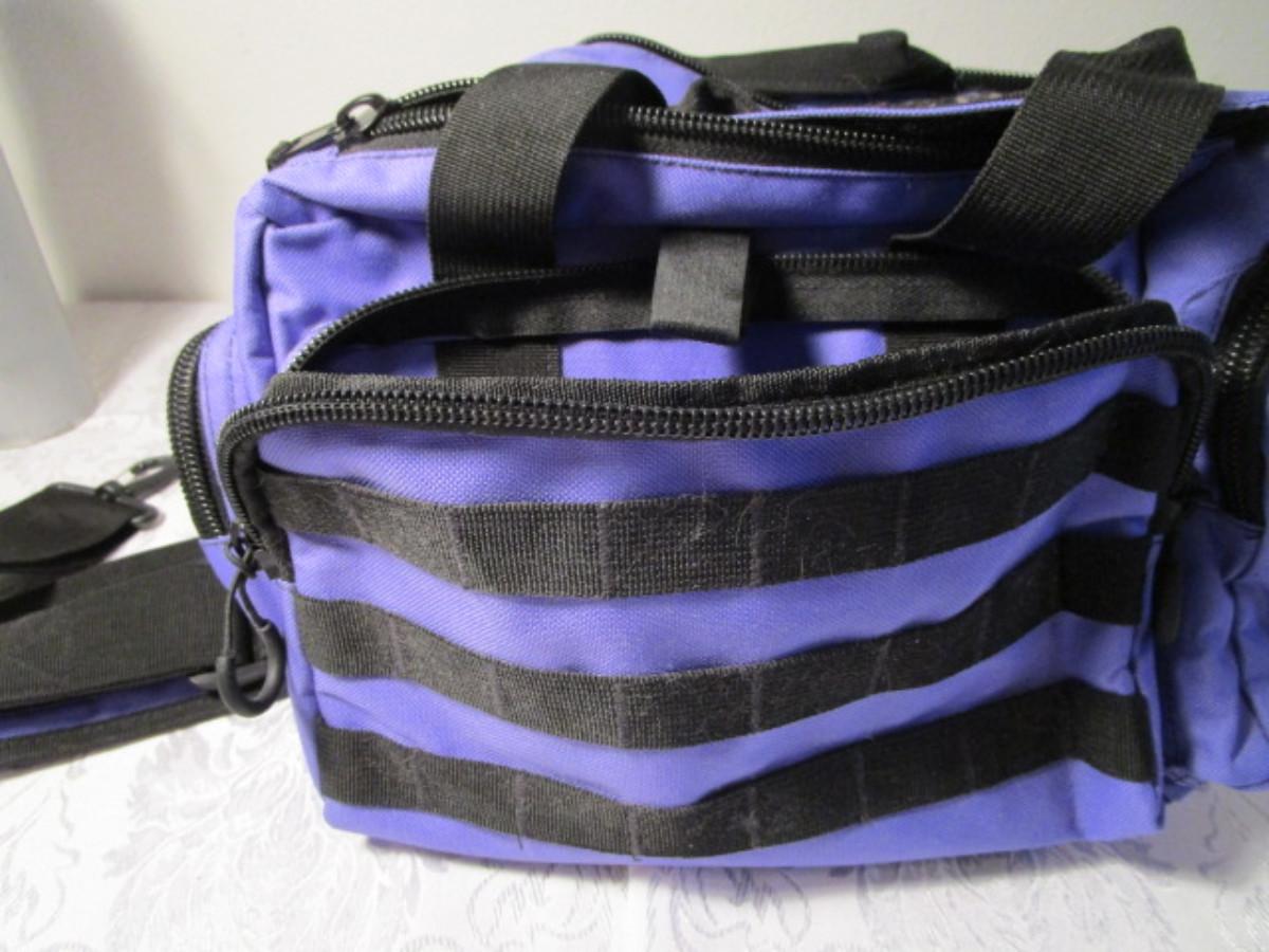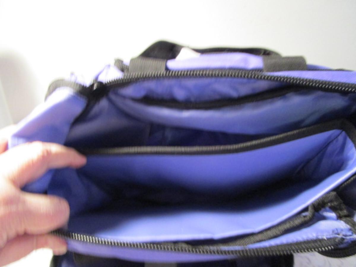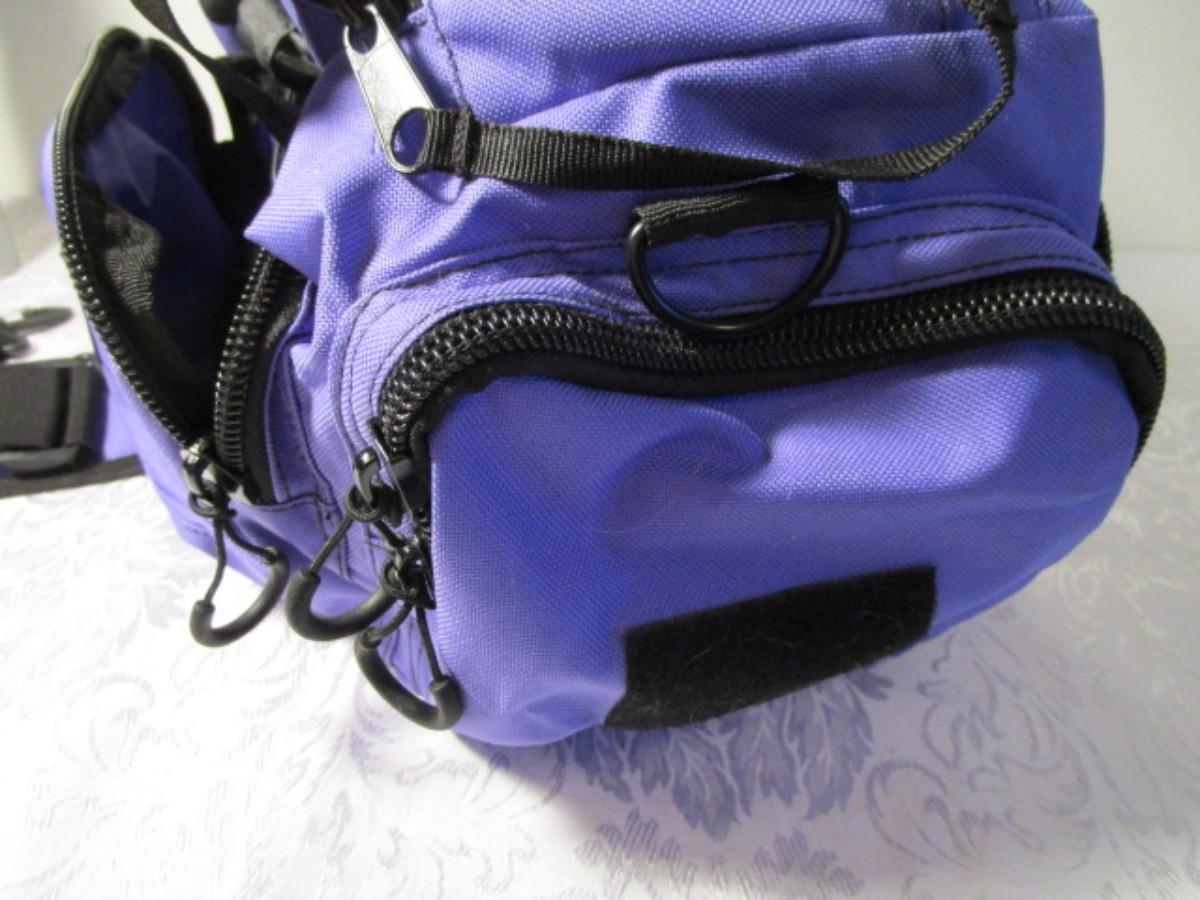 Purple, 9" x 14" x 11" tall, has dividers in the main compartment, see pictures