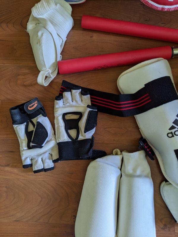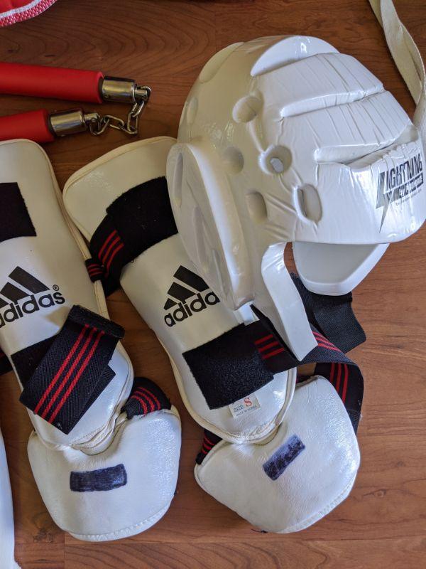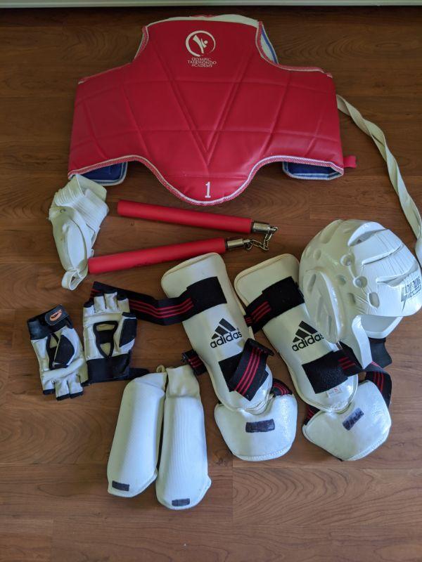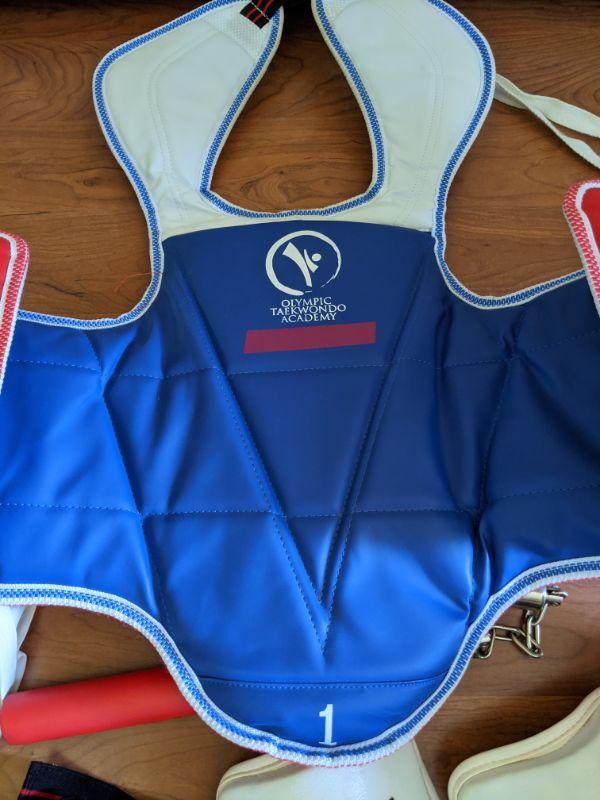 Size is 1 which is equivalent to children 4'3" - 4'8" in height and 70-90 lbs in weight. Condition is good. The chest guard has the Olympic TKD Academy logo on it. Includes all gear in picture.
