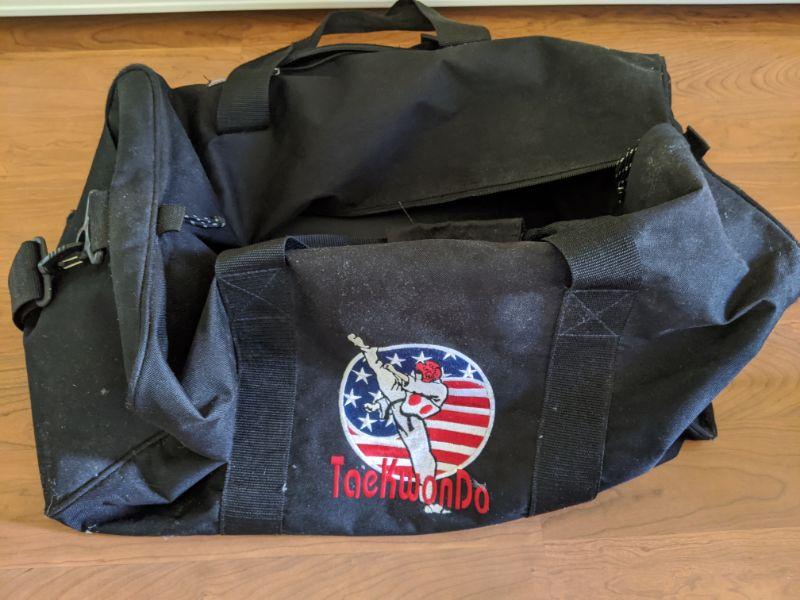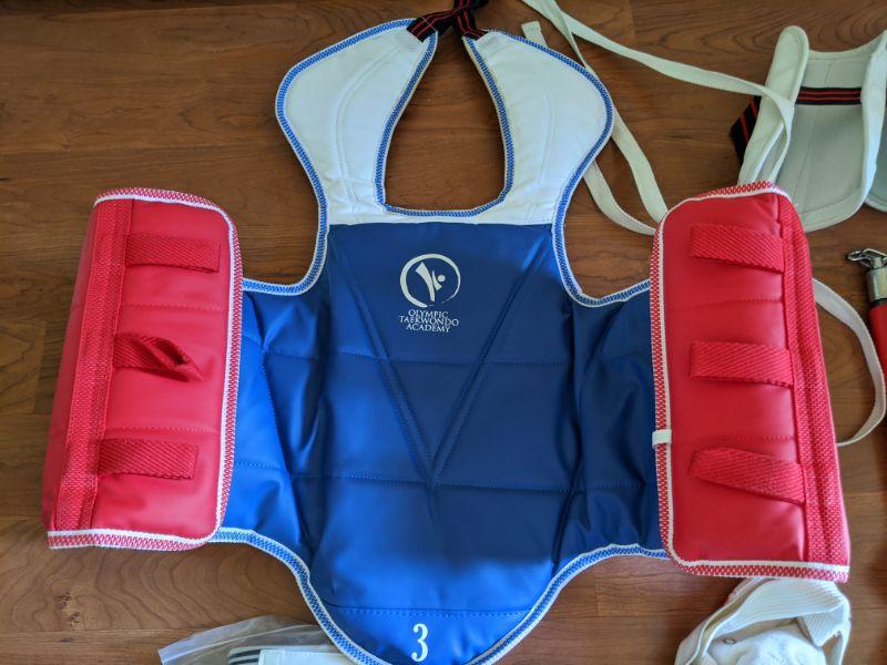 The chest guard is medium in size which is equivalent to 5'1" to 5'6" in height and 110-140 in weight. The chest guard has Olympic TKD Academy logo on it. Includes all gear in the pictures including bag. Some gear may have name written with a marker.