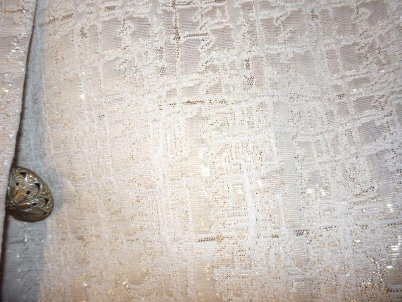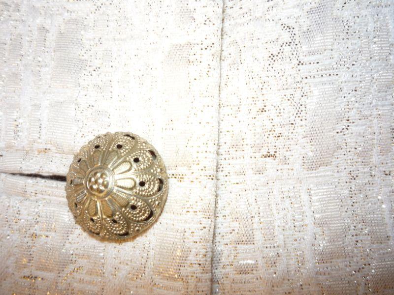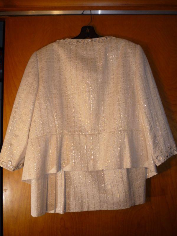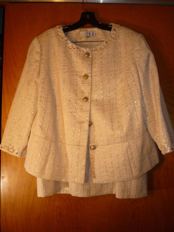 Embellished sequins and material cream with gold threads with gold filagree buttons. Skirt zipper back close --kick pleats on back of skirt Fully lined skirt and jacket.- Size 16W