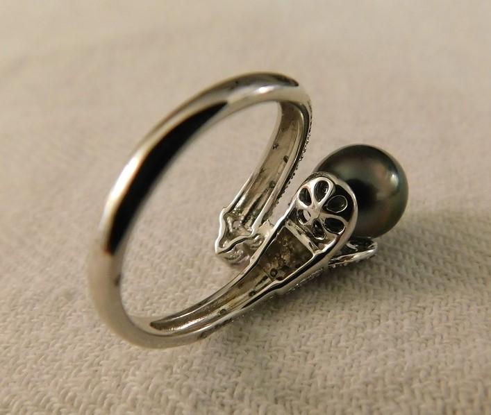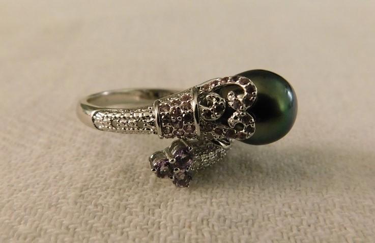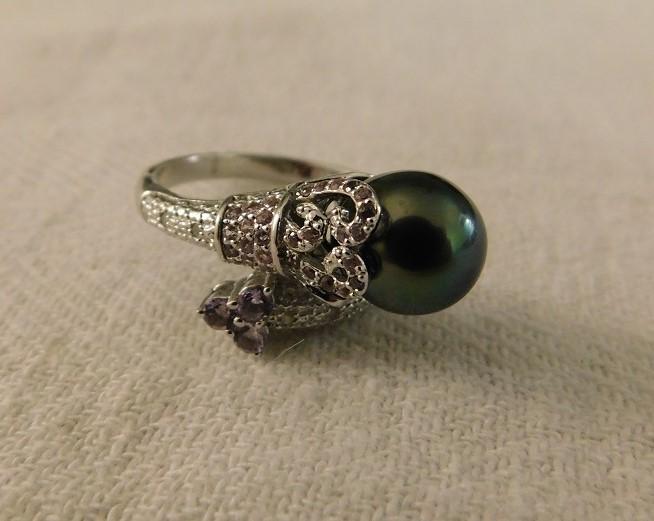 Tahitian Pearl Bypass Ring with White Zircon Accent. Sterling silver.