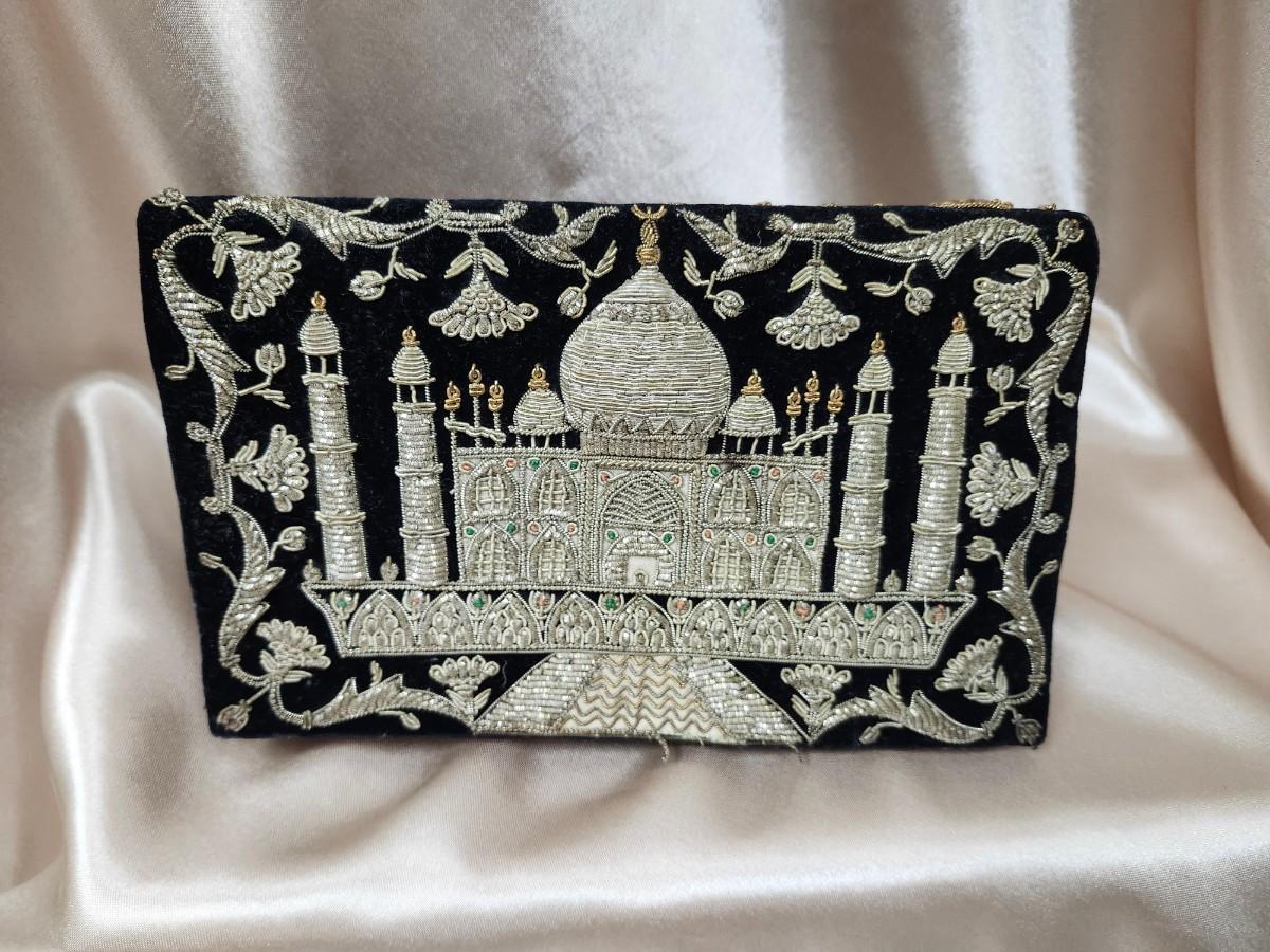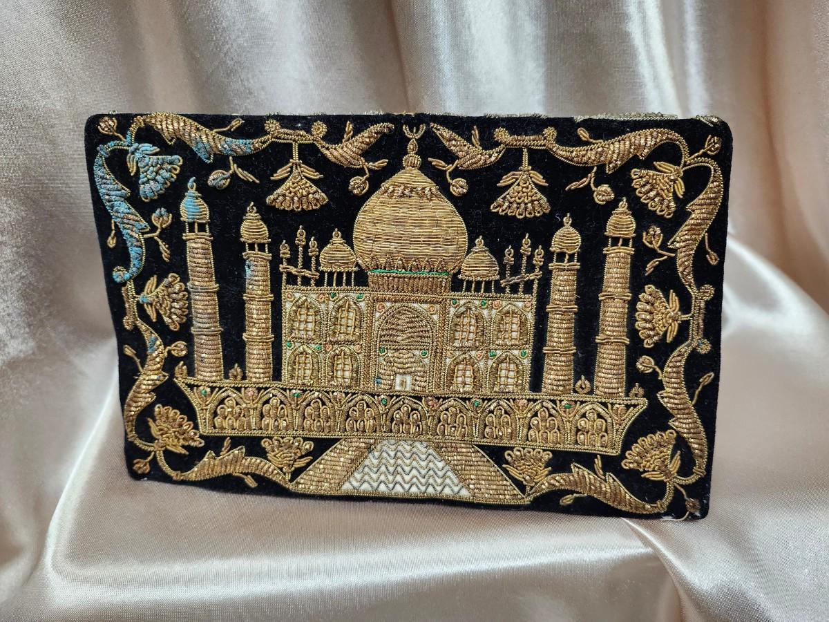 Indian turquoise, silver, and gold thread, two-sided clutch with a Taj Mahal motif. Three seperate compartments with a velver exterior. Snap clasps, absolutely exquisite hand embroidery detail. Perfect for that special evening.