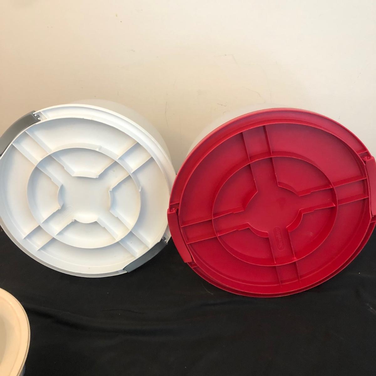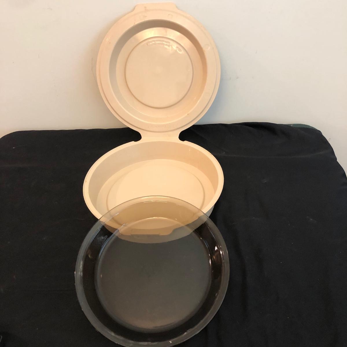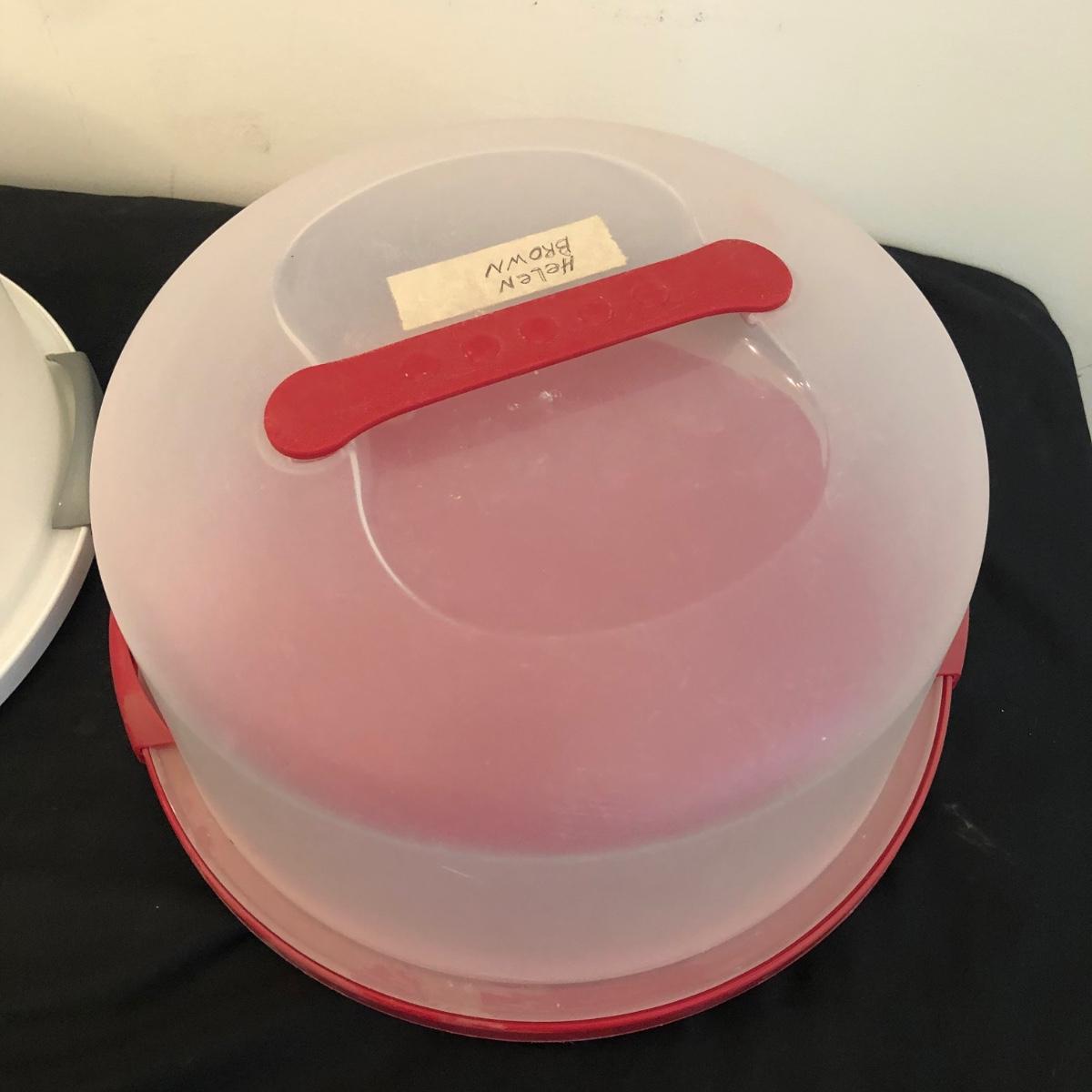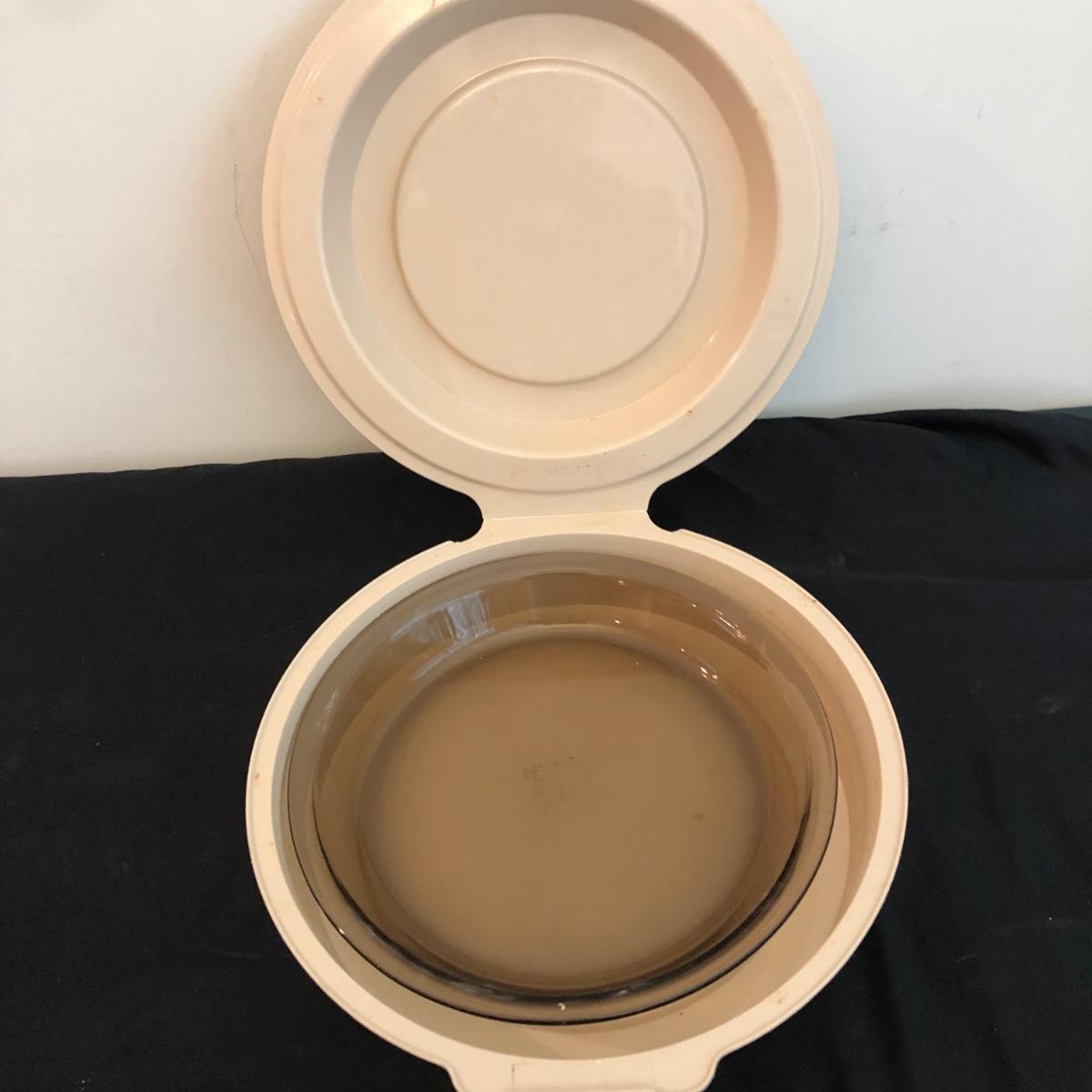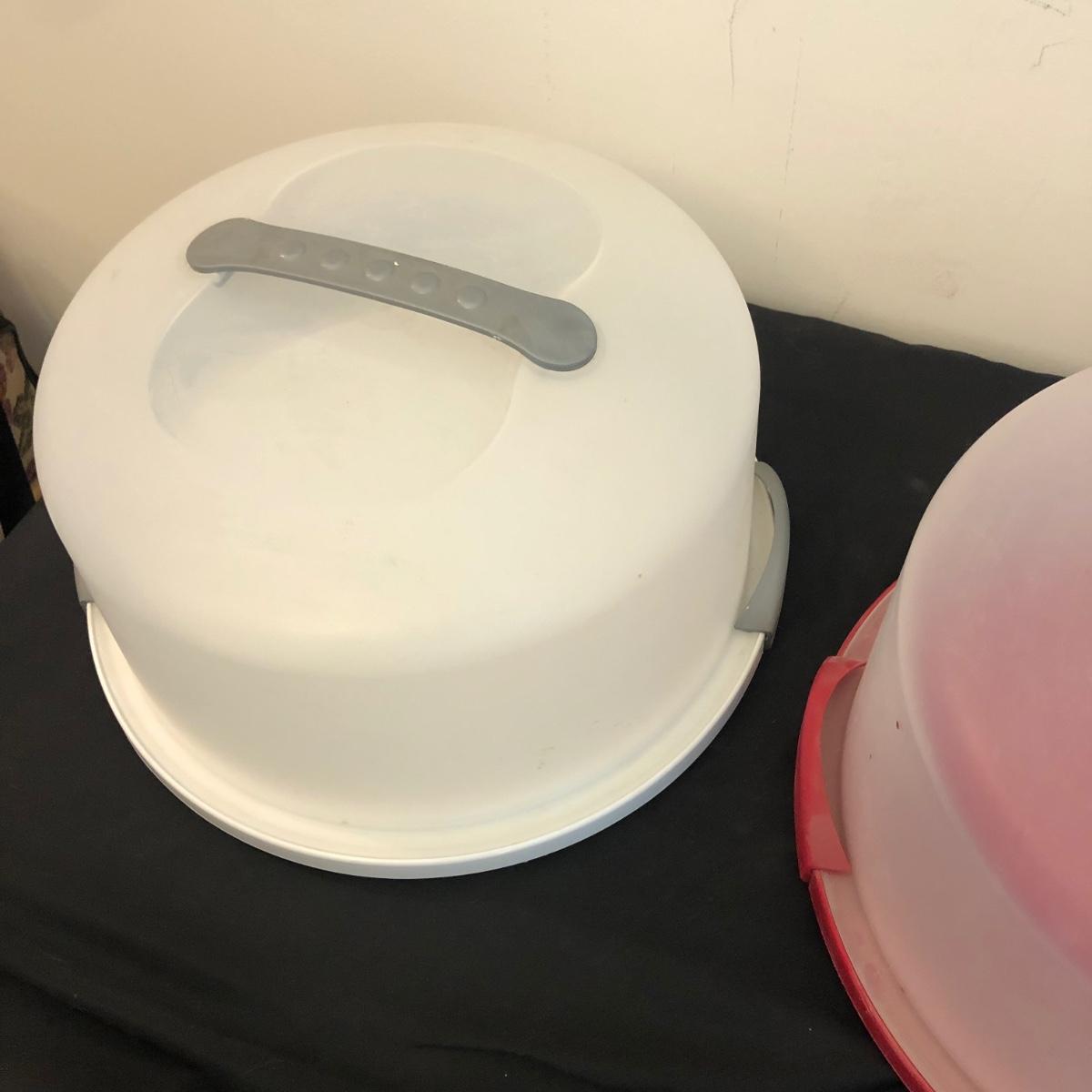 There are seven items in this lot: two covered cake containers, a Tupperware pitcher, two Anchor dishes with lids (and one has an insulated cover), a covered Pyrex dish and a covered pie container. The anchor baking dishes measure 16” x 10”x 2.5” and 10” x 8.5” x 2.5”. Shipping Available.