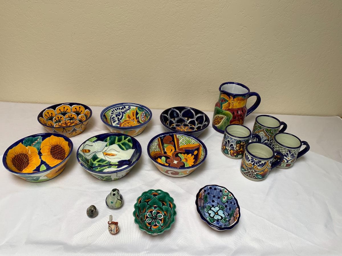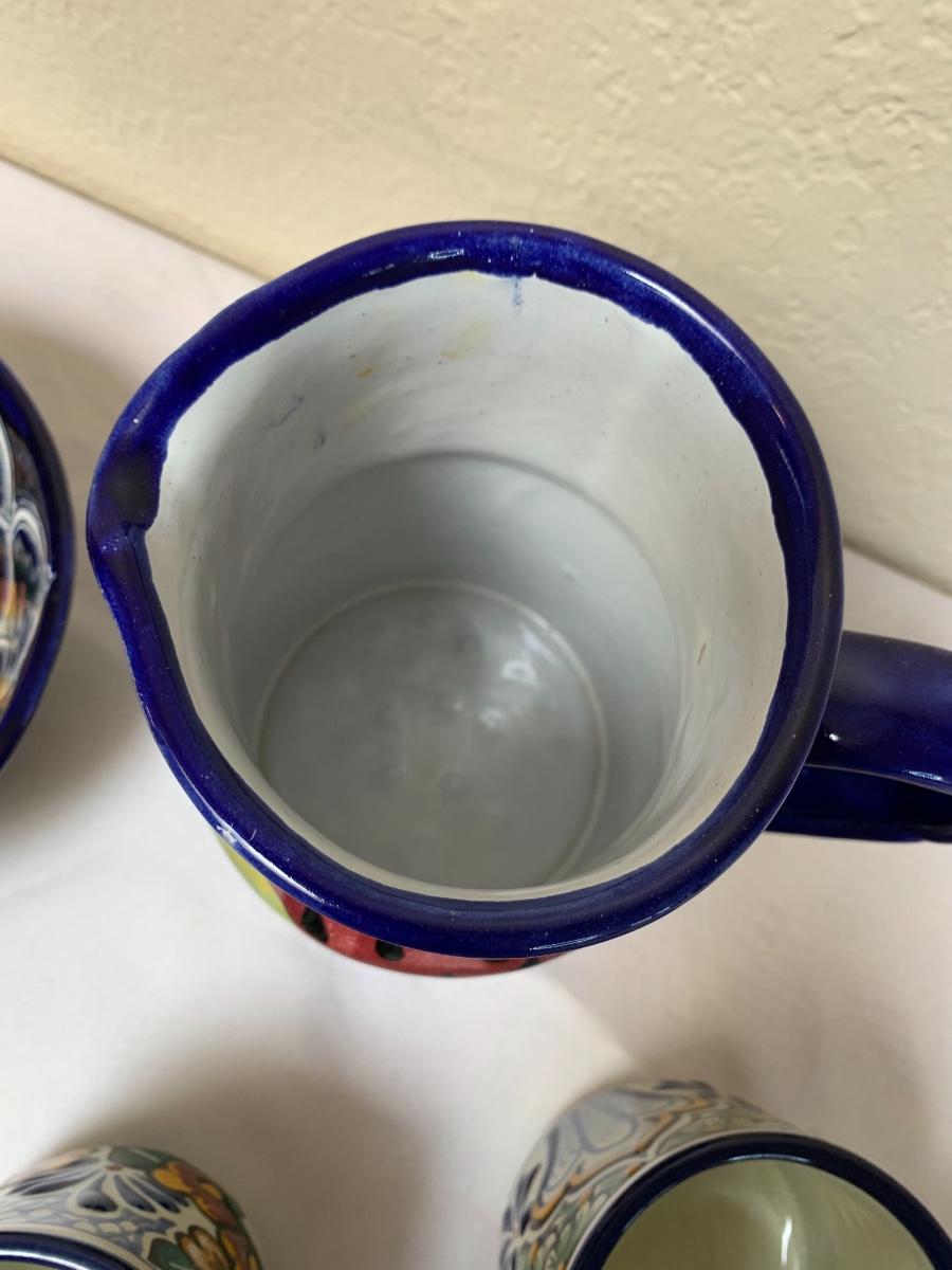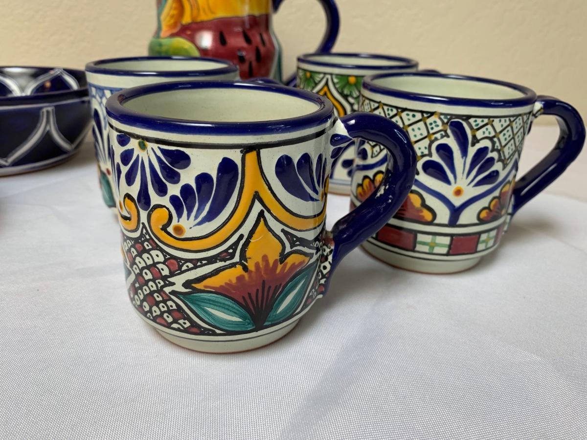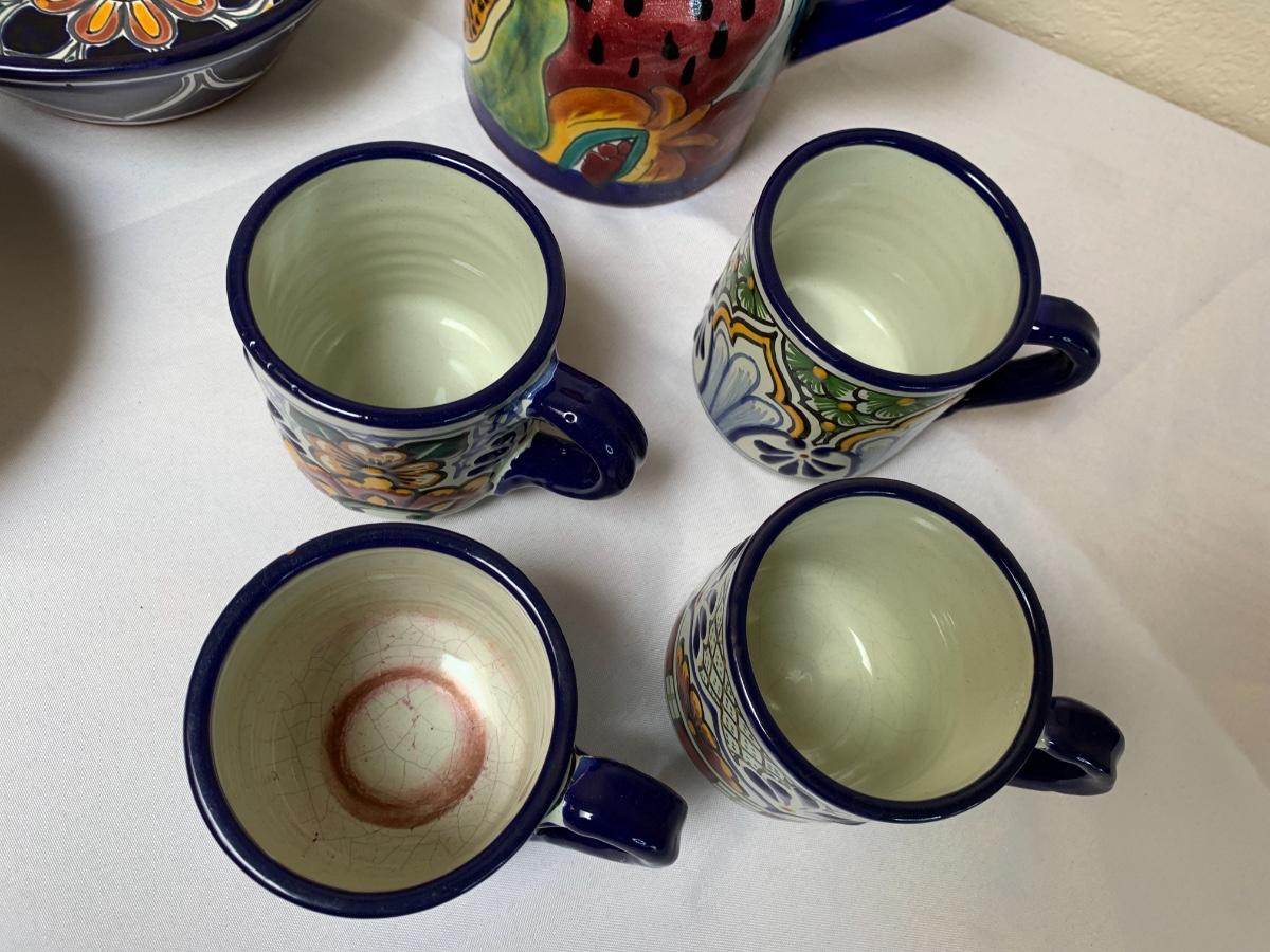 Talavera pottery hand painted in Puebla, Mexico. All in good condition, one bowl has a chip and one mug has some crazing and a flea bite.