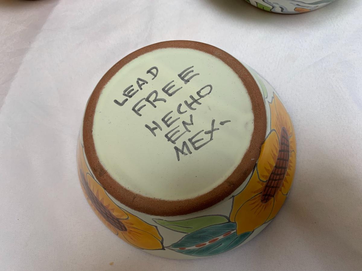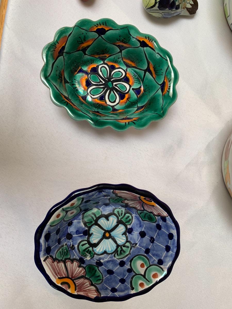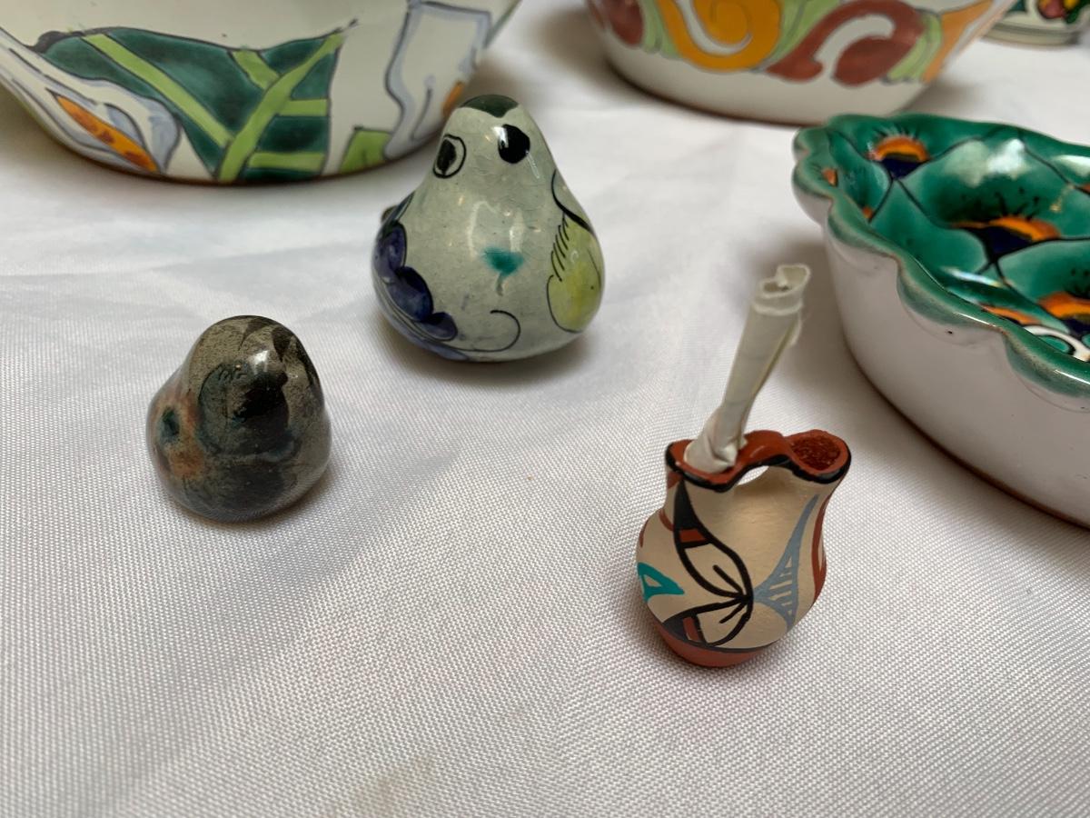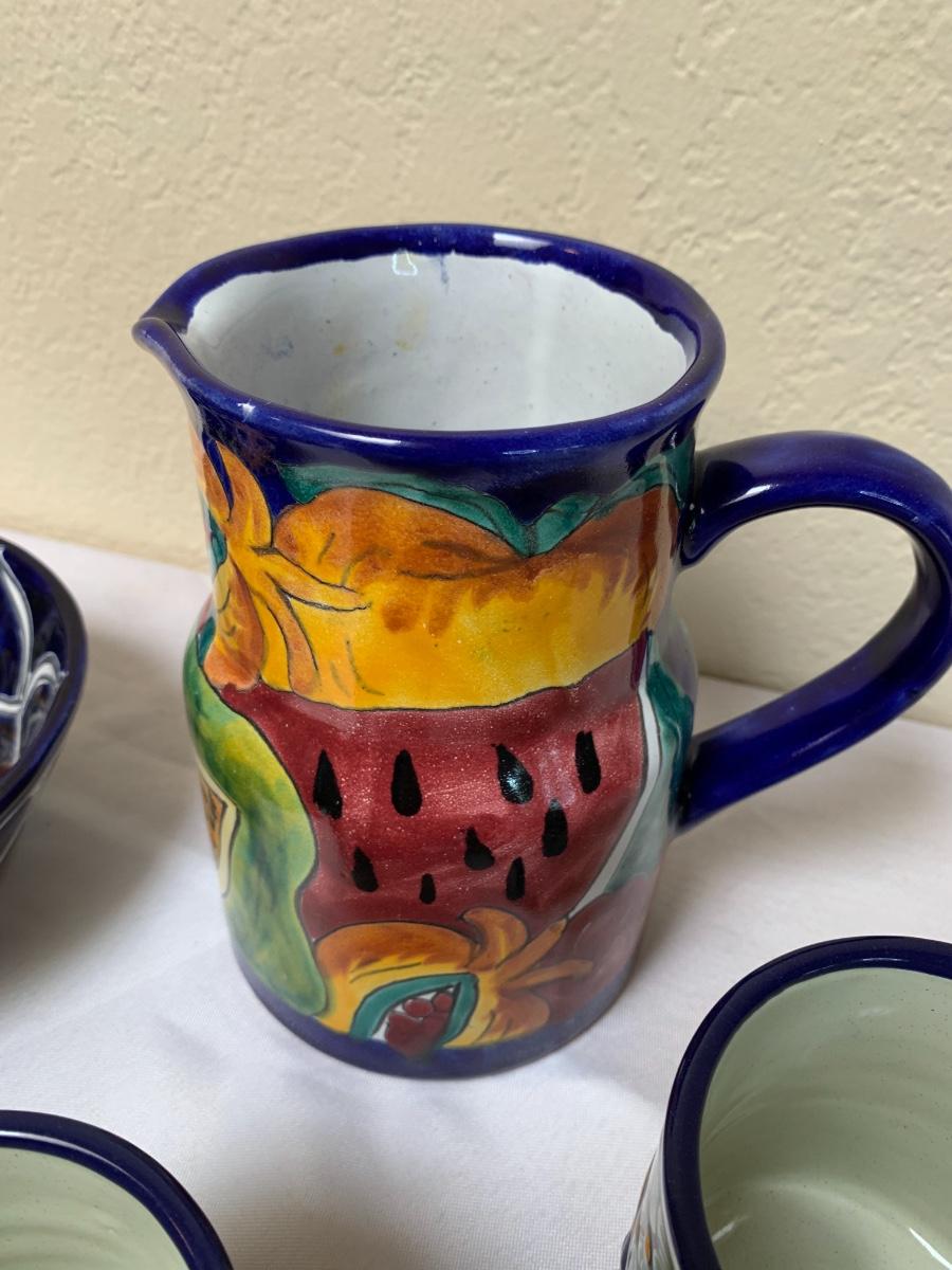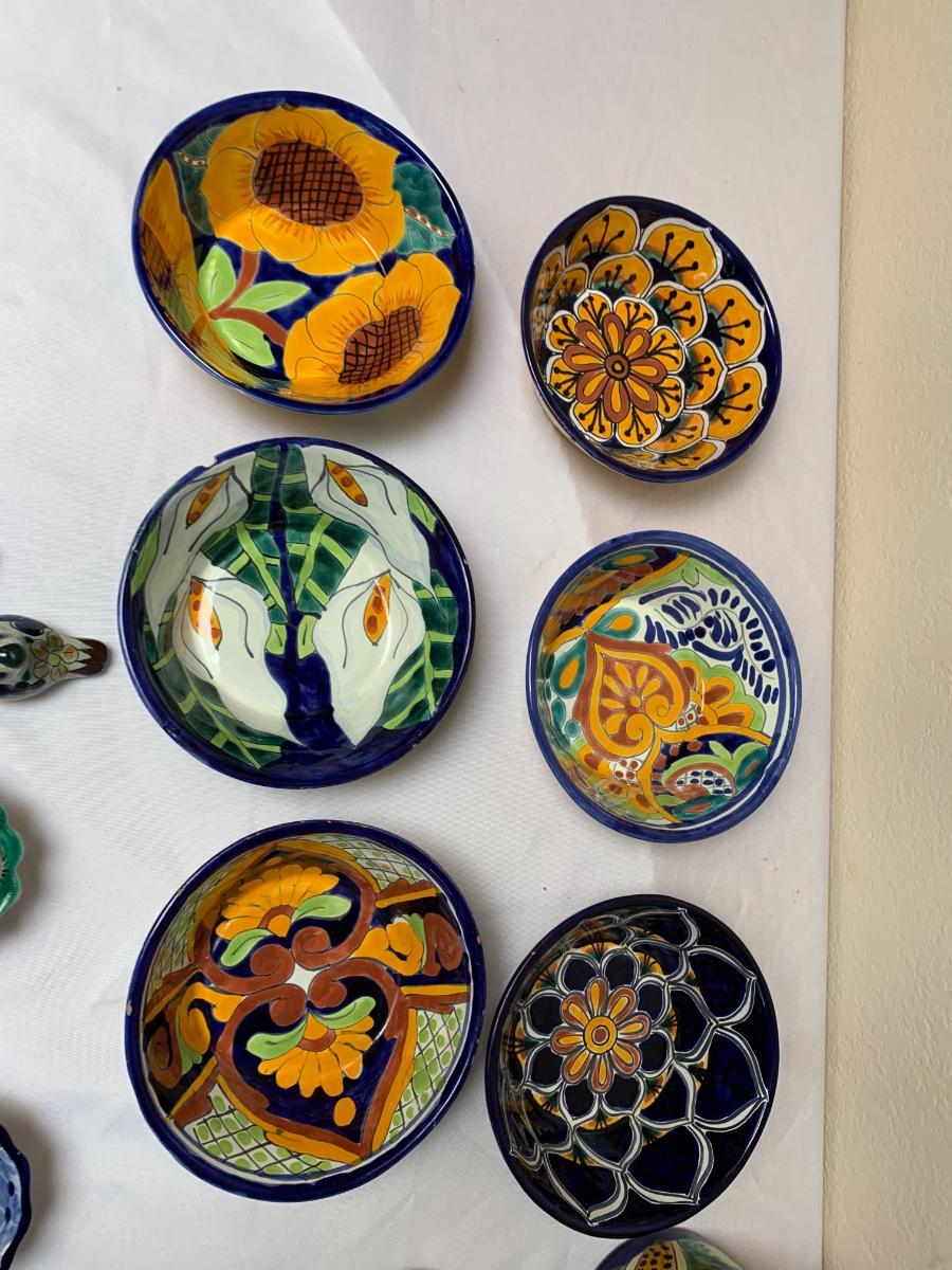 Talavera pottery hand painted in Puebla, Mexico. All in good condition, one bowl has a chip and one mug has some crazing and a flea bite.