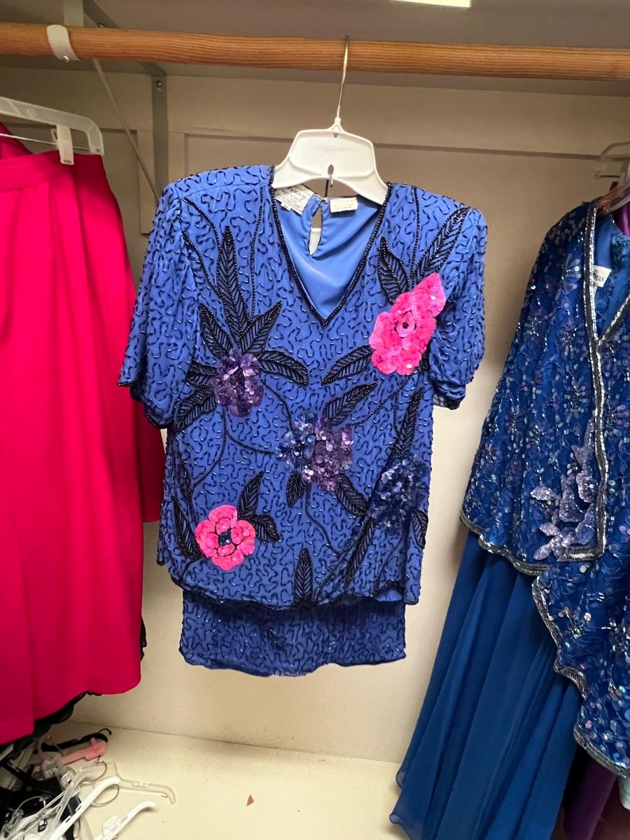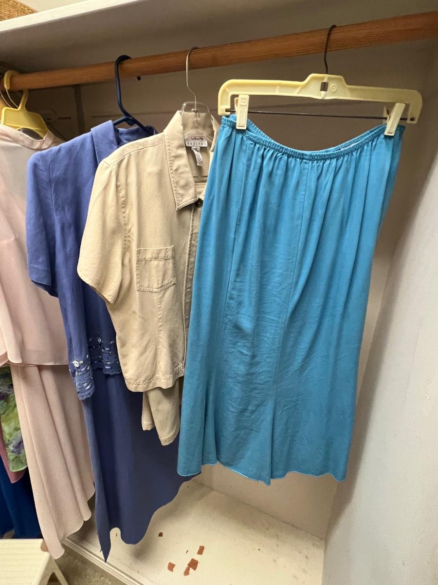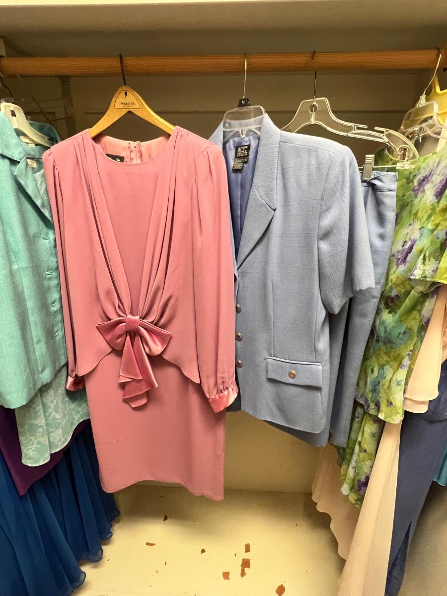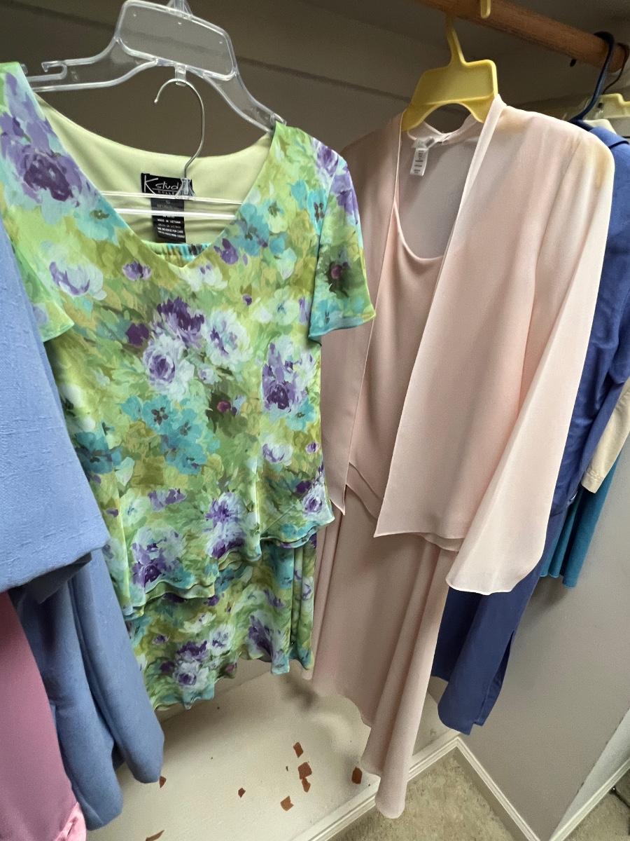 A great assortment of mostly dressy outfits. Lots of two and a few three piece outfits. Mostly sized petite in a range of mostly medium, see images for all sizes and brands. The pink two piece has a small stain, see image.