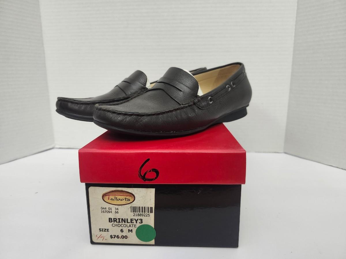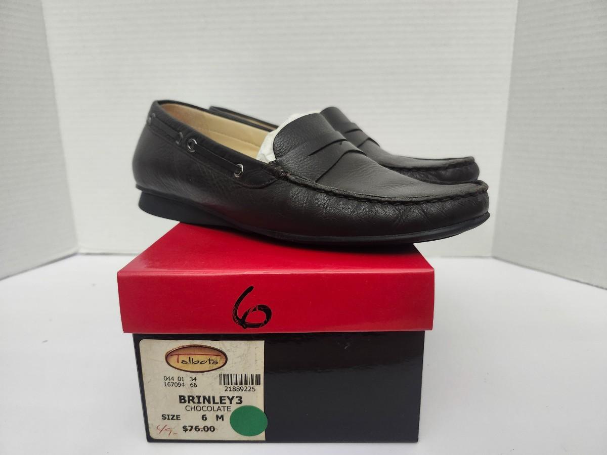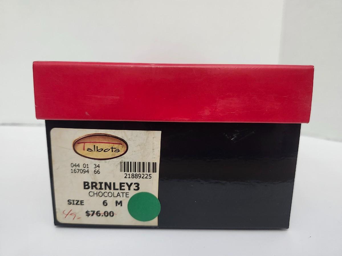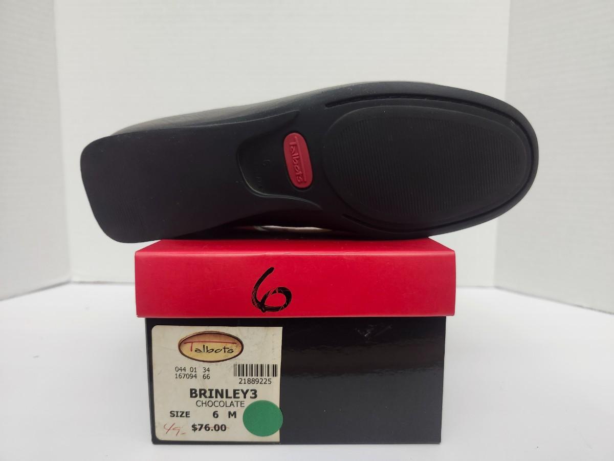 Talbots Brinley 3 women’s slip on loafers in chocolate brown leather with moc toe stitching and penny style strap detail. Marked size 6 M on original Talbots box with Brinley 3 Chocolate label. Low profile classic loafer design suitable for everyday or work wear. Includes original branded box as shown. All details stated strictly from visible labels and photographs only.
