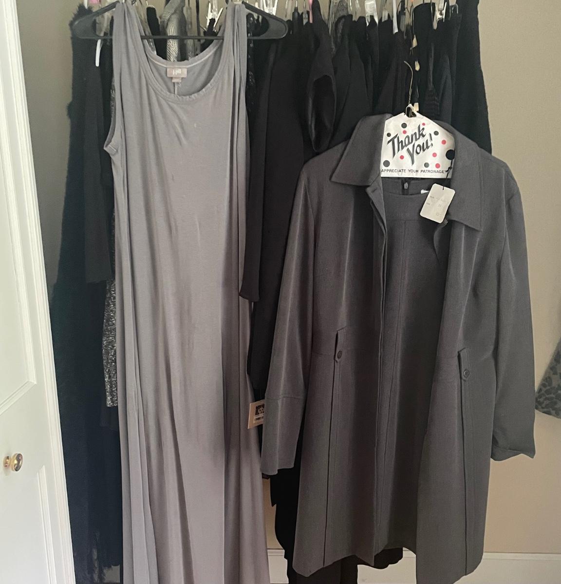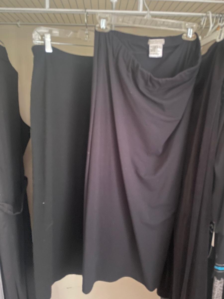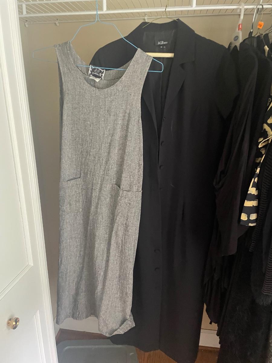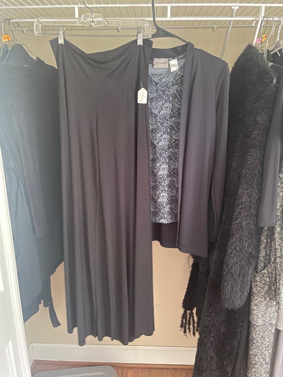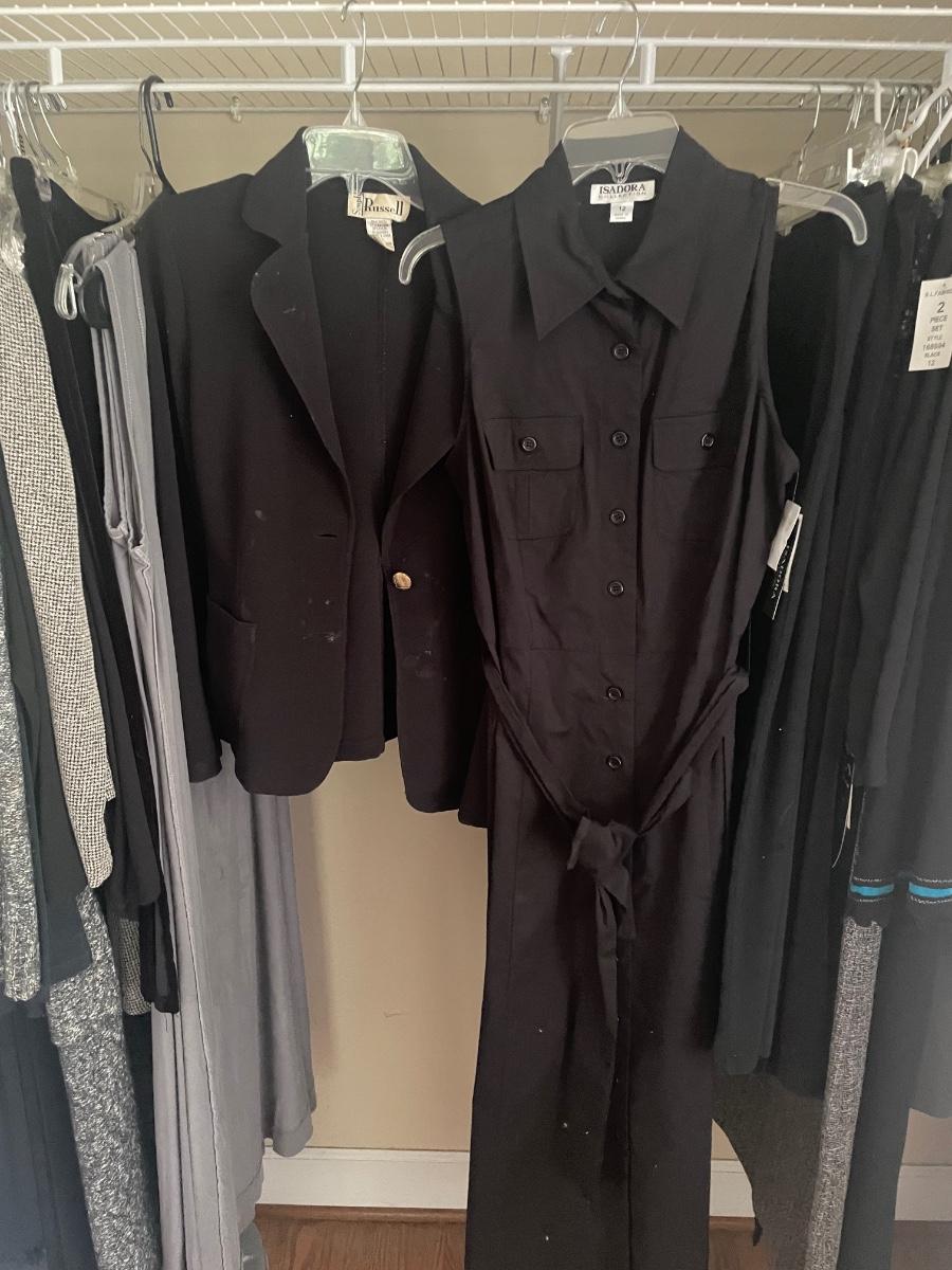 This huge lot has some great name brands and dressy plus casual dresses, shirts, pants and two-piece outfits with lots that are NWT. See images for sizes, brands and tags. Note one skirt (skirt with blue embroidered hemline) has a stain that looks like it should come clean with washing. There are 3 matching J. Jill grey dresses size small and medium.