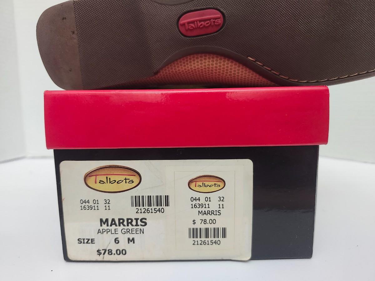 Talbots Marris women’s slip on loafers in apple green leather with textured finish and moc toe stitching. Labeled Marris Apple Green size 6 M on original Talbots box. Classic low heel loafer style with Talbots branding visible on sole. Includes original Talbots shoe box shown in photos. Description based only on visible labels and images.