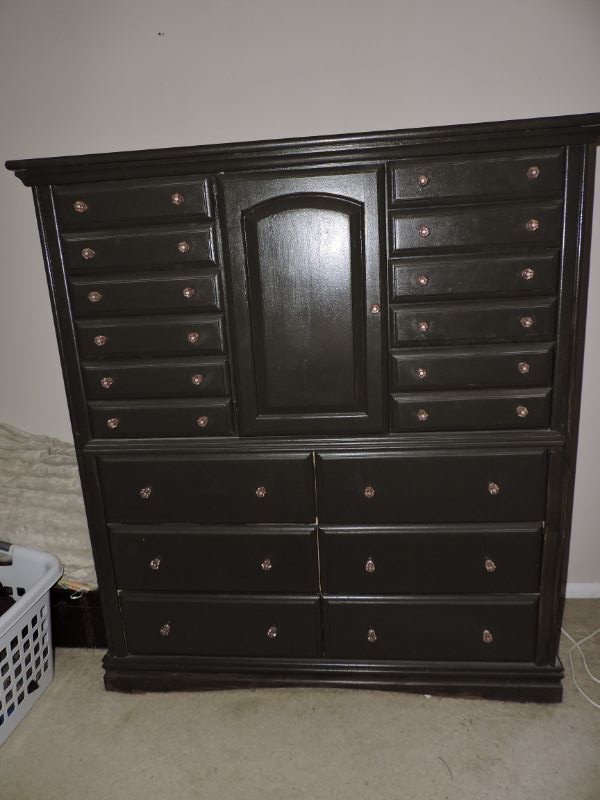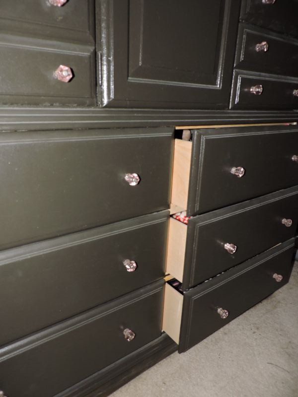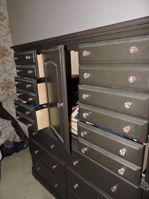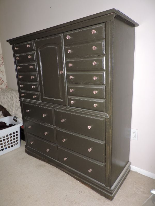 Tall 12-drawer dresser with cabinet with pink glass nobs. Tons of storage in this one! Matches the long dresser. Has been painted dark green but could use a makeover. Nice sturdy piece with lots of storage. 49”x18.5”x55”