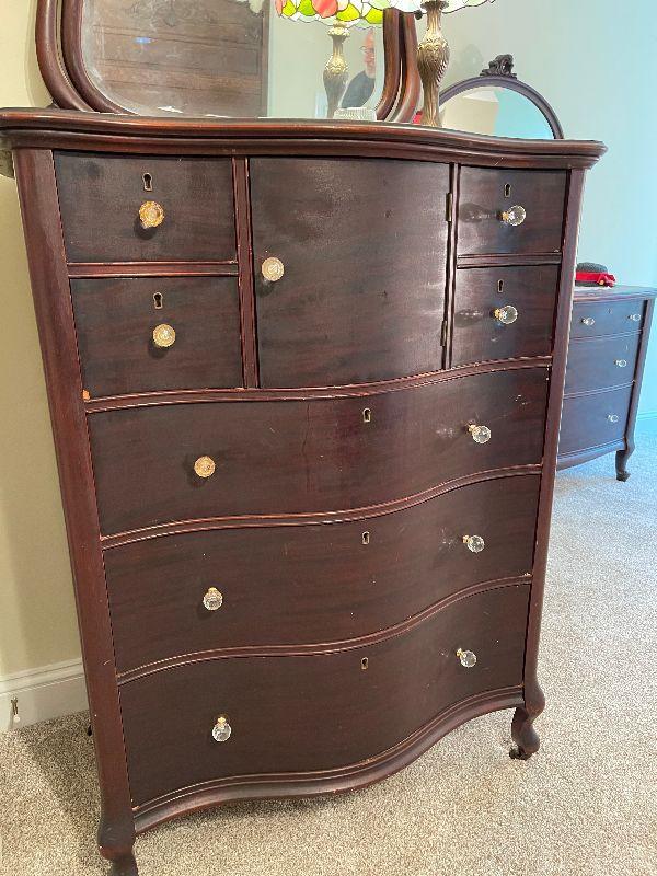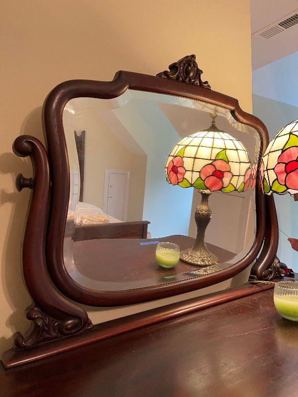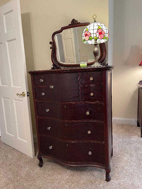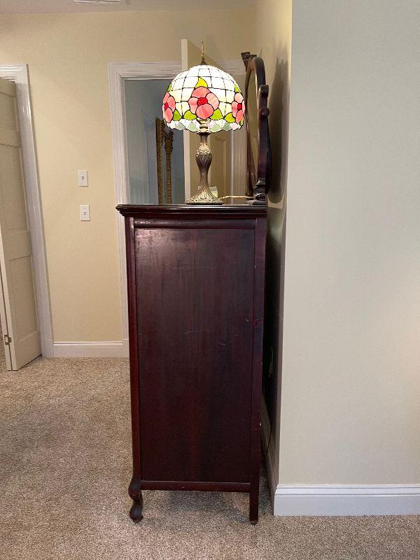 Tall Antique Dresser With Attached Mirror and Tiffany Style Lamp.