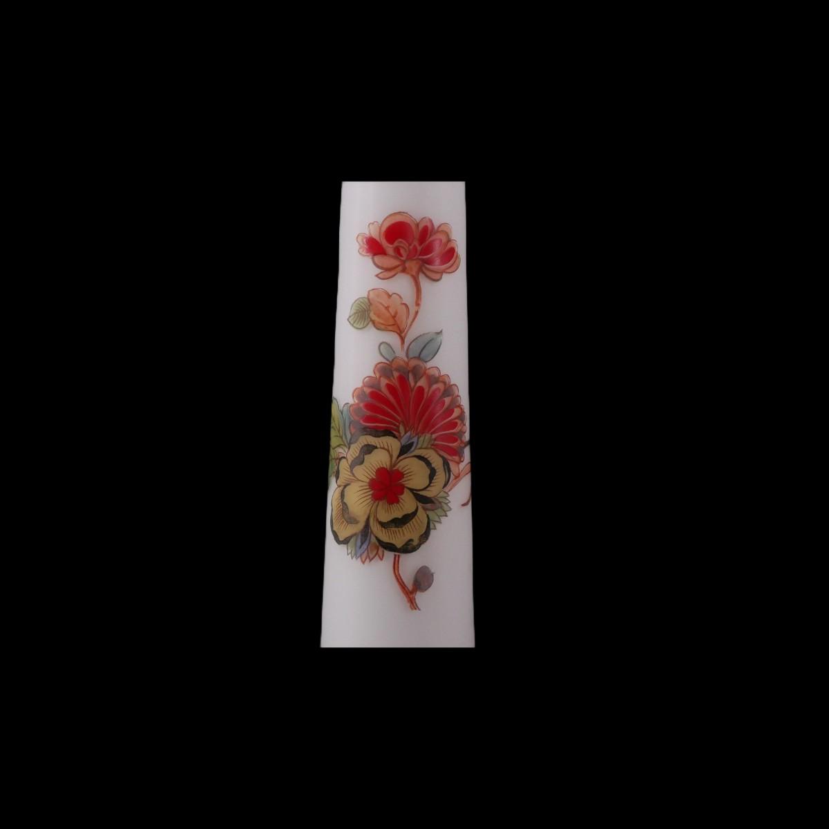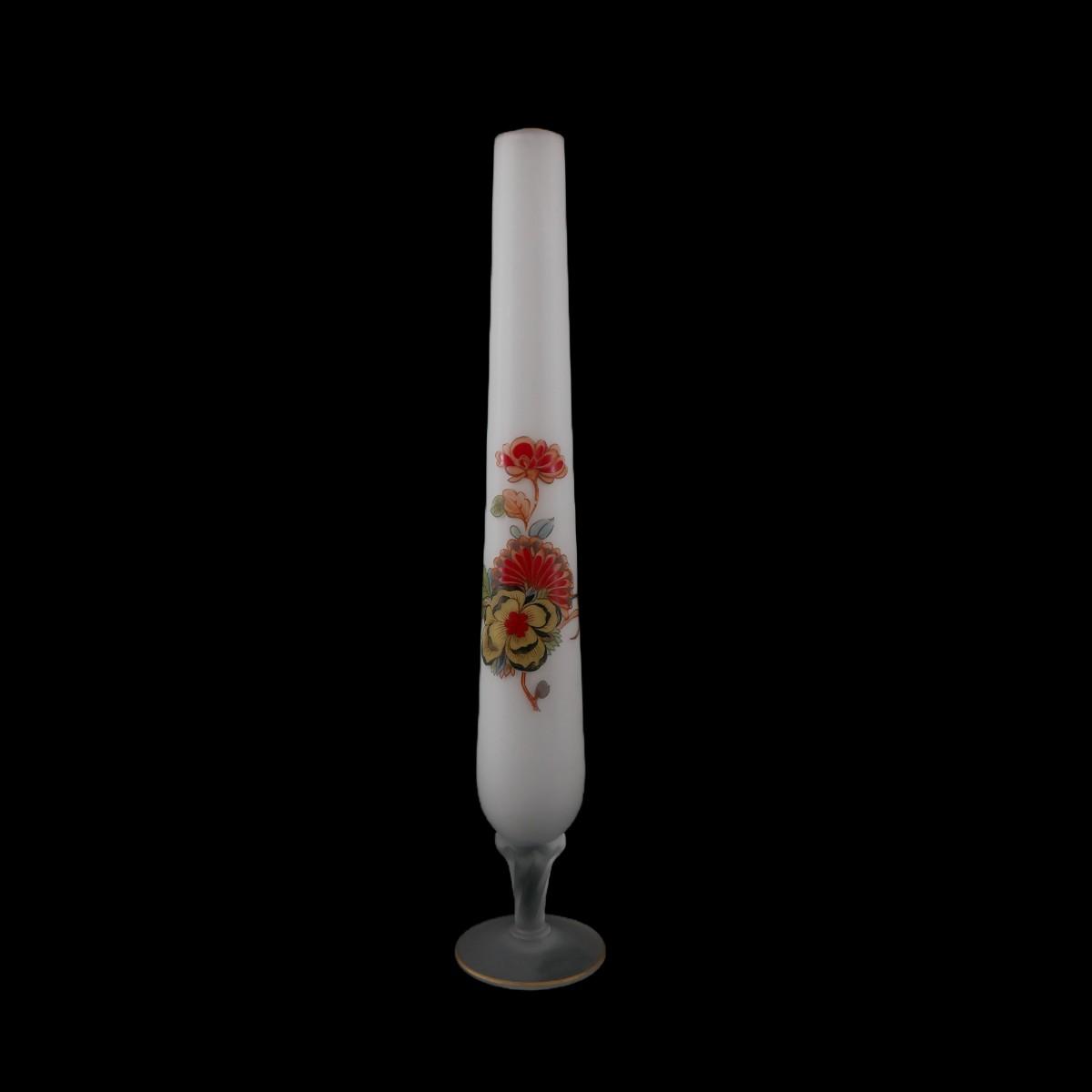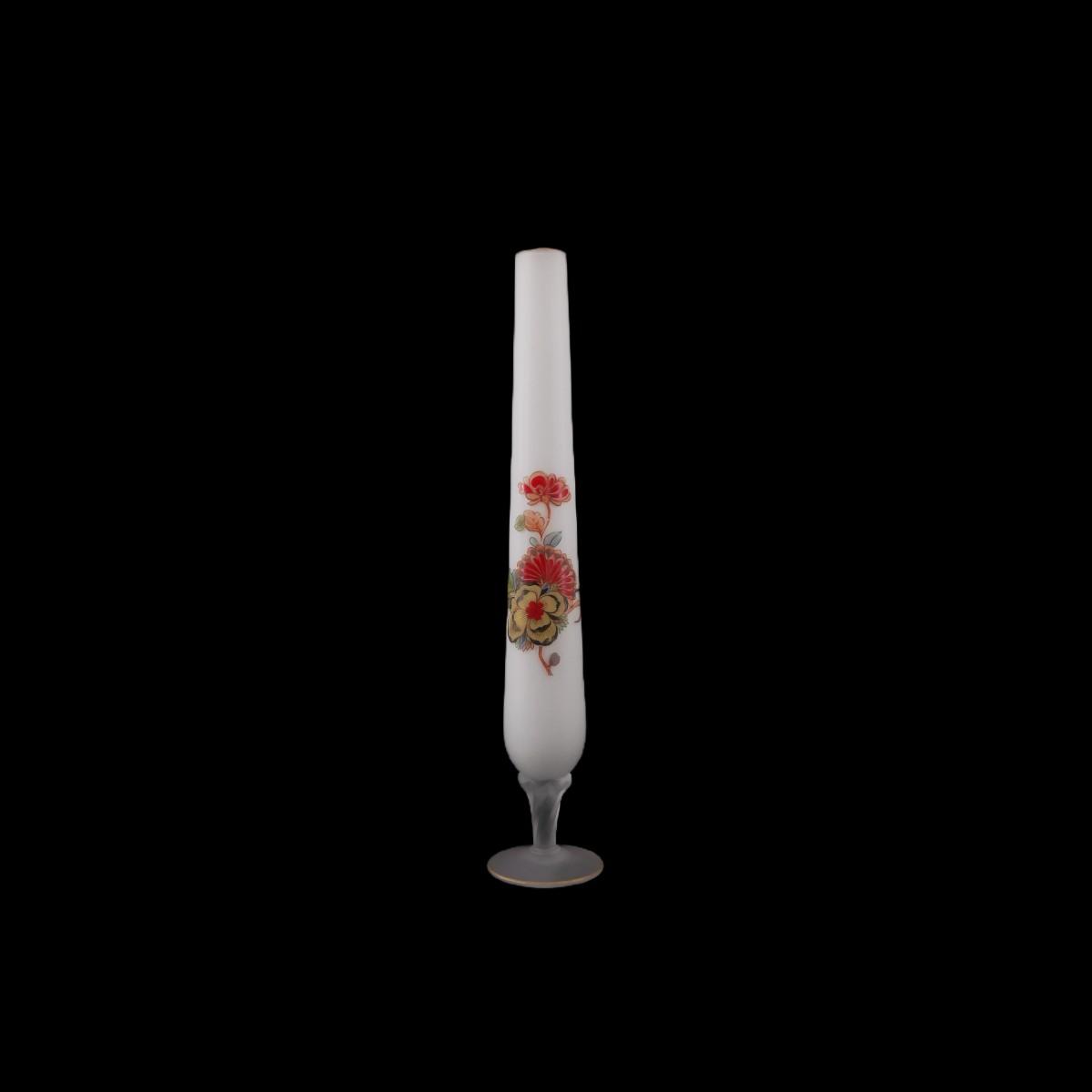 Tall Asian inspired satin glass vase. Beautiful twisted pedestal and slim, intriguing design. Small marks on side (see photo), excellent condition! Measures L 3" base x H 15.25", weighs 12 oz. (D76)