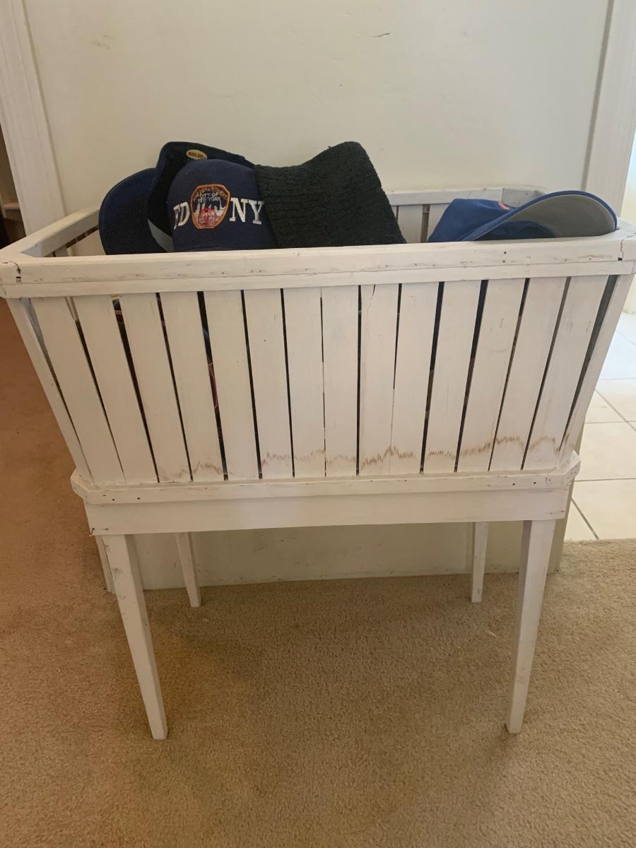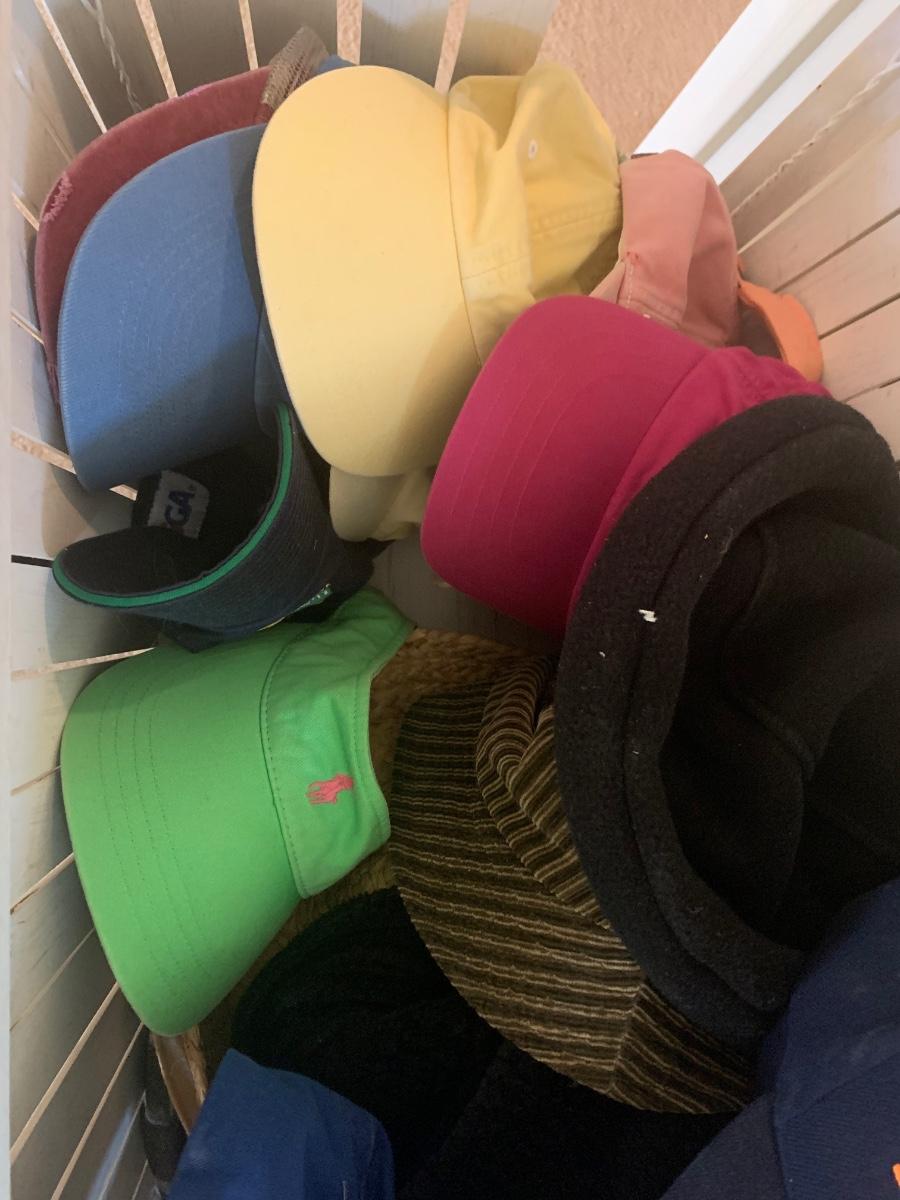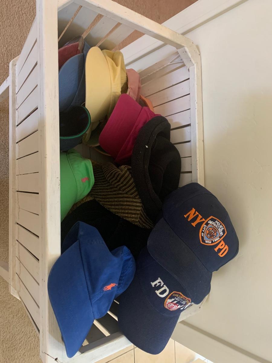 Charter Club, Nike, Brooks, Polo, straw hats, US Open, NYPD, FDNY in wooden basket on legs (some slots missing)