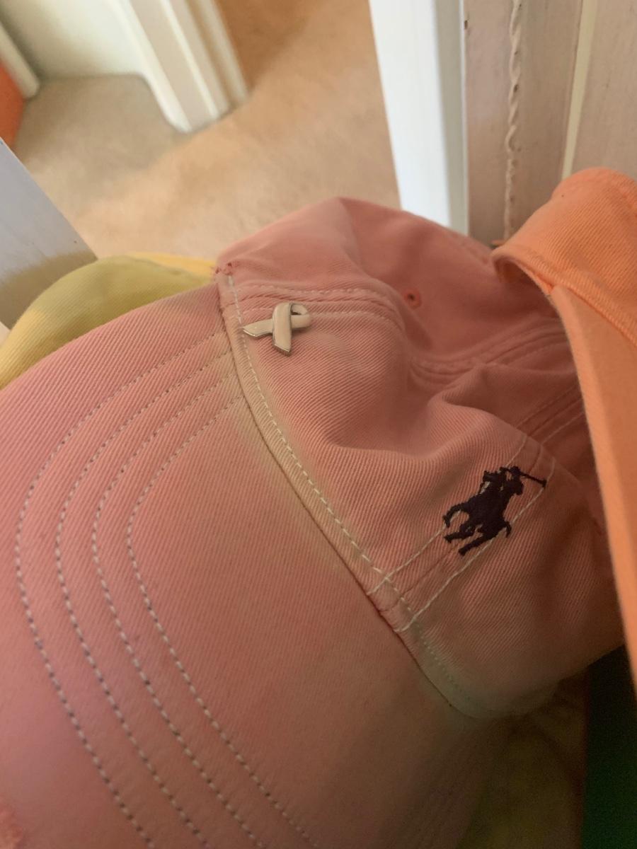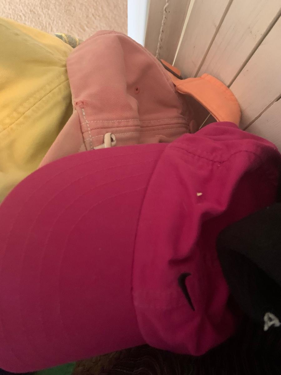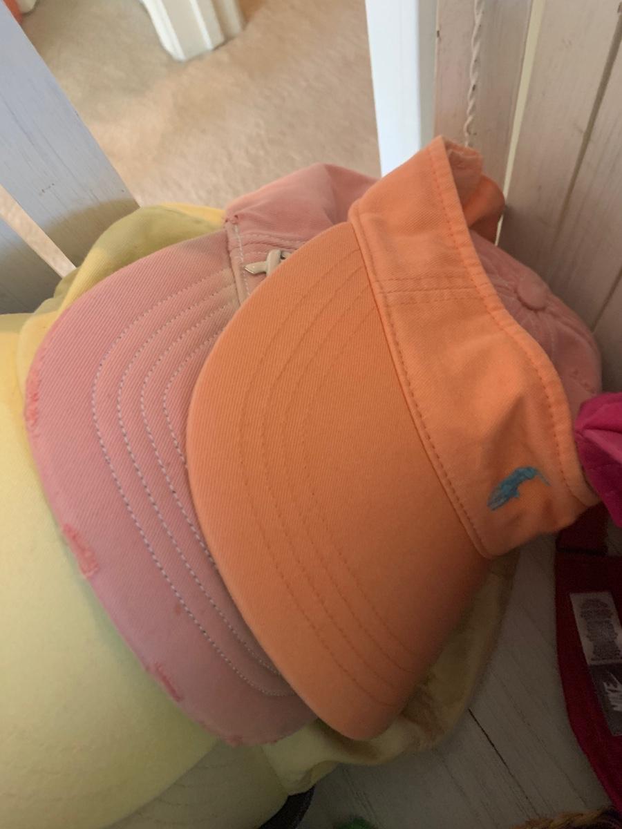 Charter Club, Nike, Brooks, Polo, straw hats, US Open, NYPD, FDNY in wooden basket on legs (some slots missing)