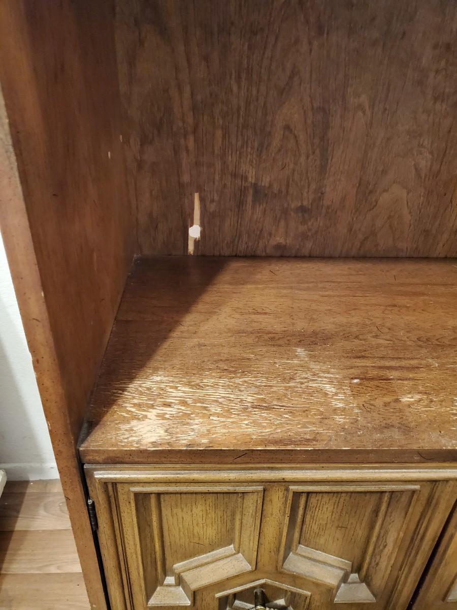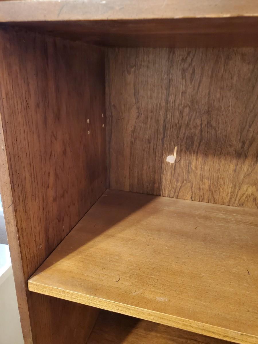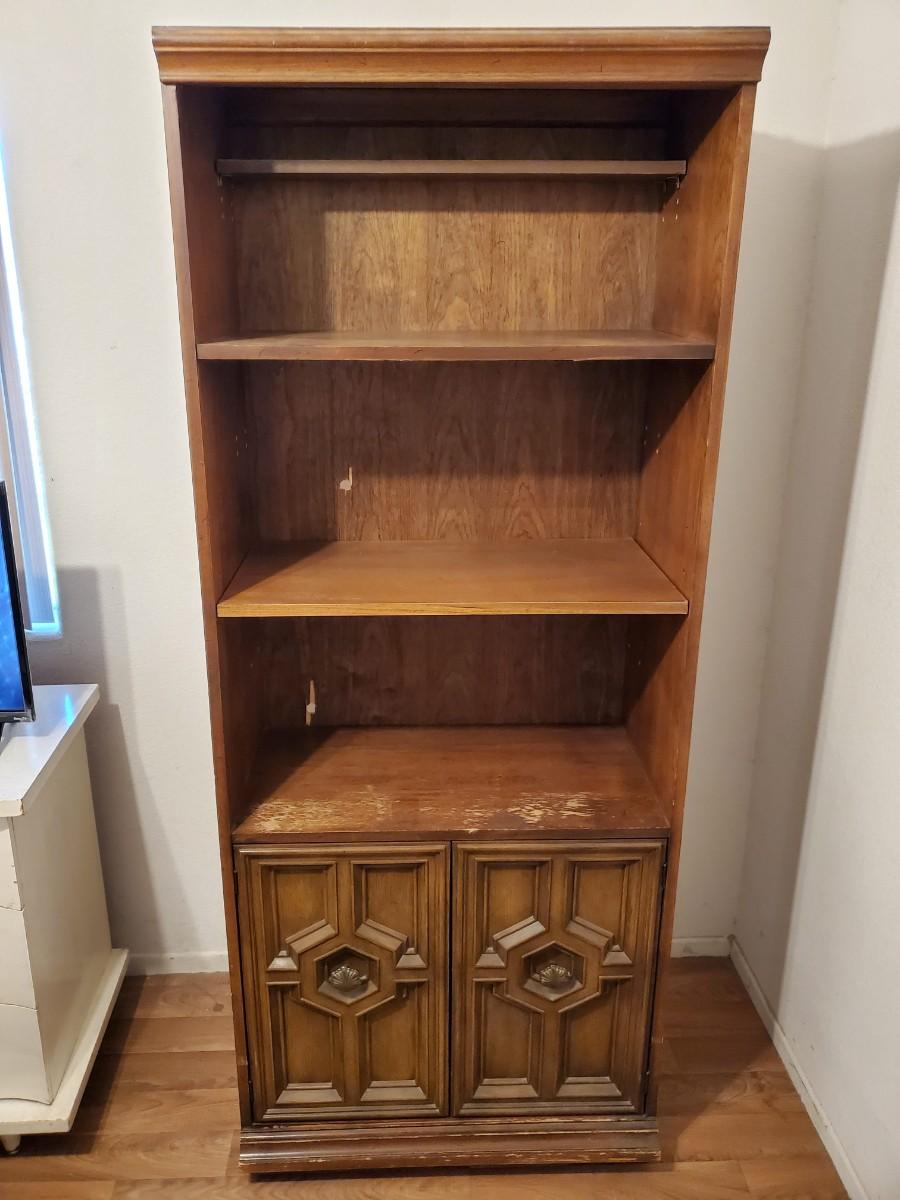 Tall sturdy bookcase. Has holes where electrical cords have been passed through for access to outlets. Enclosed cabinetry at bottom.