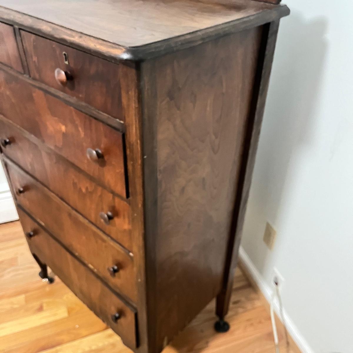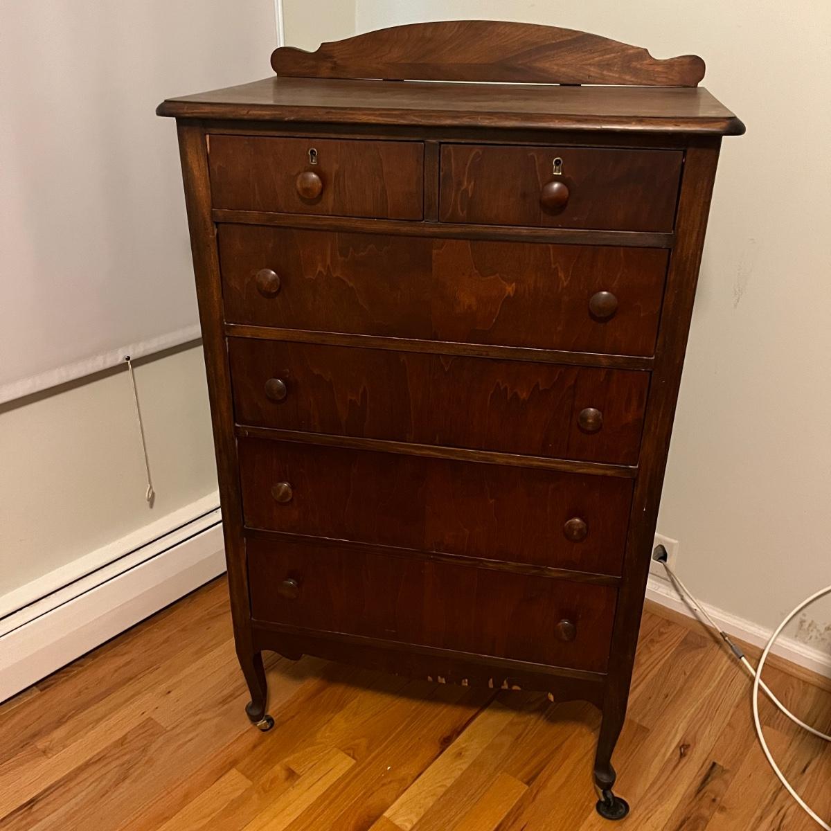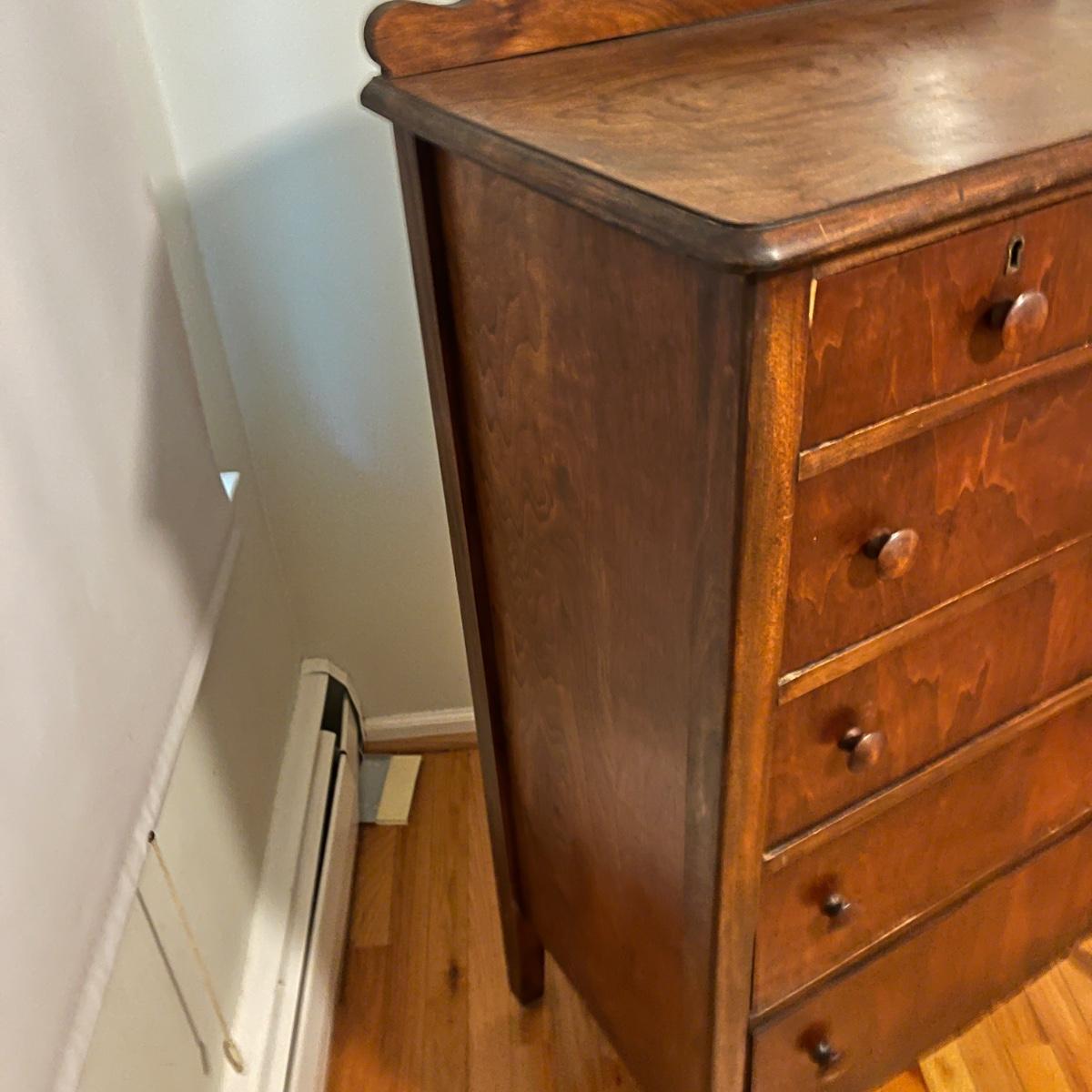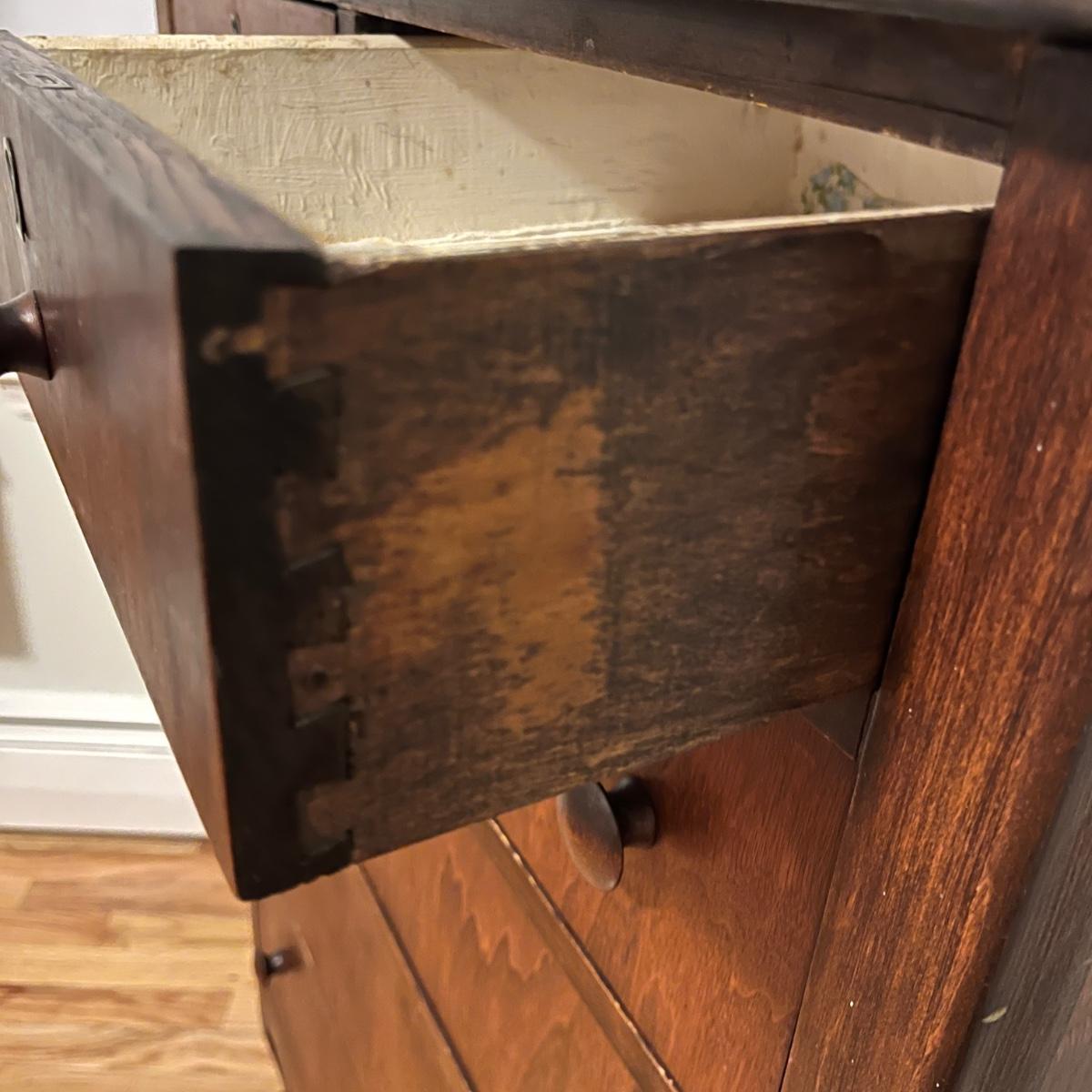 This tall boy chest of drawers has six dovetailed drawers with casters on the legs. Piece measures 30” x 18” x 51”H. Piece has some veneer missing, see pictures. No key is included.