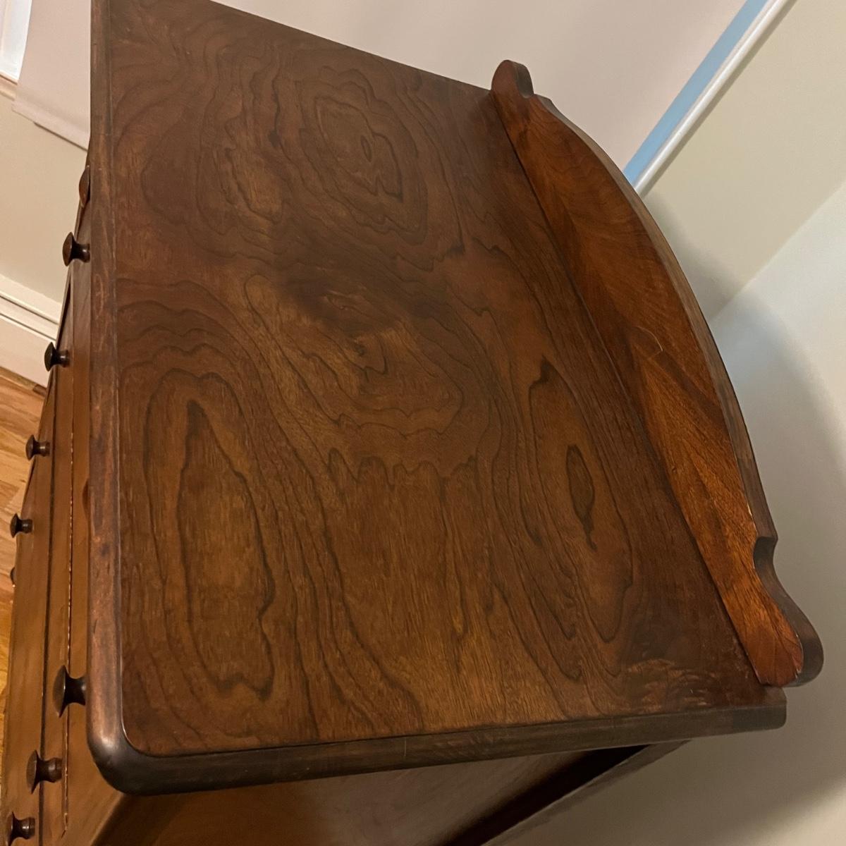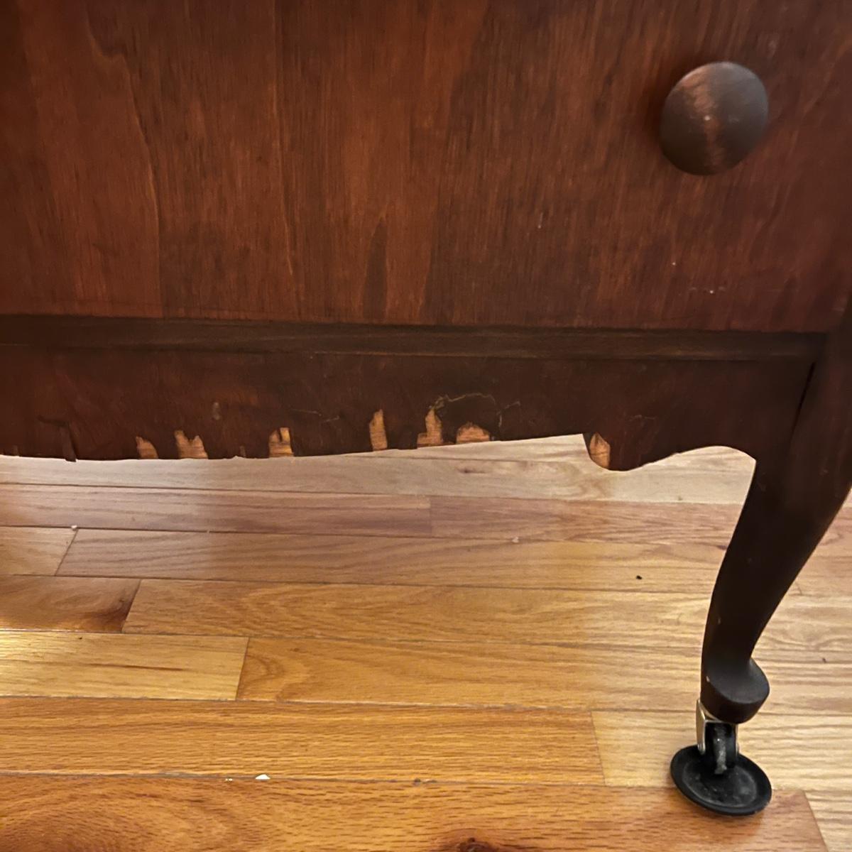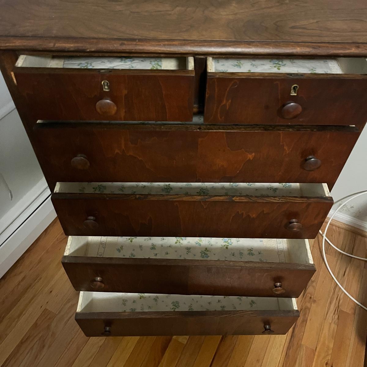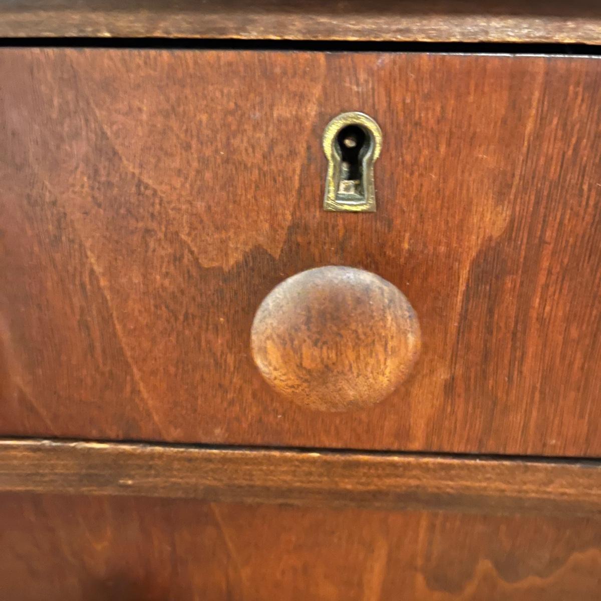 This tall boy chest of drawers has six dovetailed drawers with casters on the legs. Piece measures 30” x 18” x 51”H. Piece has some veneer missing, see pictures. No key is included.
