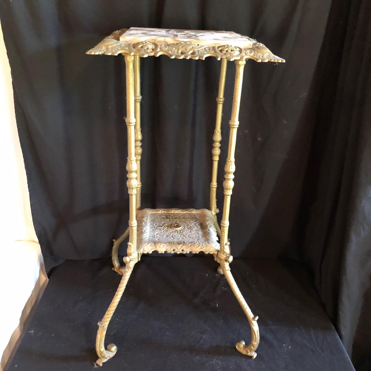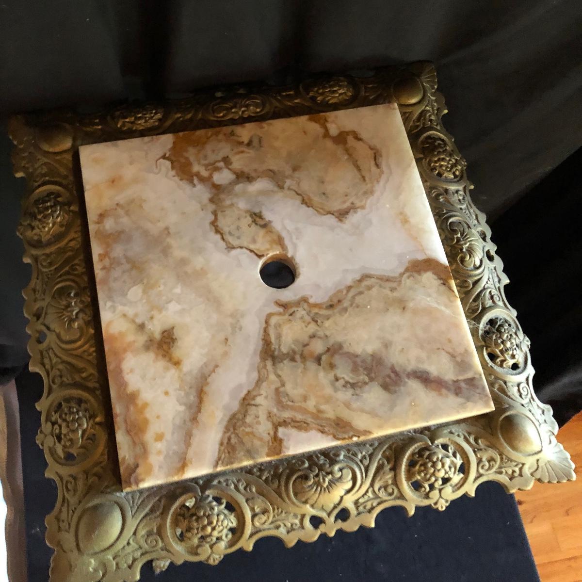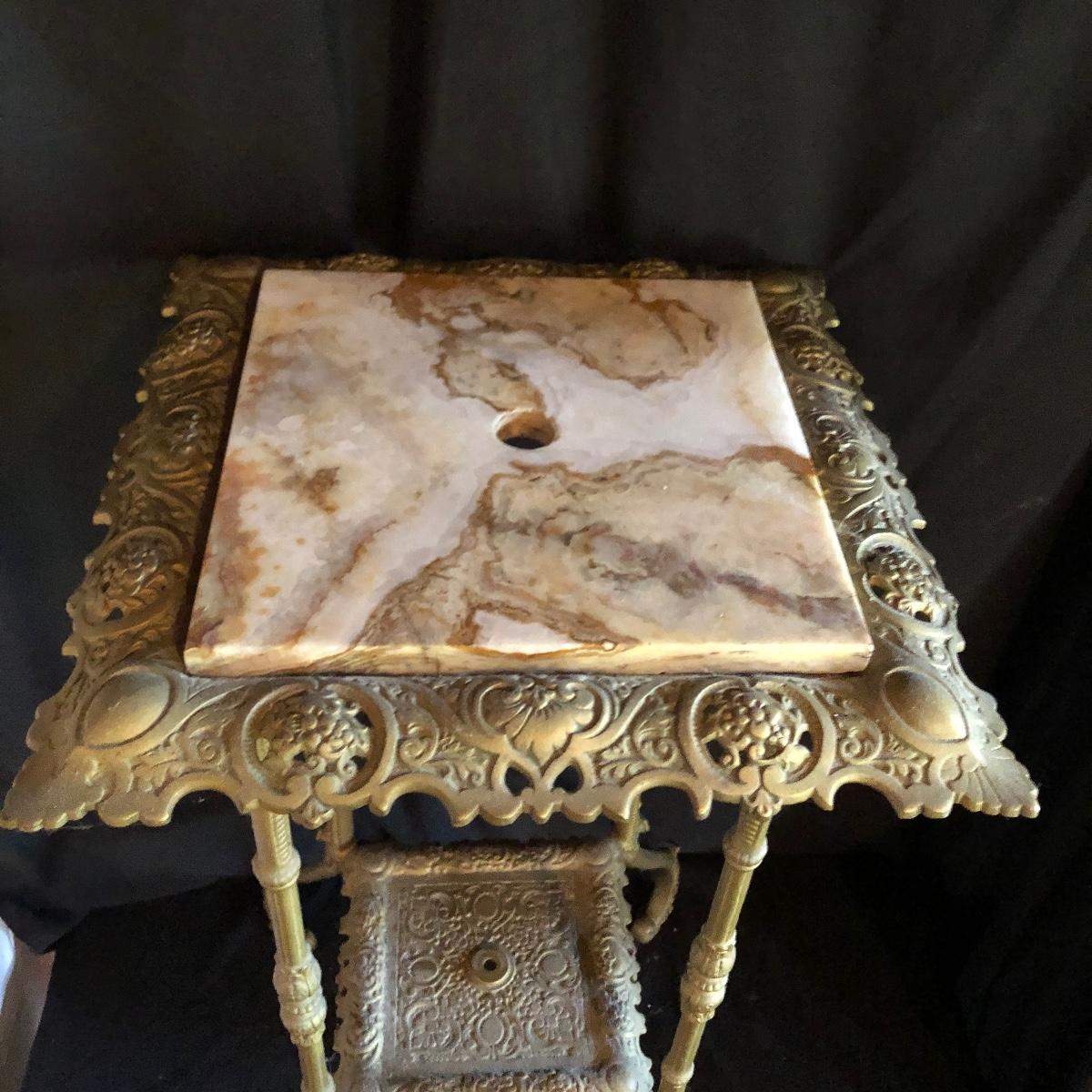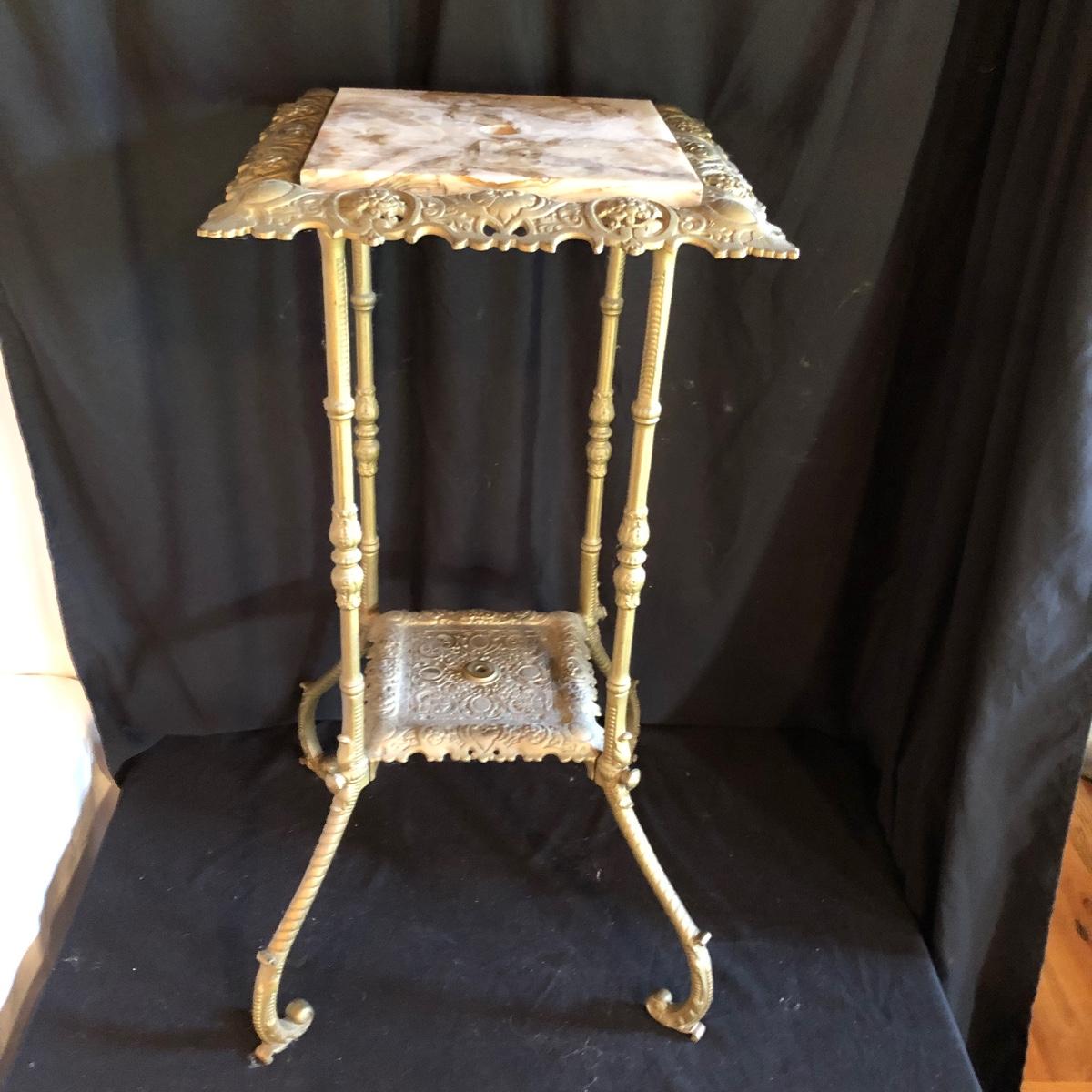 Lot includes tall brass stand with stone top. Stand has removable stone with hole in middle and a shelf underneath with a hole in middle. Stand measures 16” x 16” x 30”.
