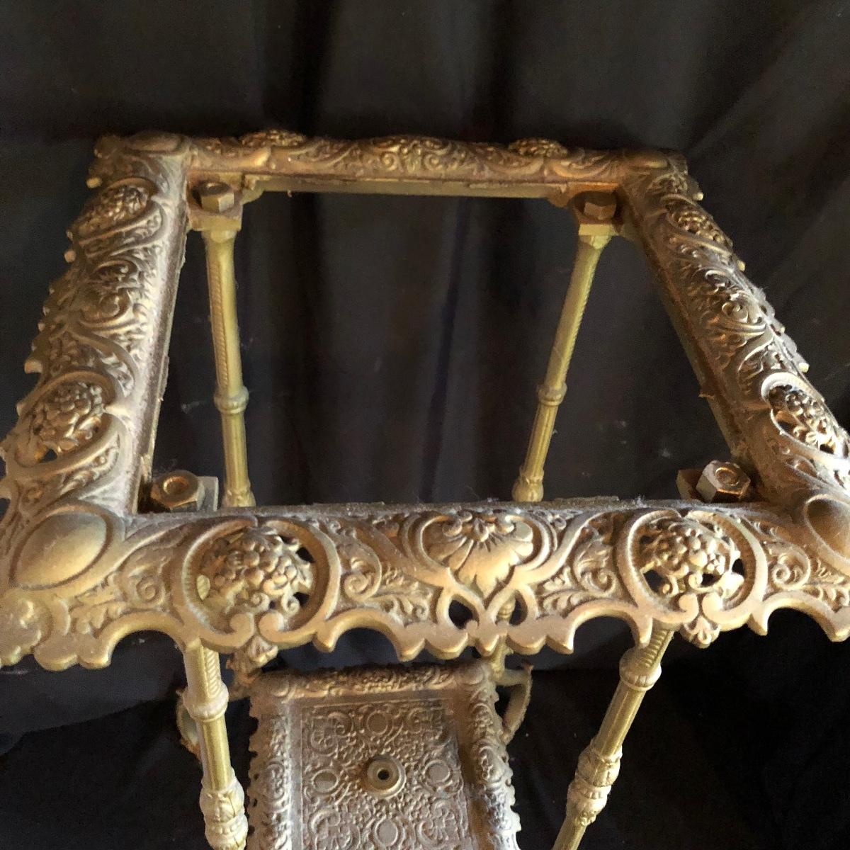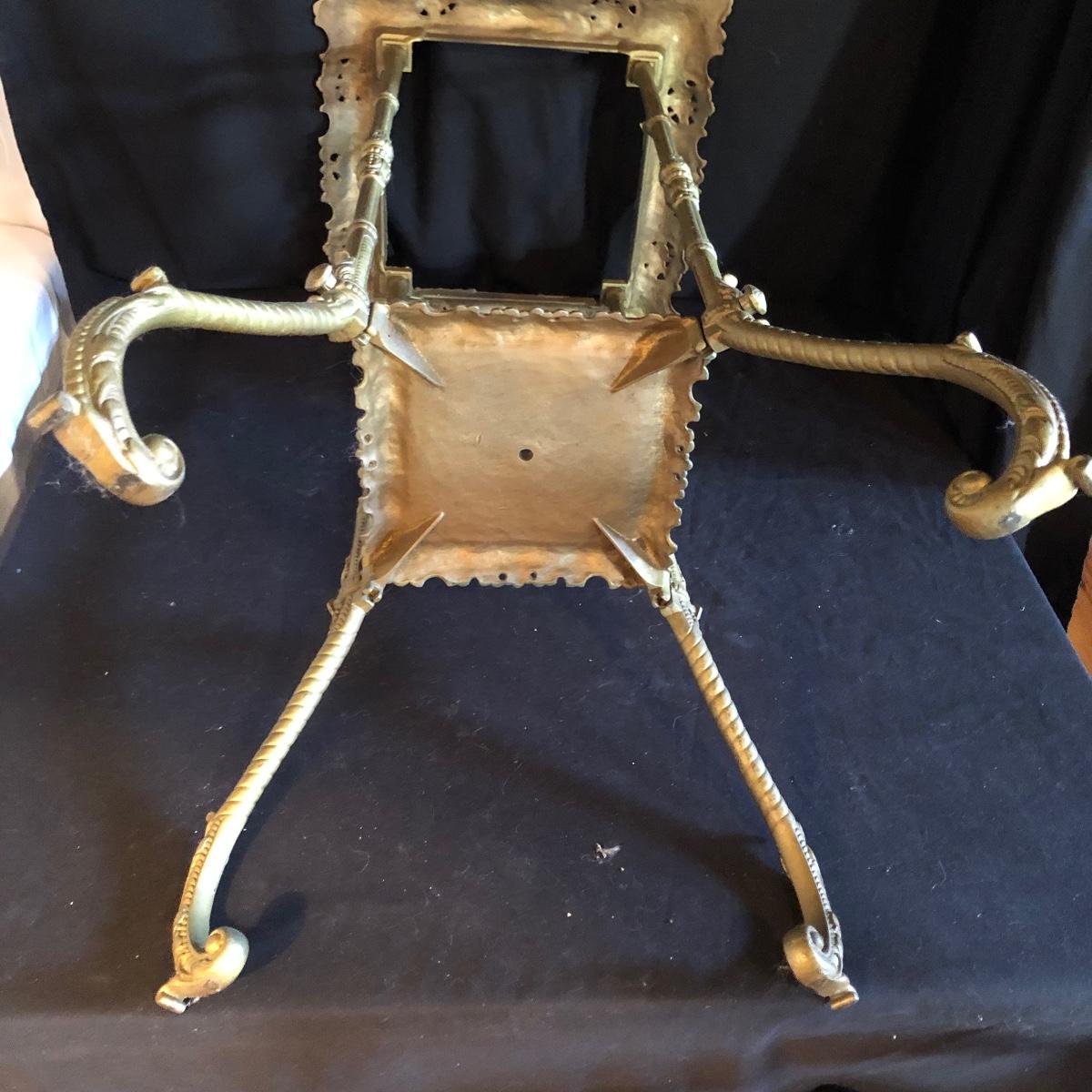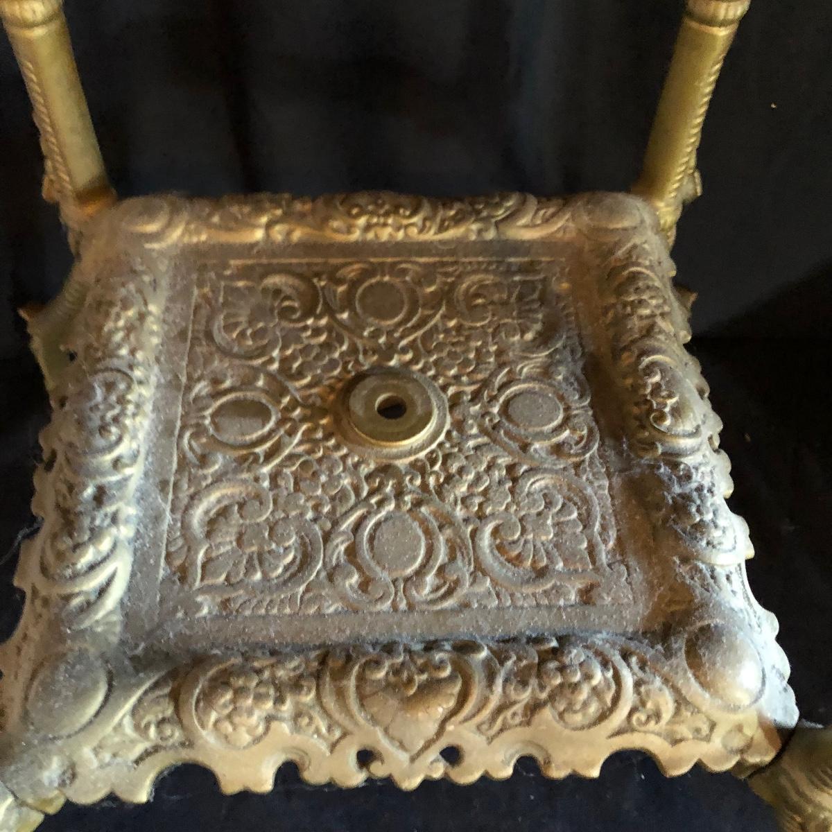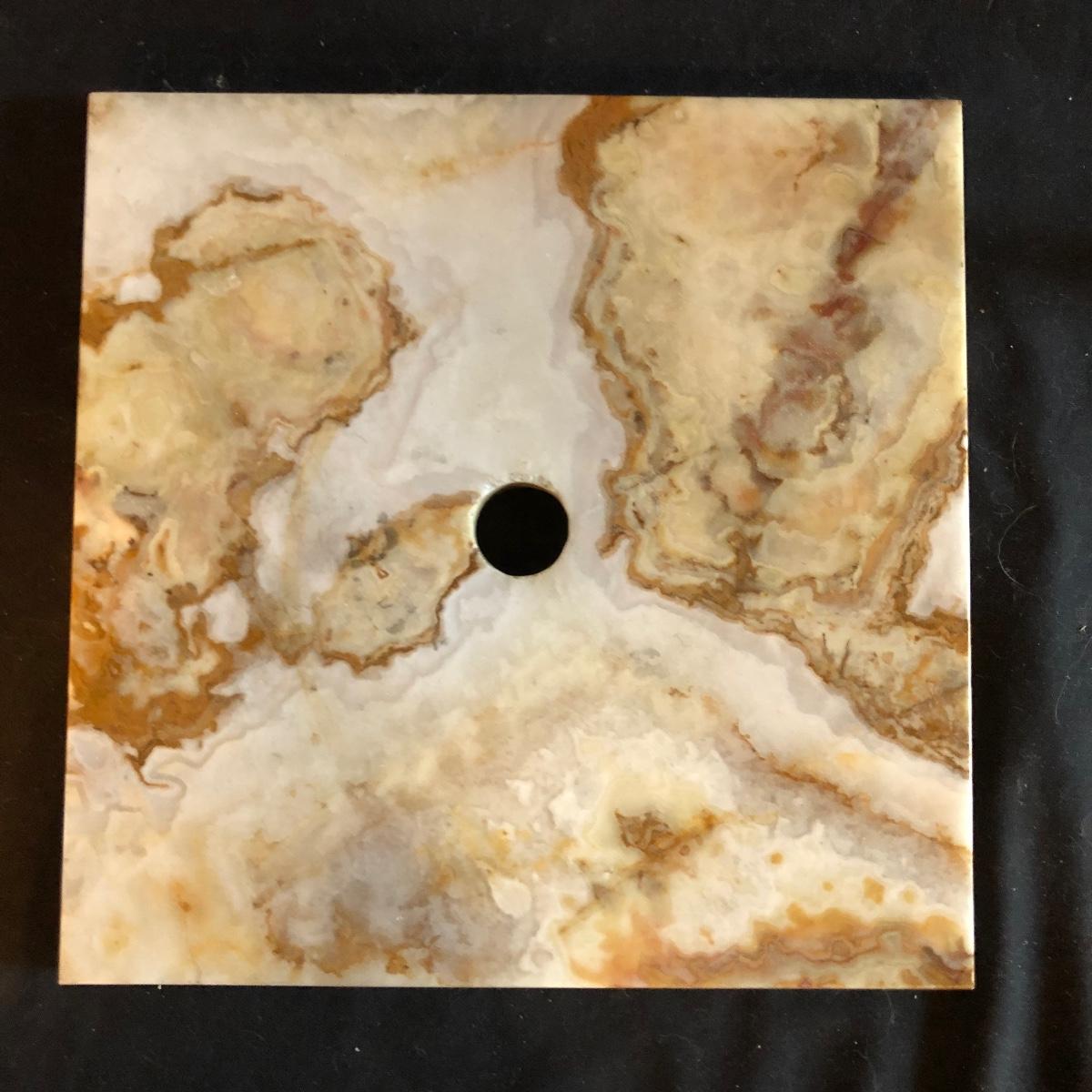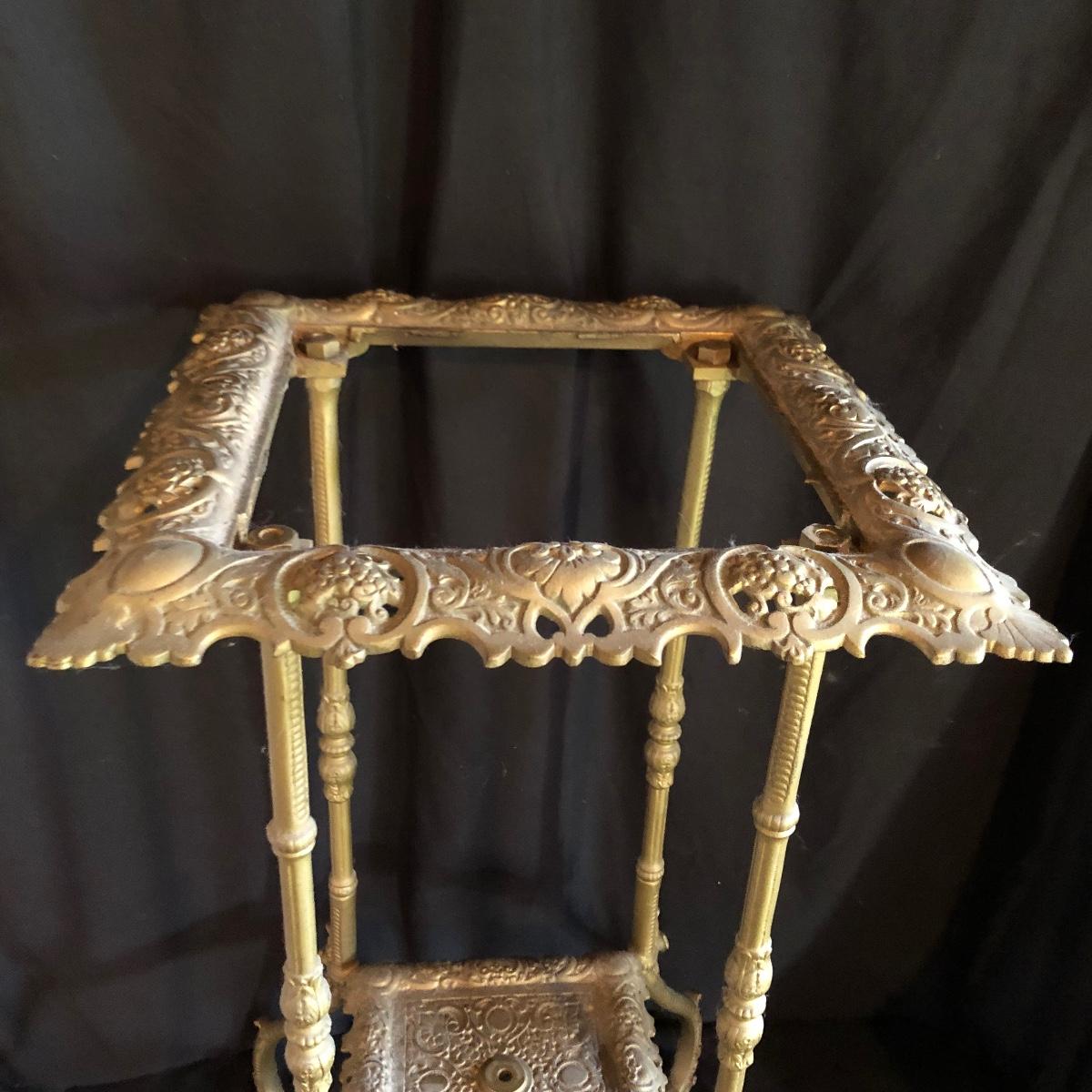 Lot includes tall brass stand with stone top. Stand has removable stone with hole in middle and a shelf underneath with a hole in middle. Stand measures 16” x 16” x 30”.