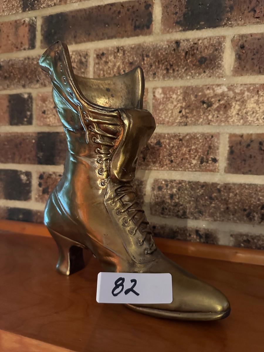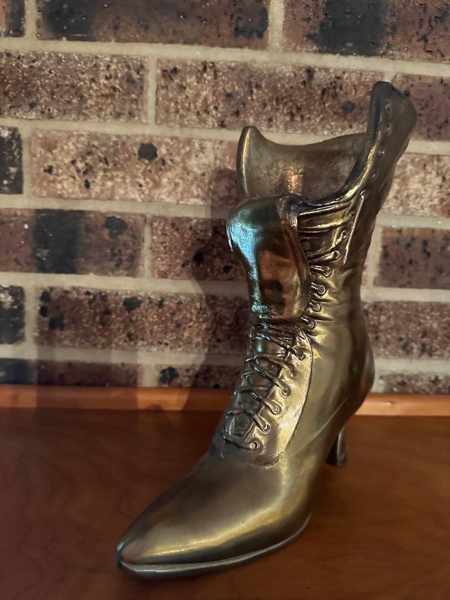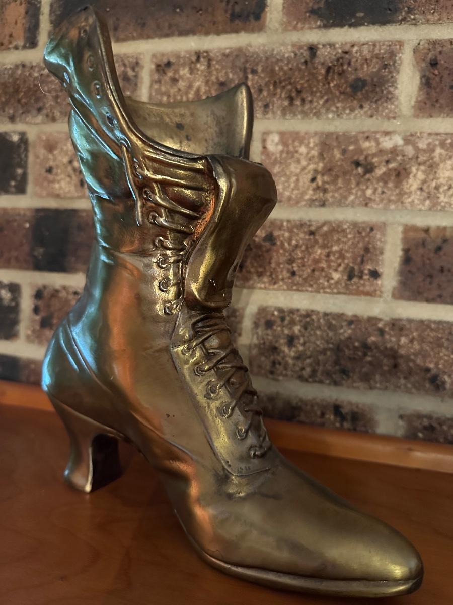 TALL BRASS VICTORIAN LACE UP BOOT PLANTER/VASE, AS PICTURED