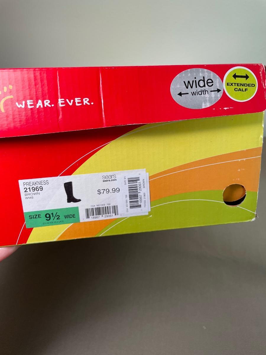 New brown Wear Ever brand 9.5 wide boots have stretch inset to fit larger calves.