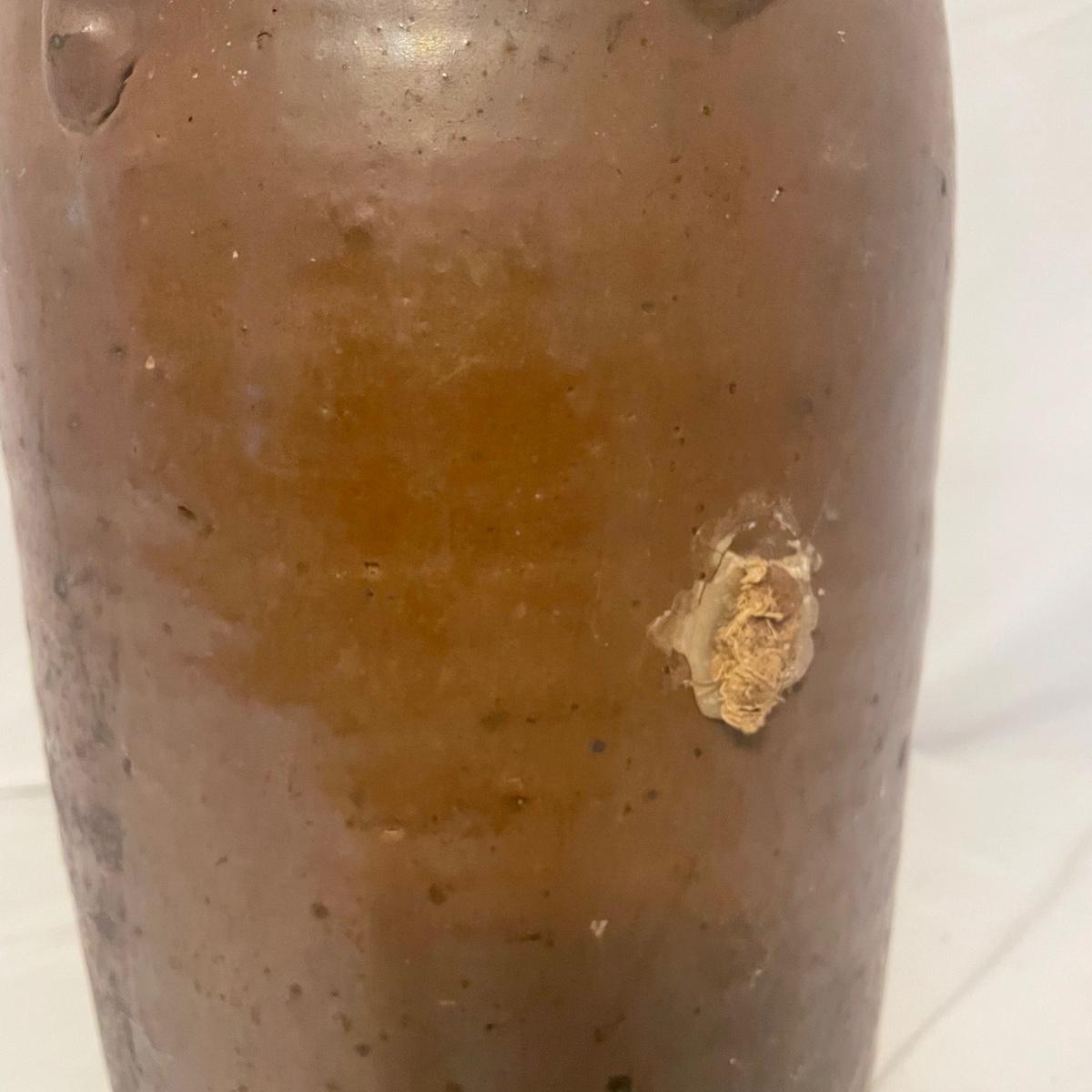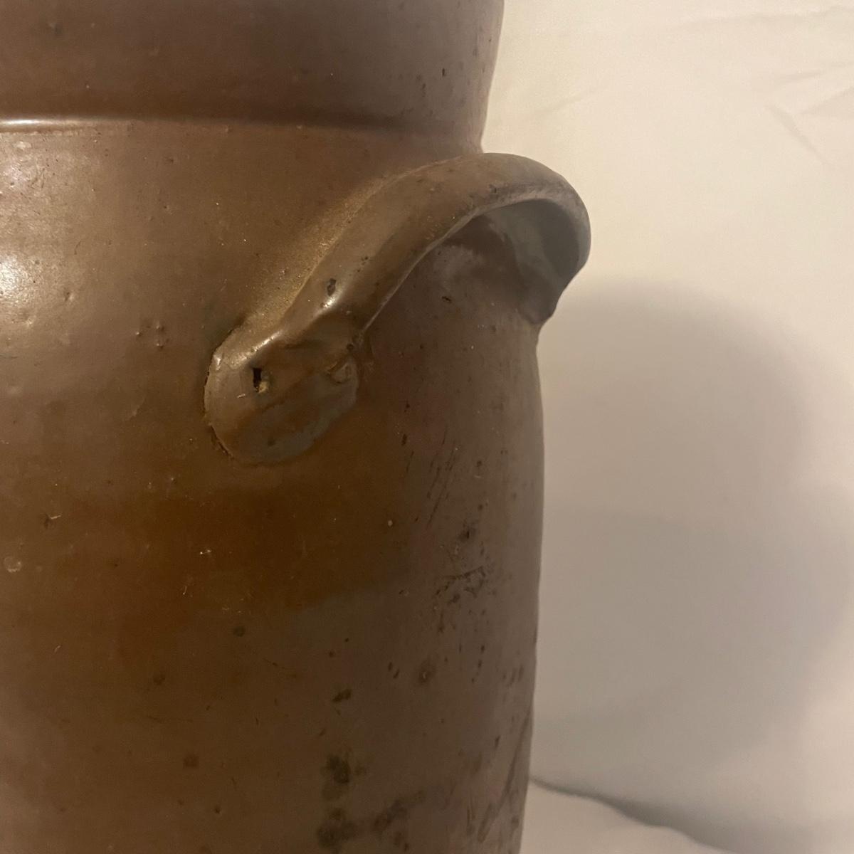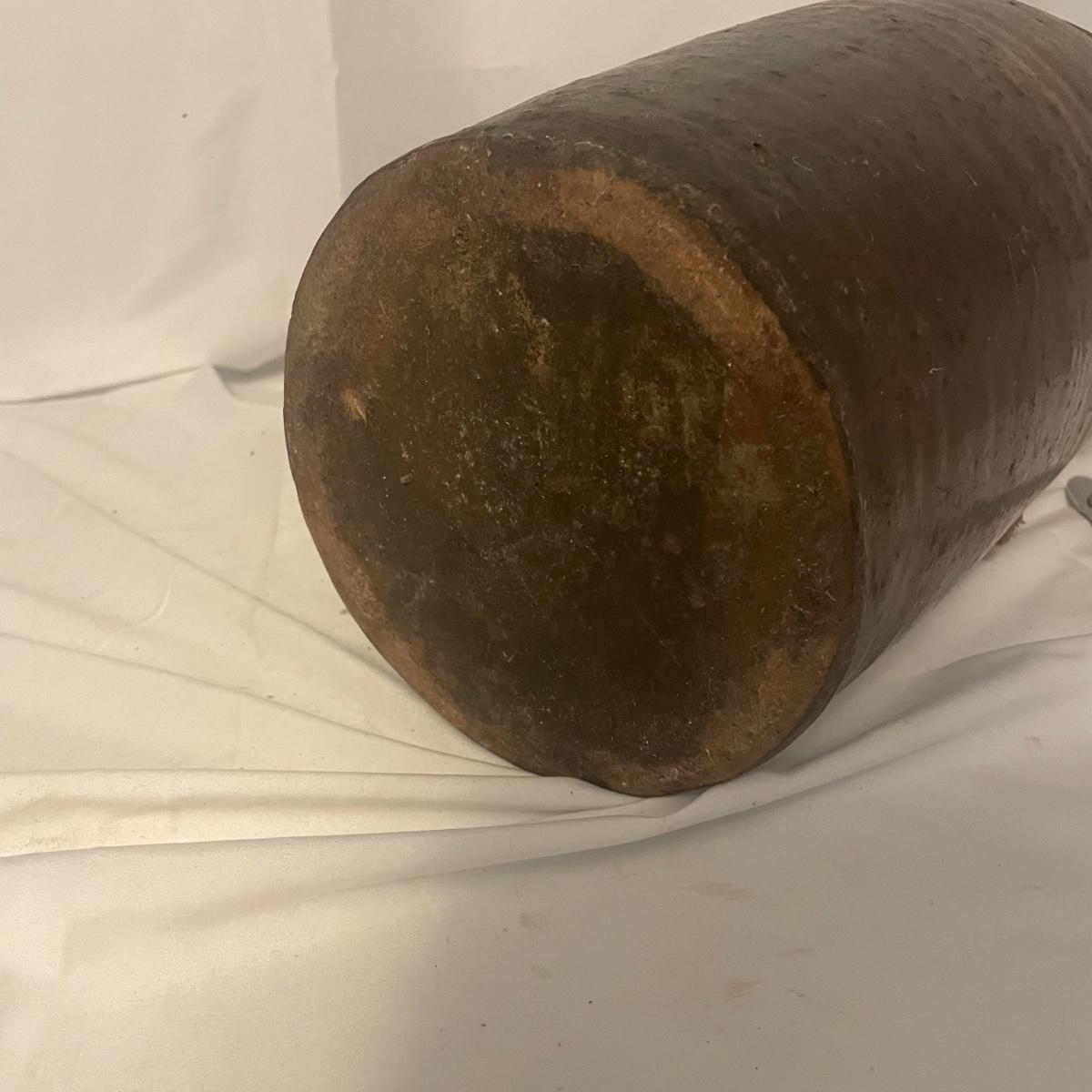 This slender tall brown stoneware crock is in very good condition with just one tiny chip in the rim, see image. There is an area of glue that should be removable with care.