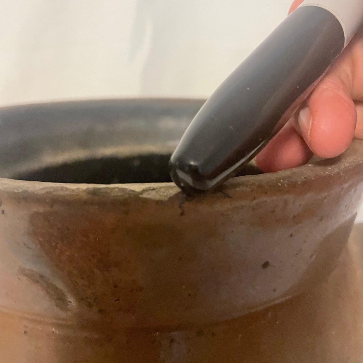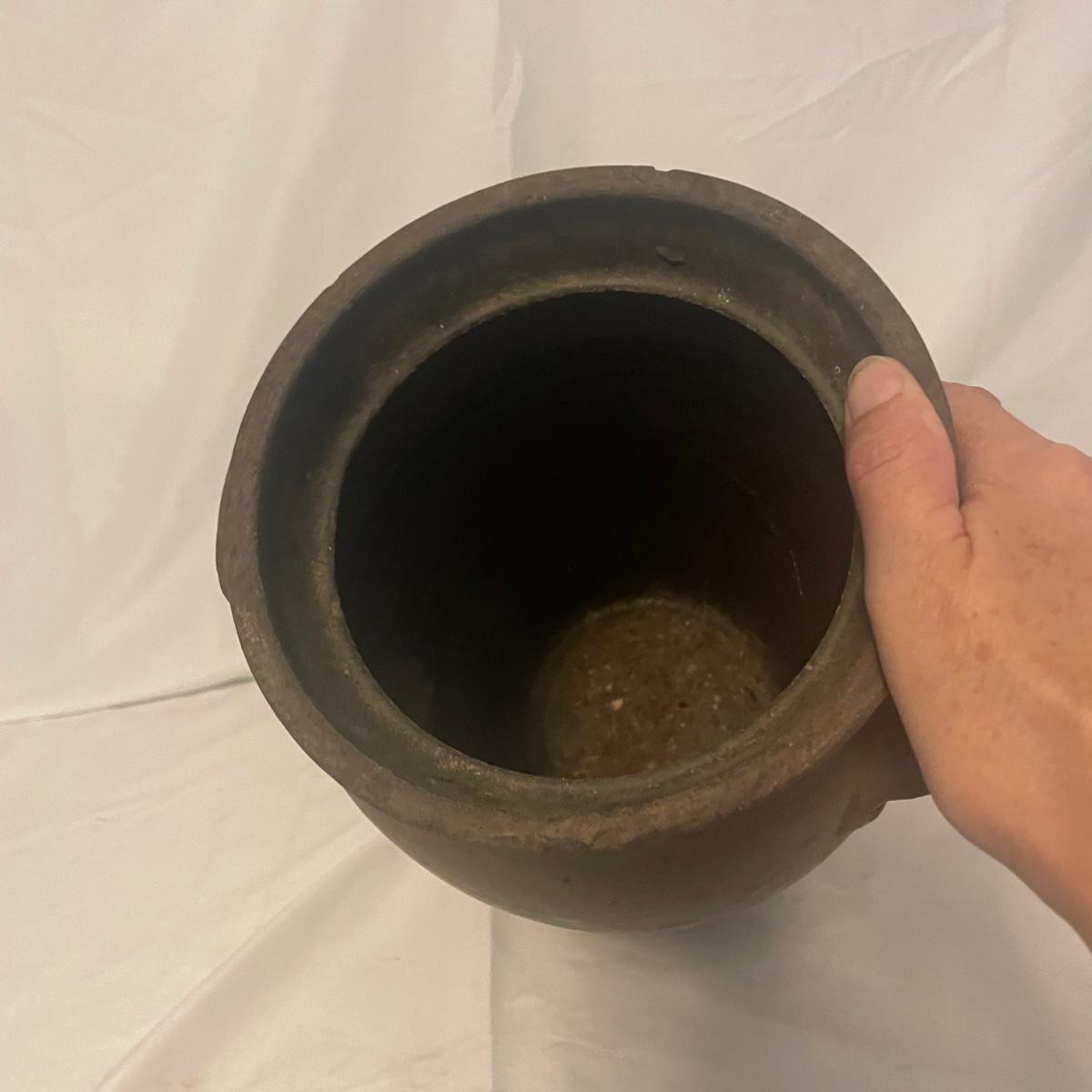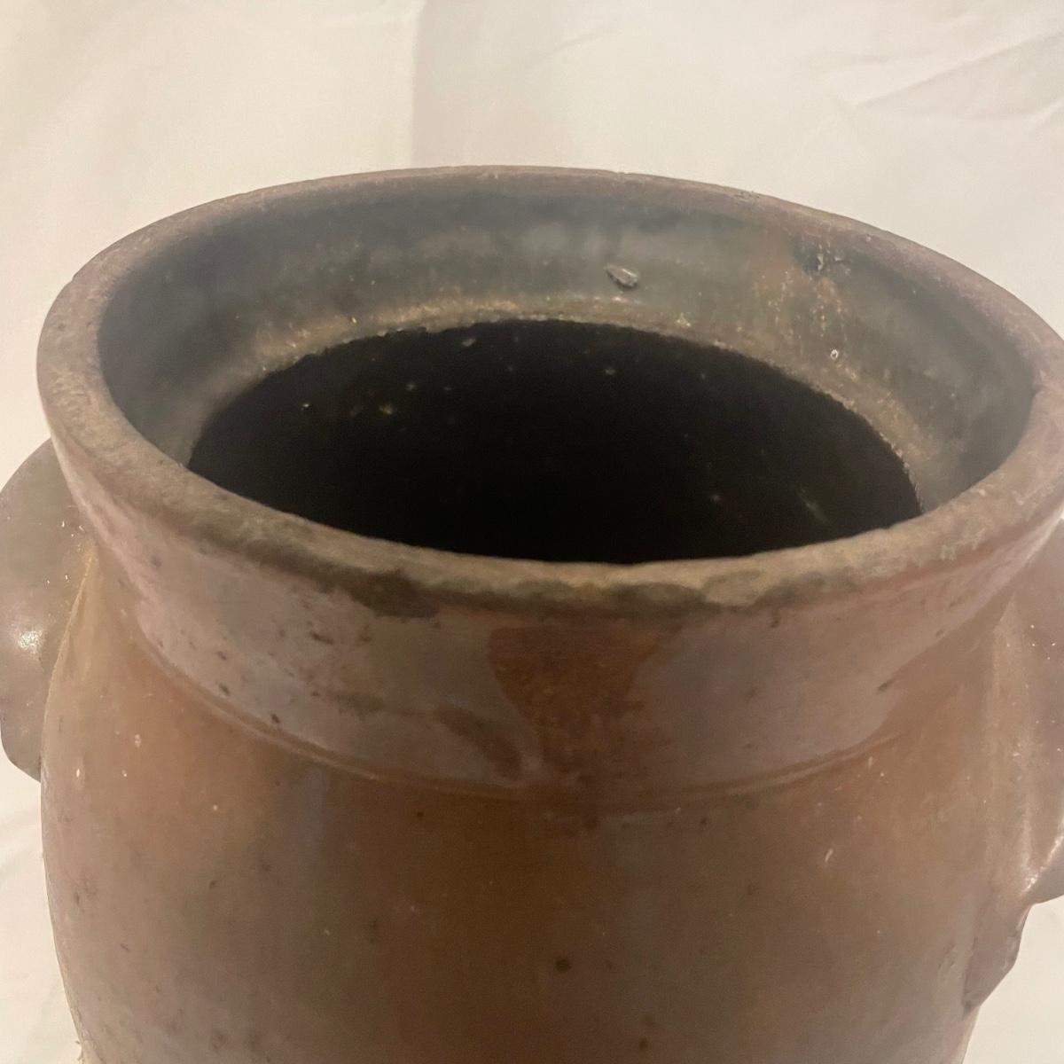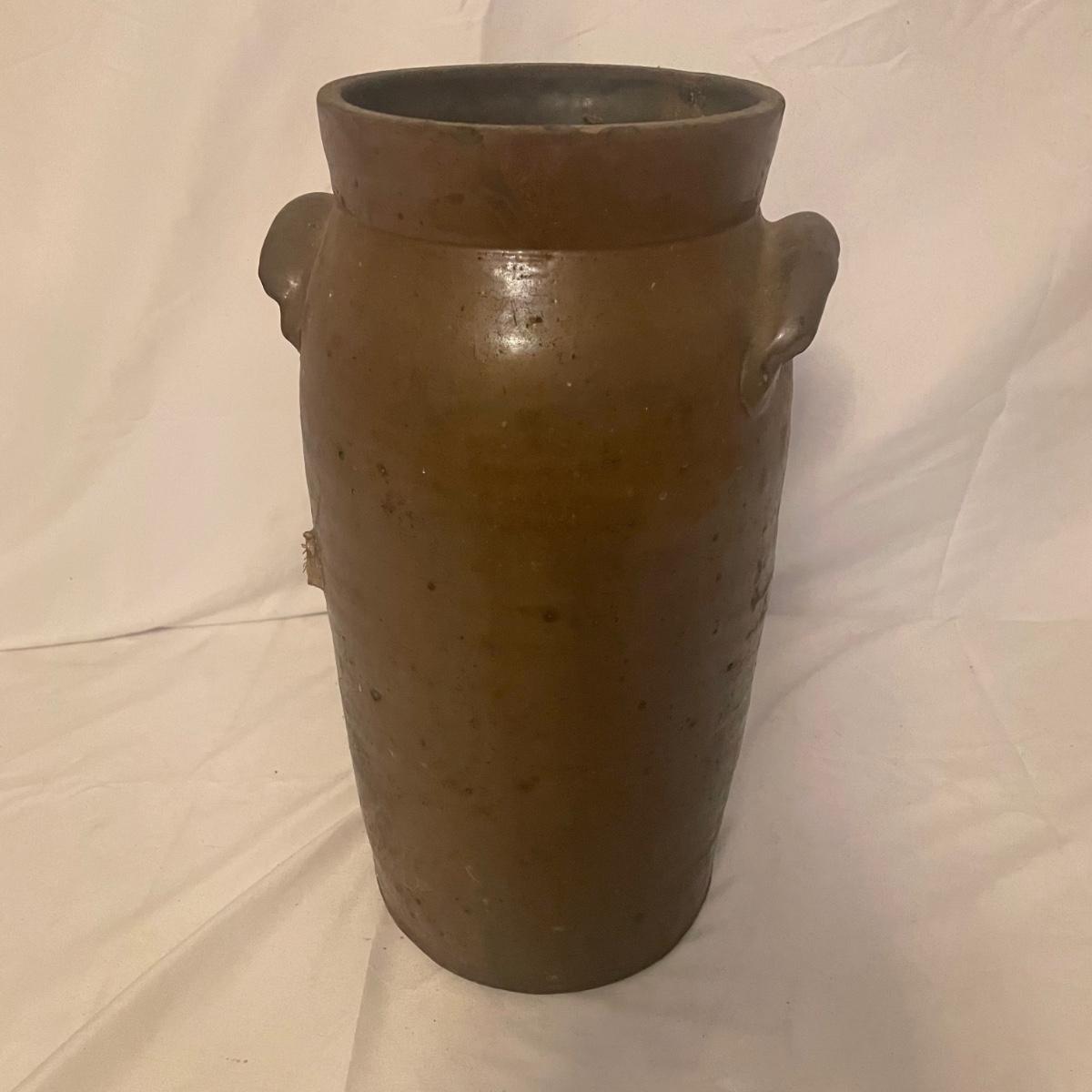 This slender tall brown stoneware crock is in very good condition with just one tiny chip in the rim, see image. There is an area of glue that should be removable with care.