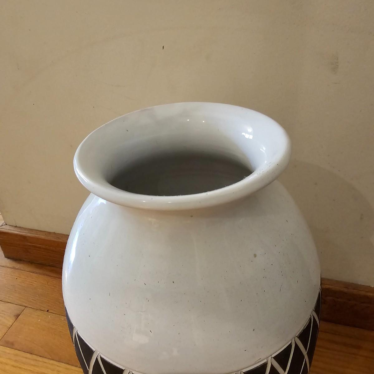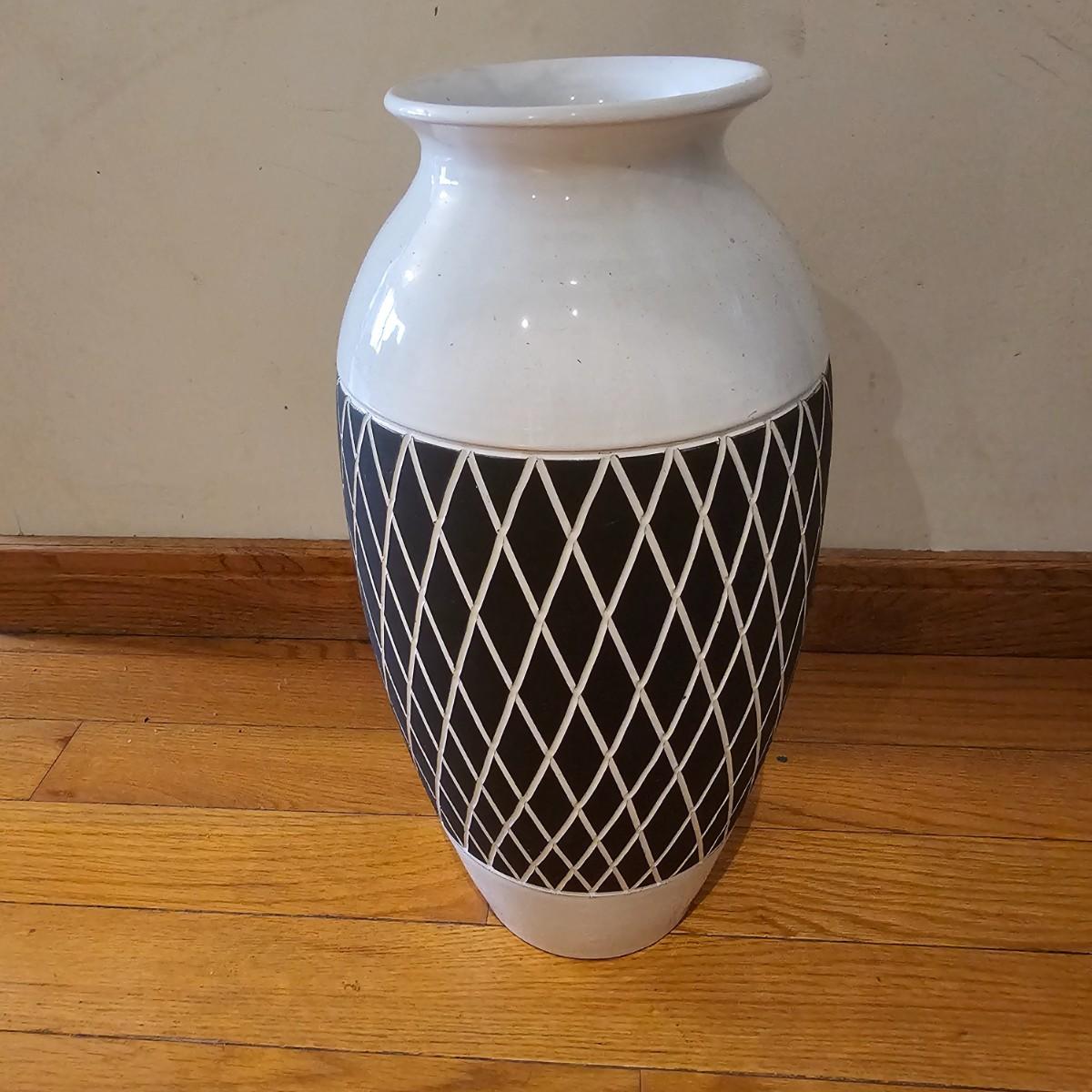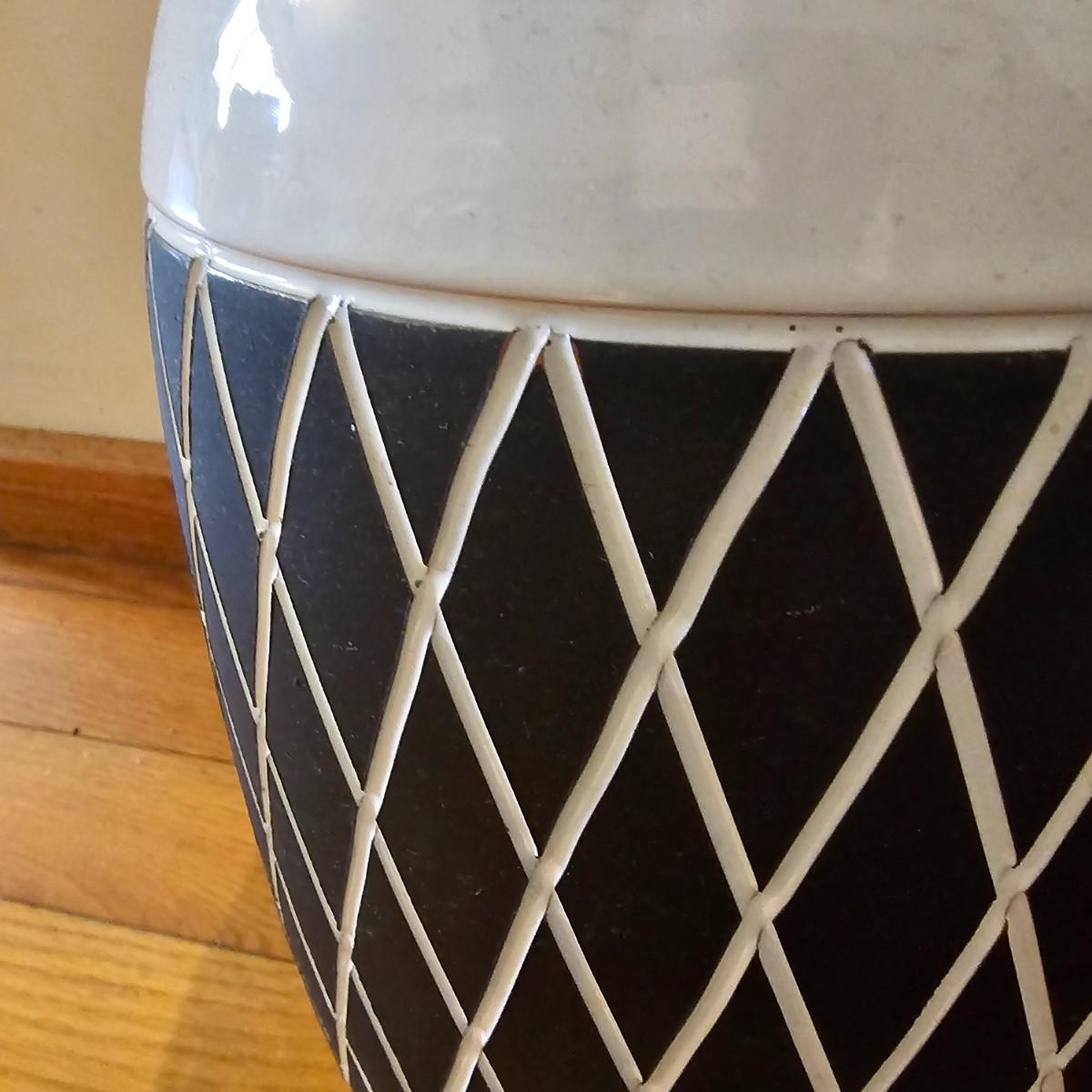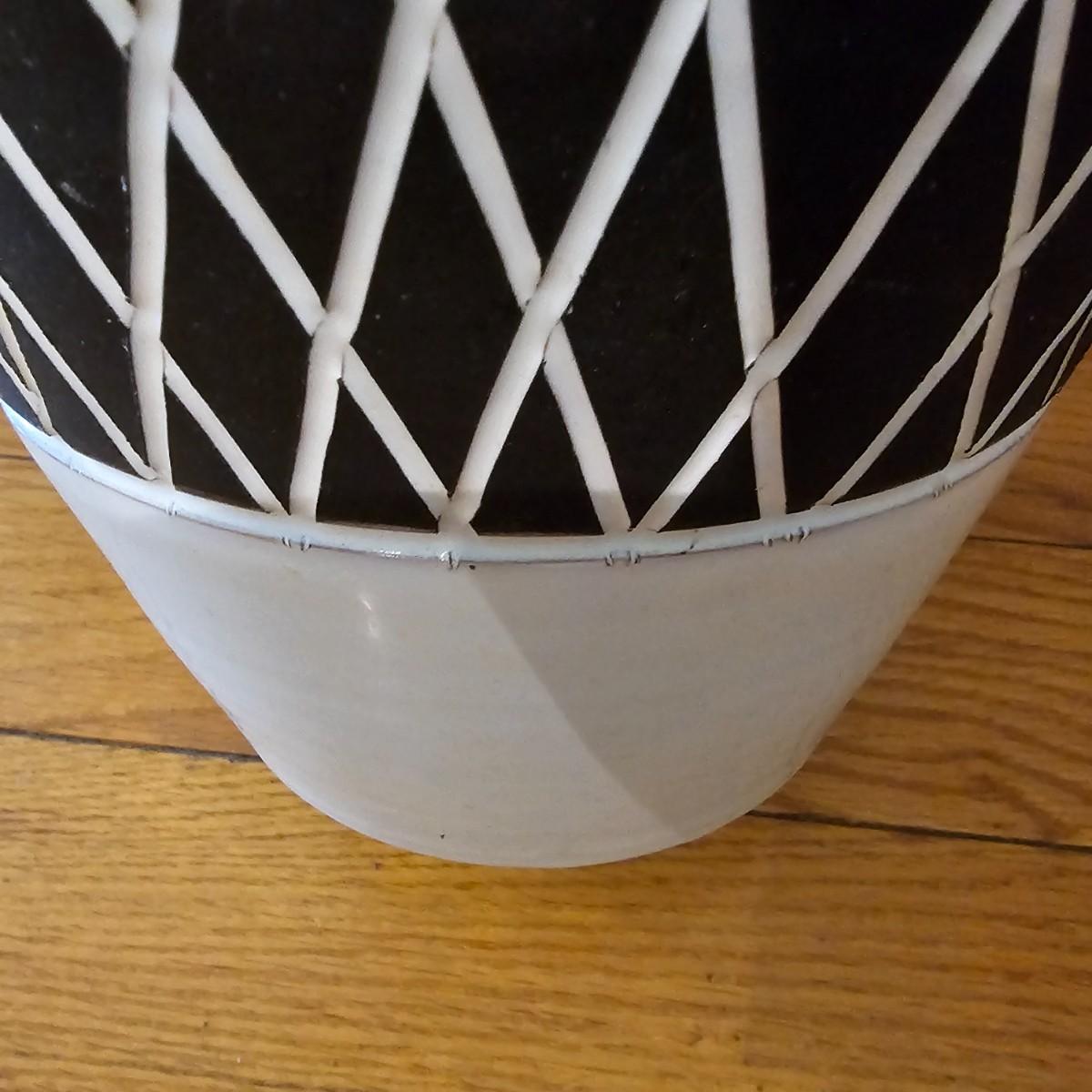 Contrasting colors of dark and light highlight this shapely urn. High gloss finishing white on top, bottom and inside, while criss cross design has matte look, lines are cut into the body of the piece. Vase measures 9"D x 18.5"H. Has one small blemish, may be a sticker residue. See photos for details. Local pickup only.