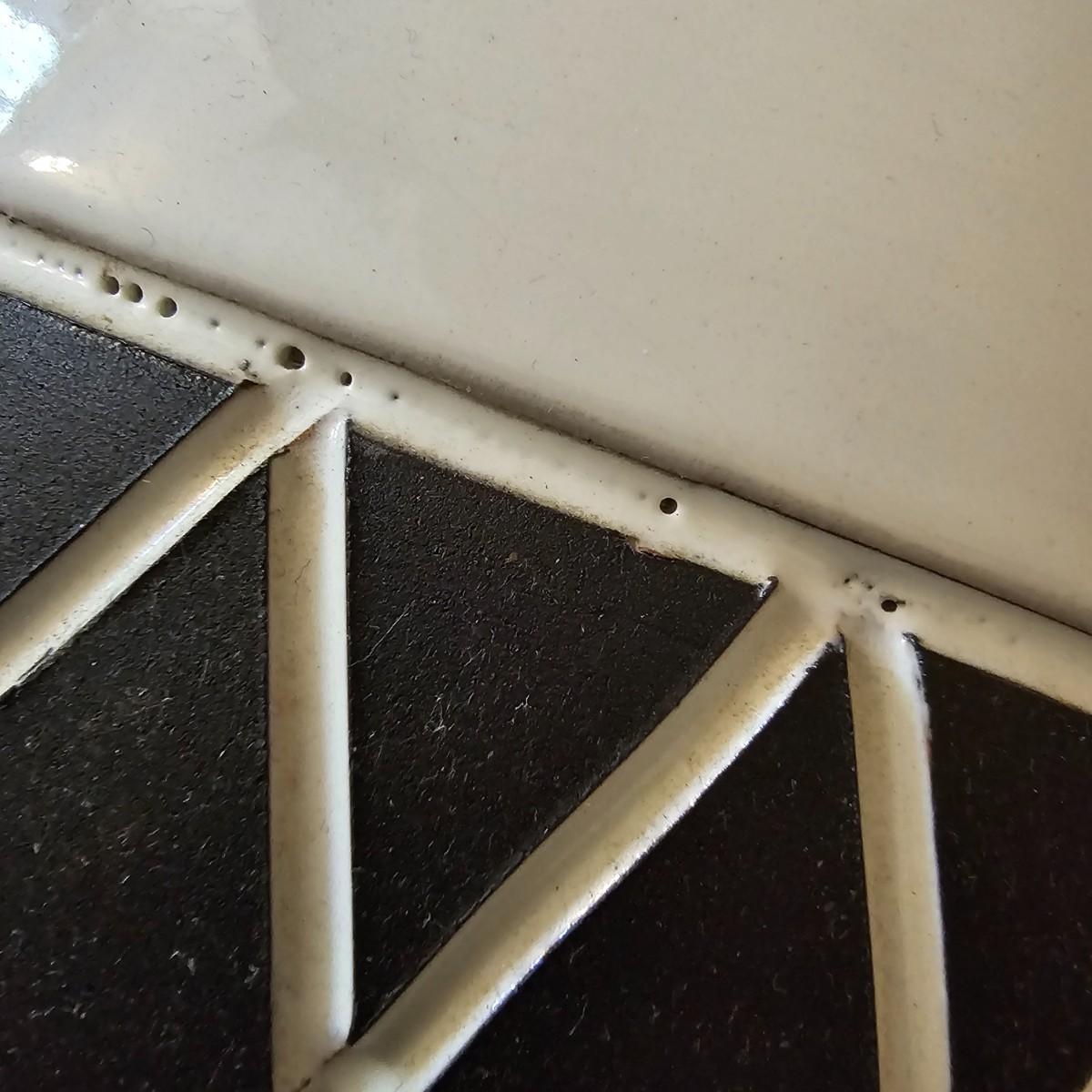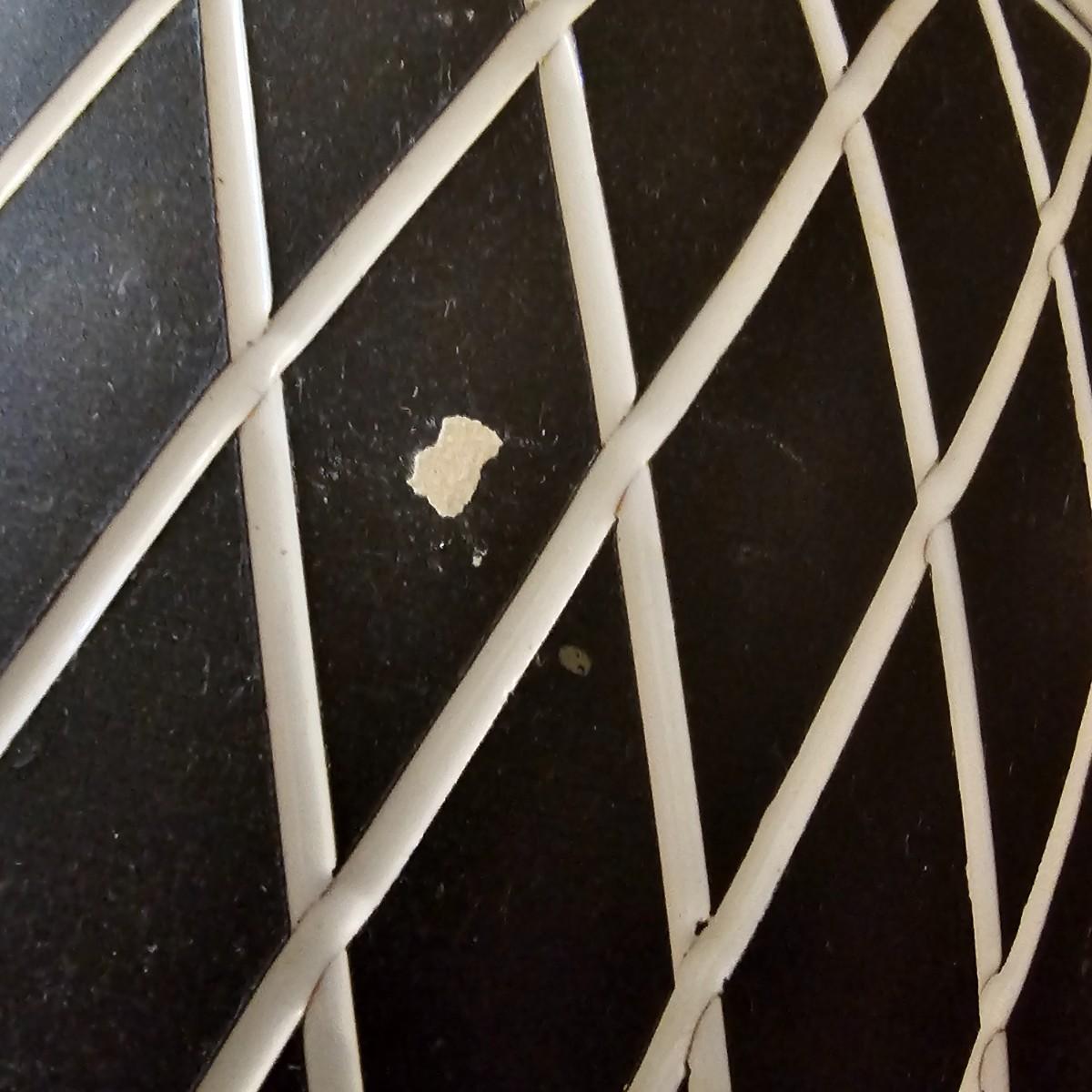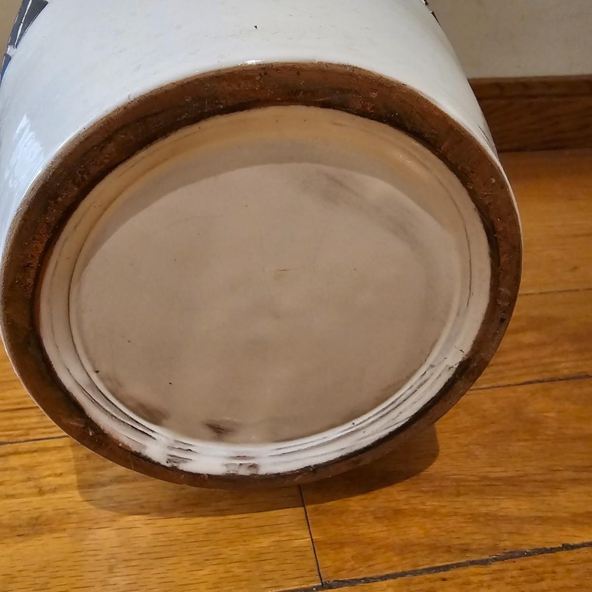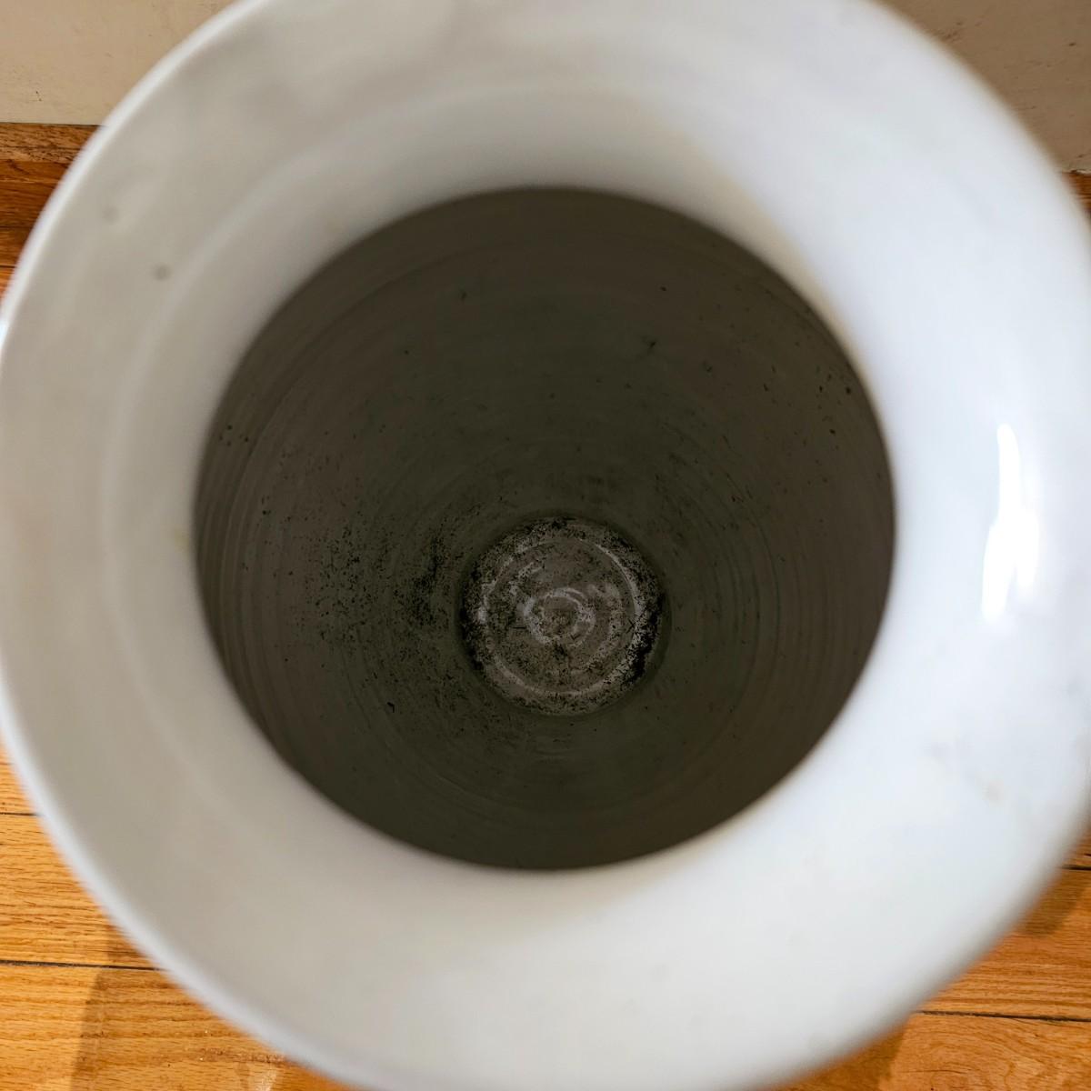 Contrasting colors of dark and light highlight this shapely urn. High gloss finishing white on top, bottom and inside, while criss cross design has matte look, lines are cut into the body of the piece. Vase measures 9"D x 18.5"H. Has one small blemish, may be a sticker residue. See photos for details. Local pickup only.