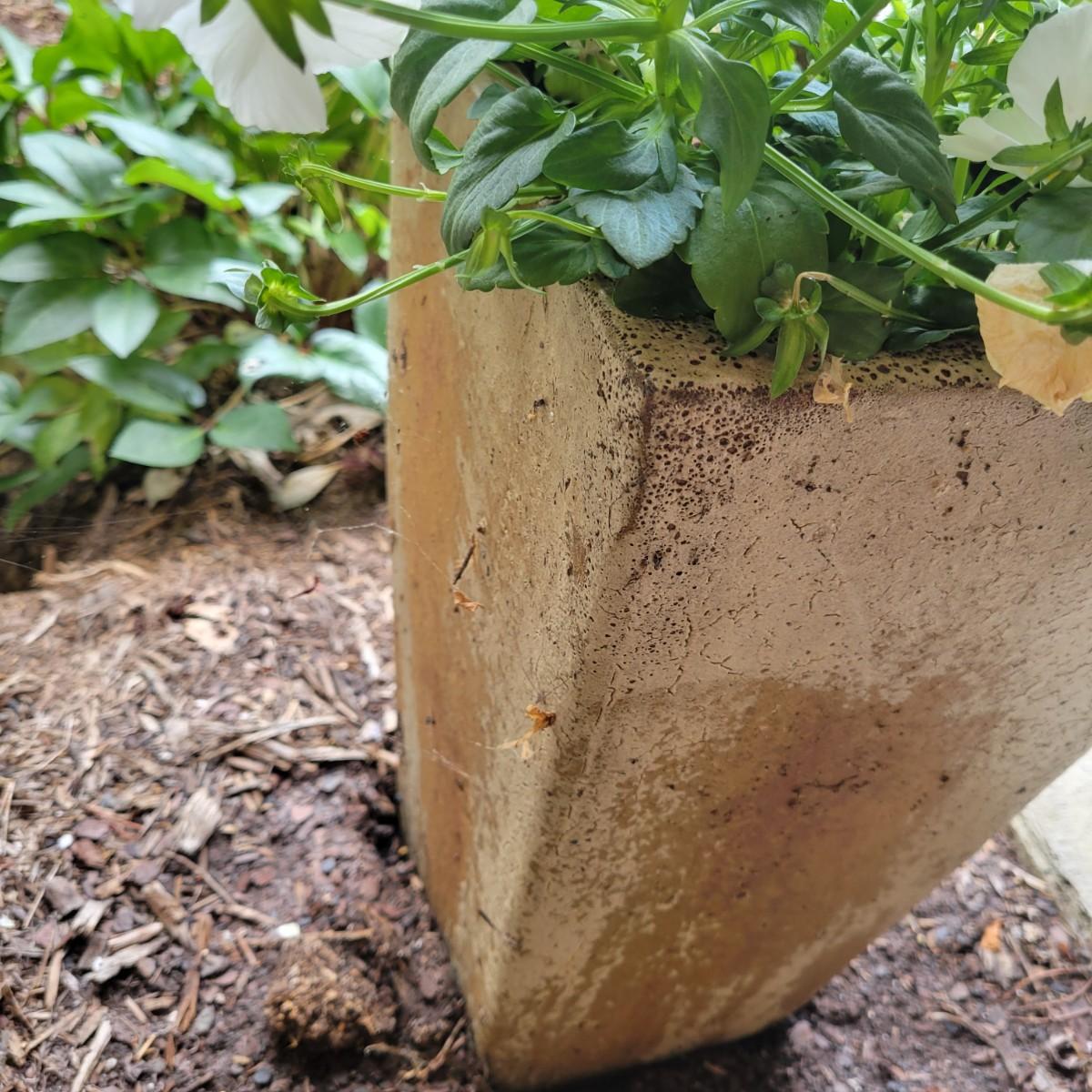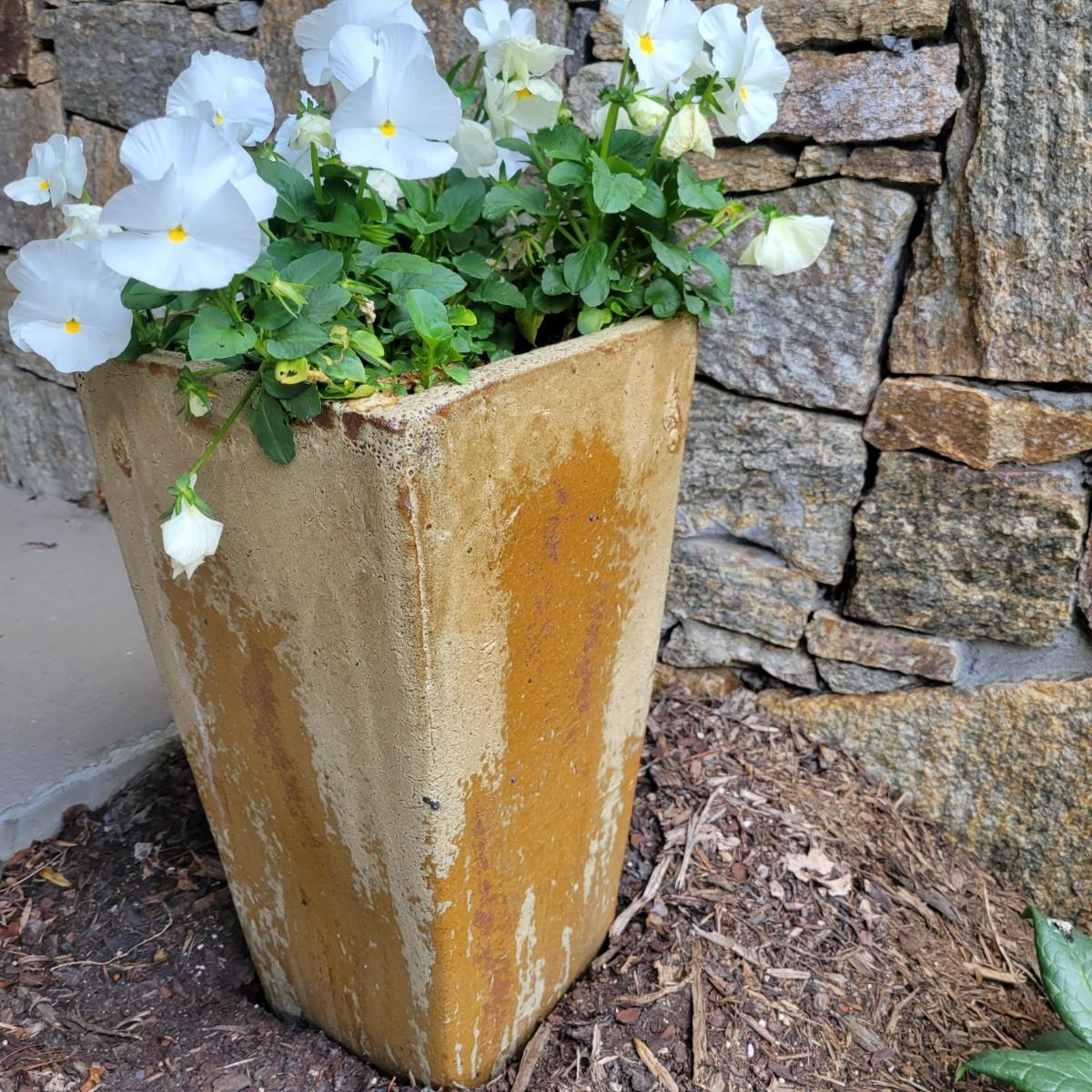 A tall, rectangularly shaped clay planter that has an orange tinted glaze with a cream colored glaze on top of it. It measures approximately 9" x 9" x 16"H. Flowers and soil are included. Local pickup only