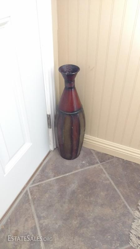 Tall red and brownish green ceramic vase, approx. 18".