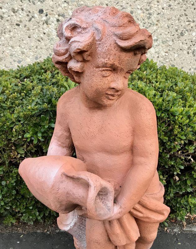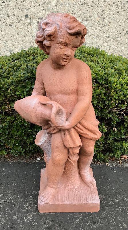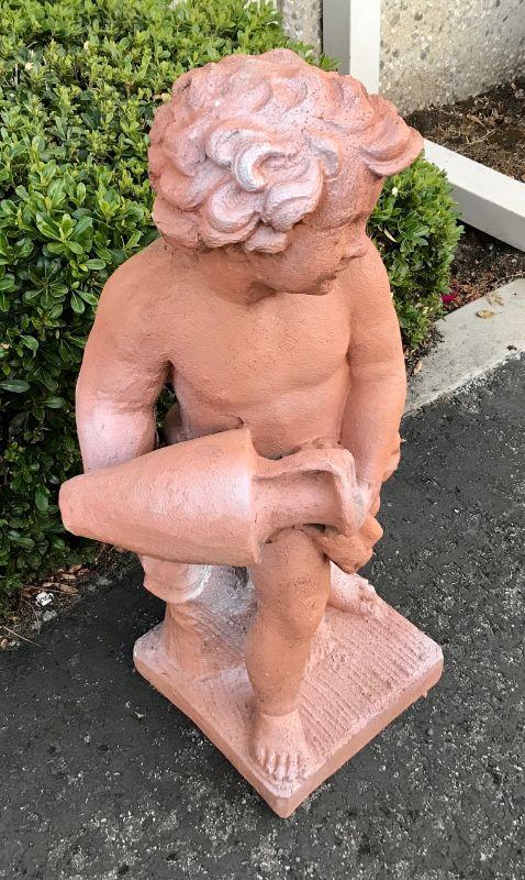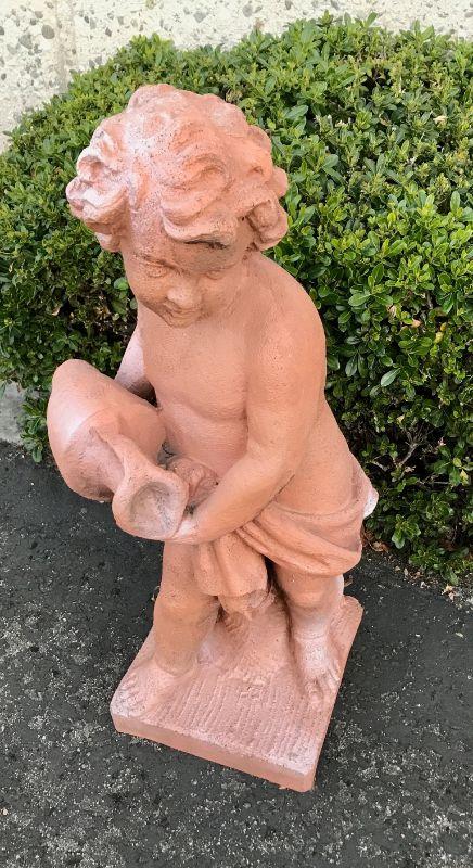 Child/ Cherub garden statue. Normal signs of outside use. No major damage or cracks. Seems to be made of a heavy duty outdoor resin with a concrete like finish.