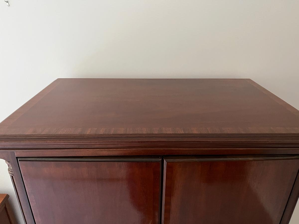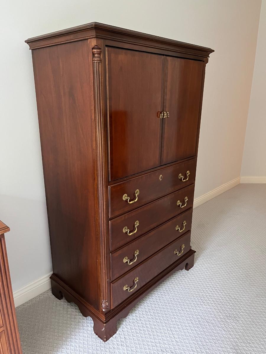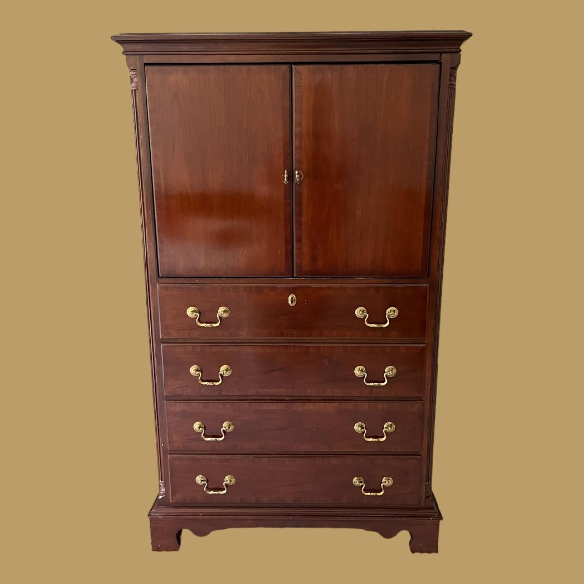60"h x 36"w x 21"d--a very nice tall dresser with 4 drawers and an upper cabinet by Lexington. The cabinet could be used for a TV or fitted with shelves for clothing storage. Mahogany finish, a few kicks and scratches but still, a solid and handsome piece.