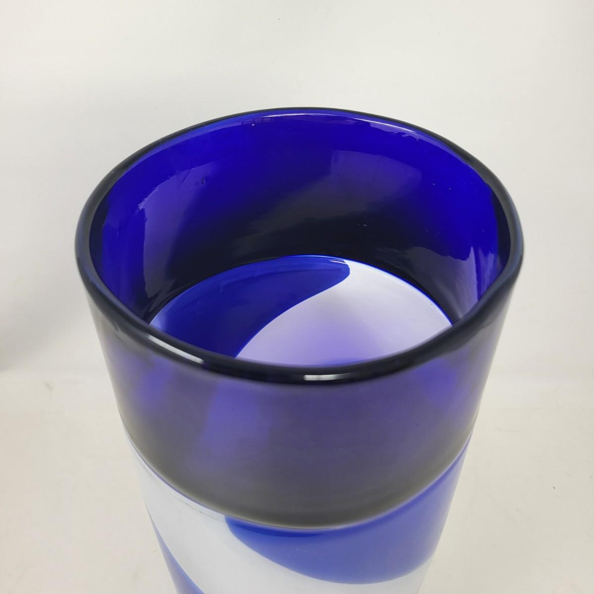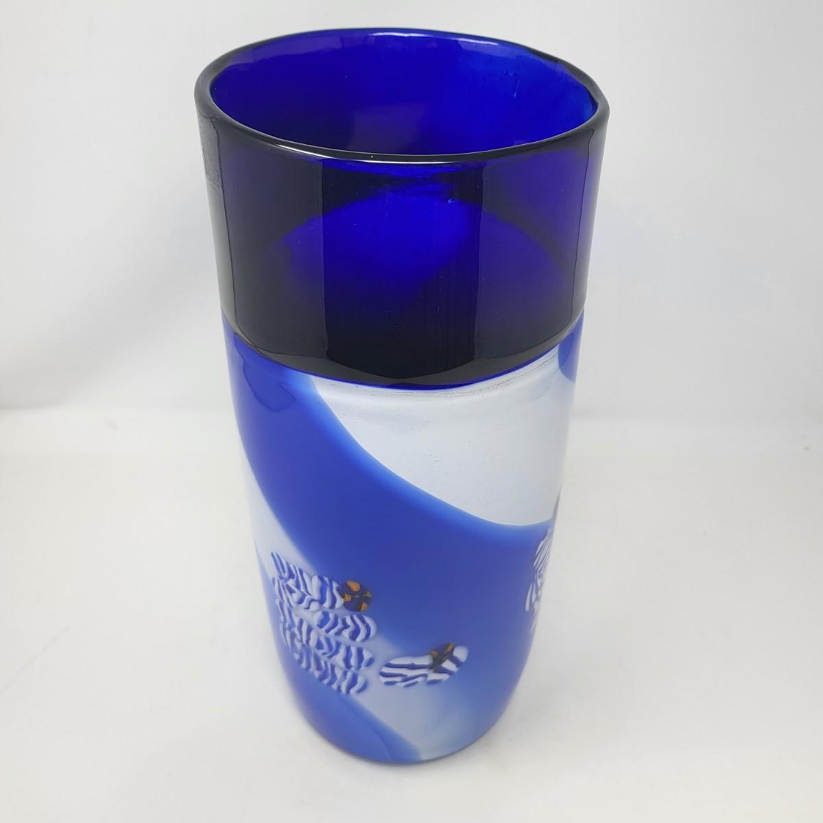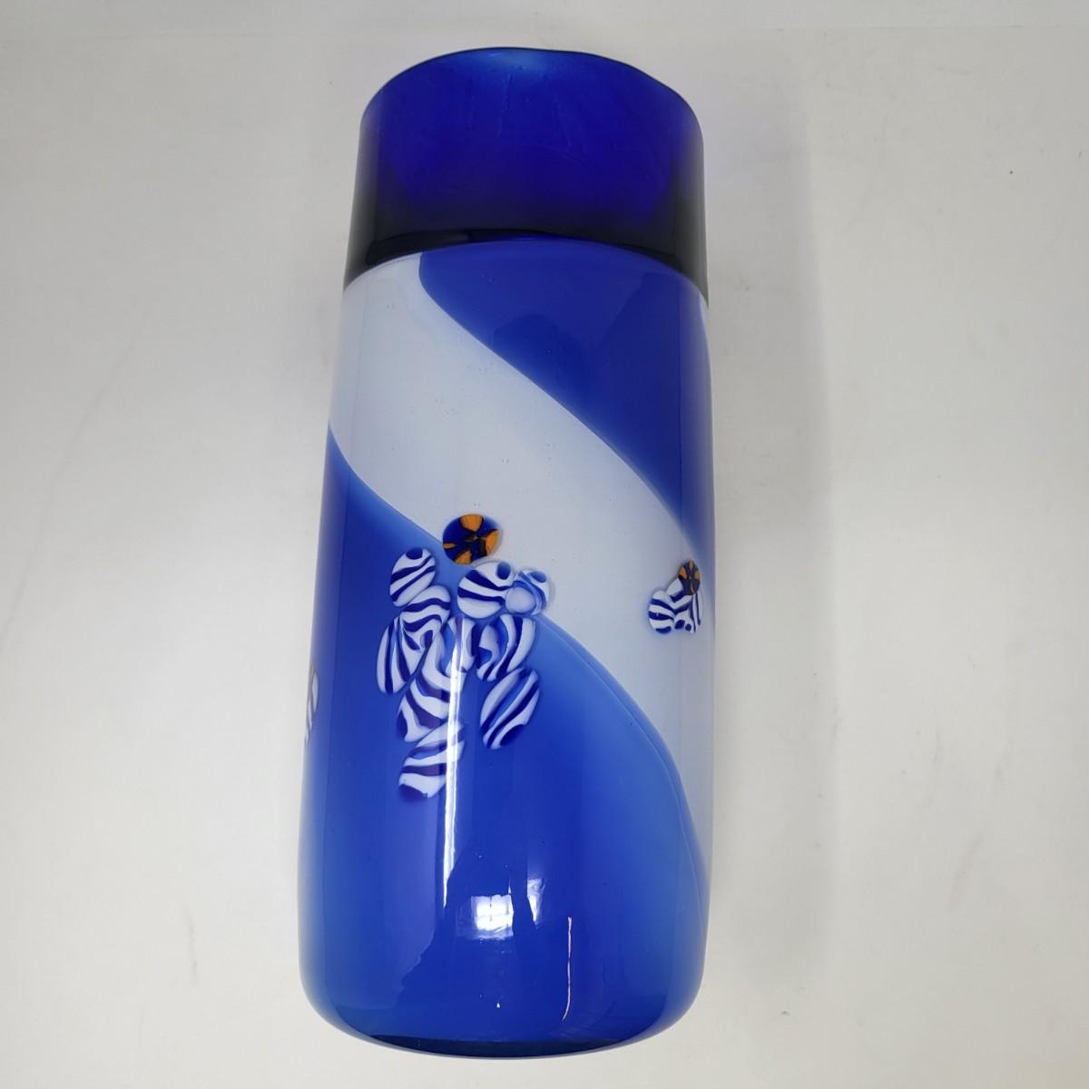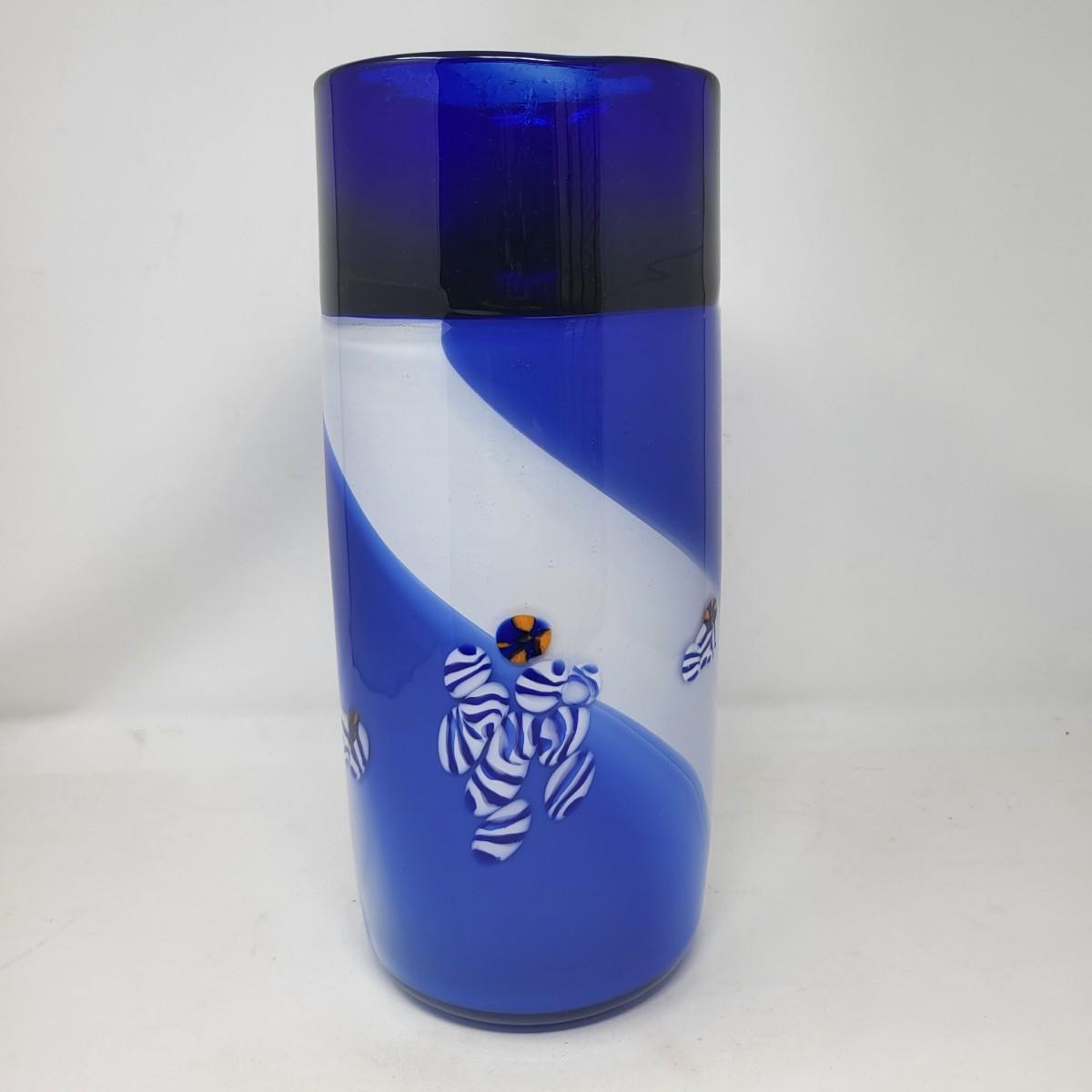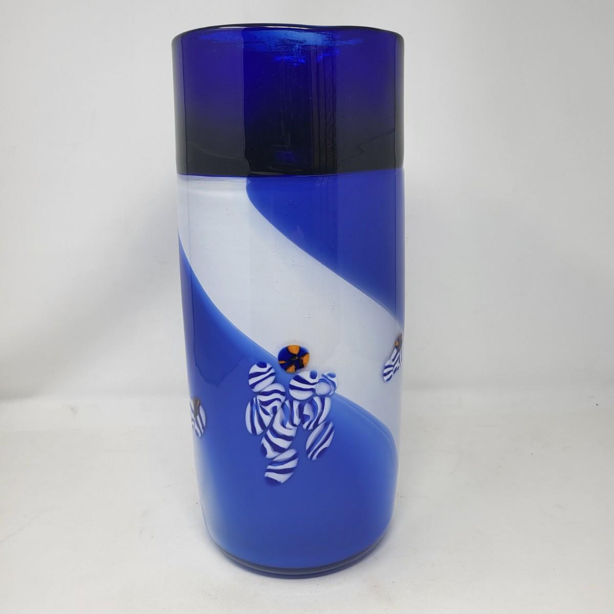 Cobalt blue, white/blue swirl and millefiori striped spots design. Vase is 13" tall x 5" round.