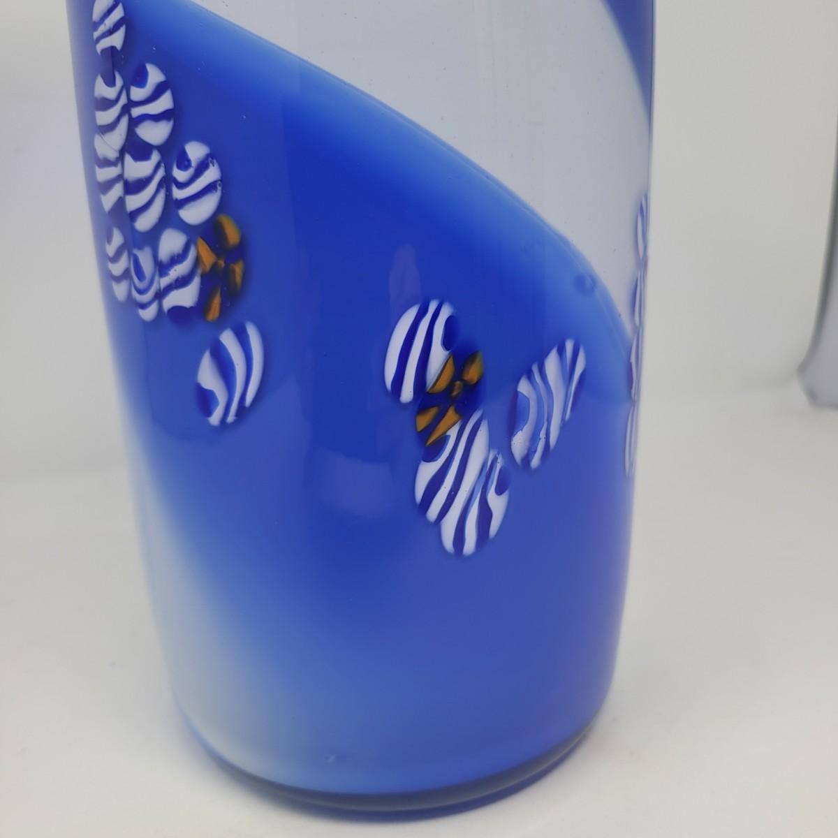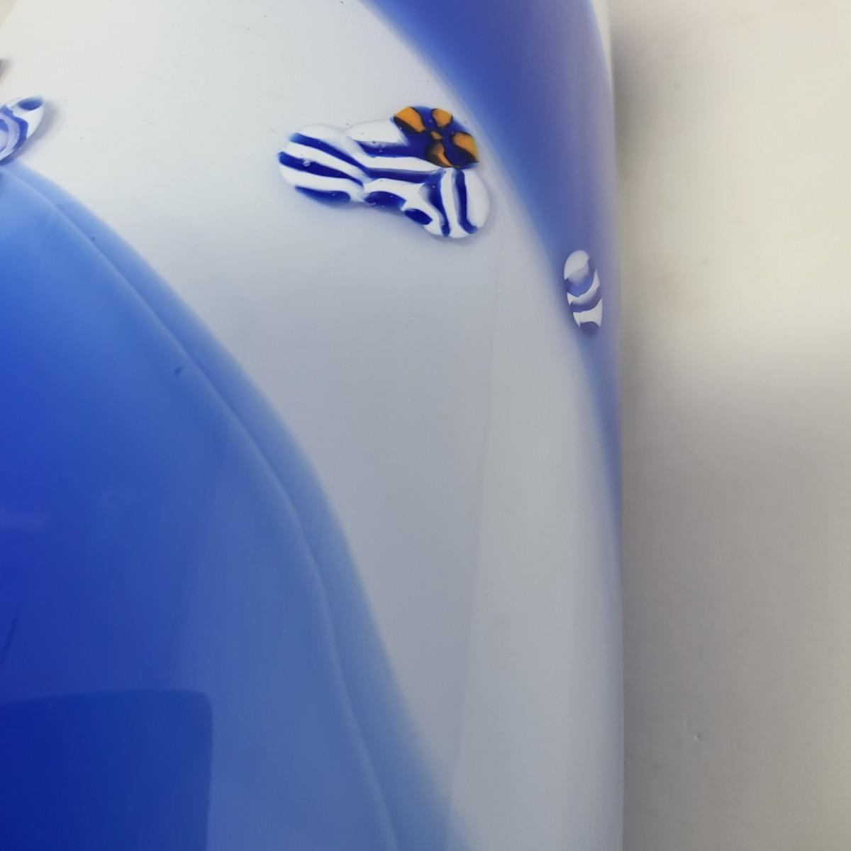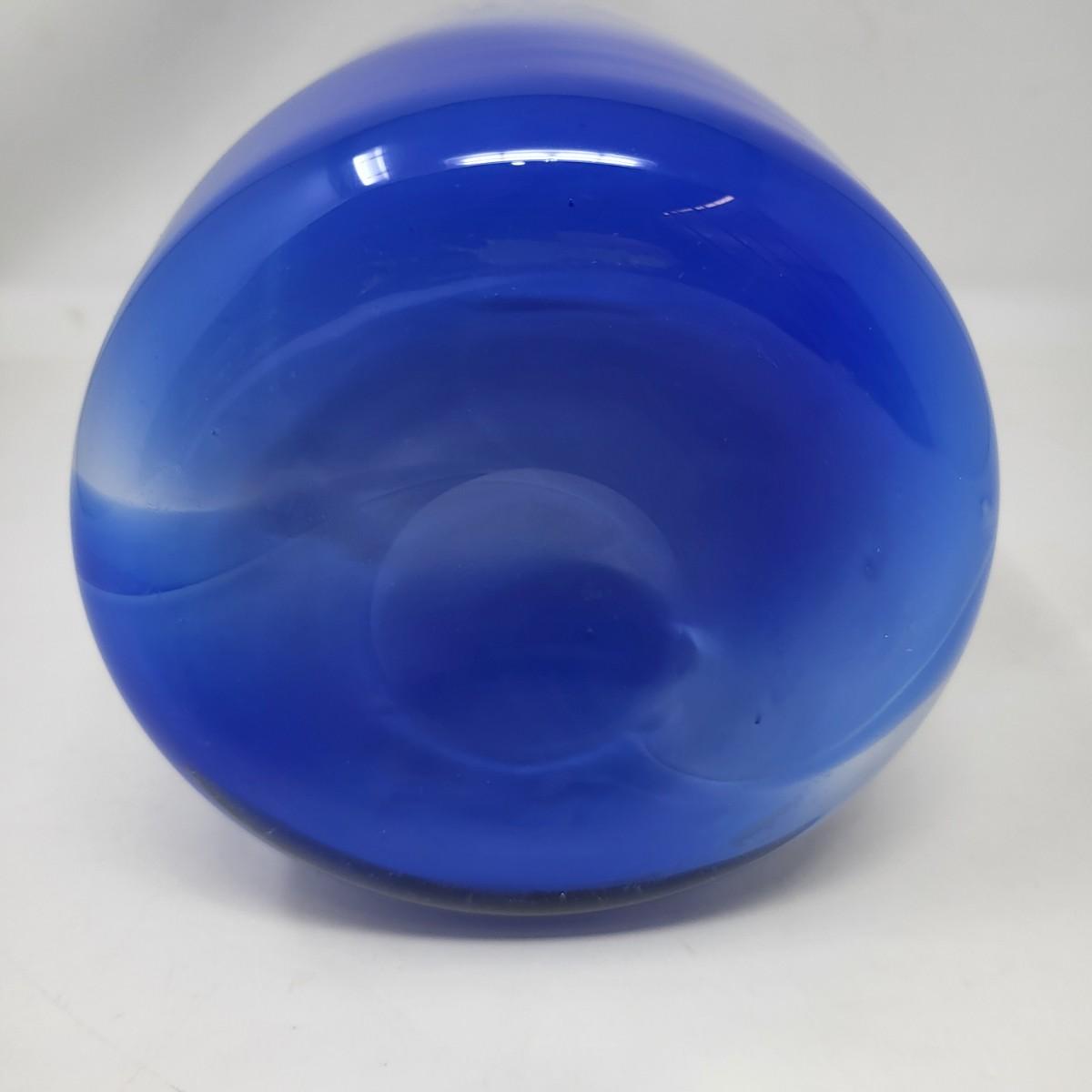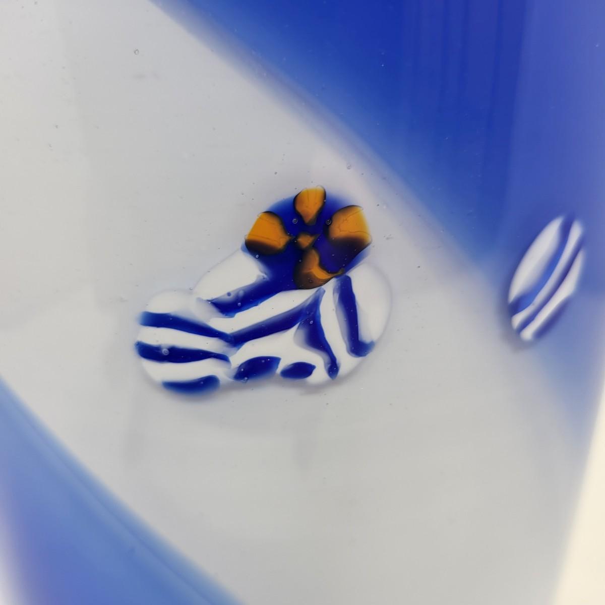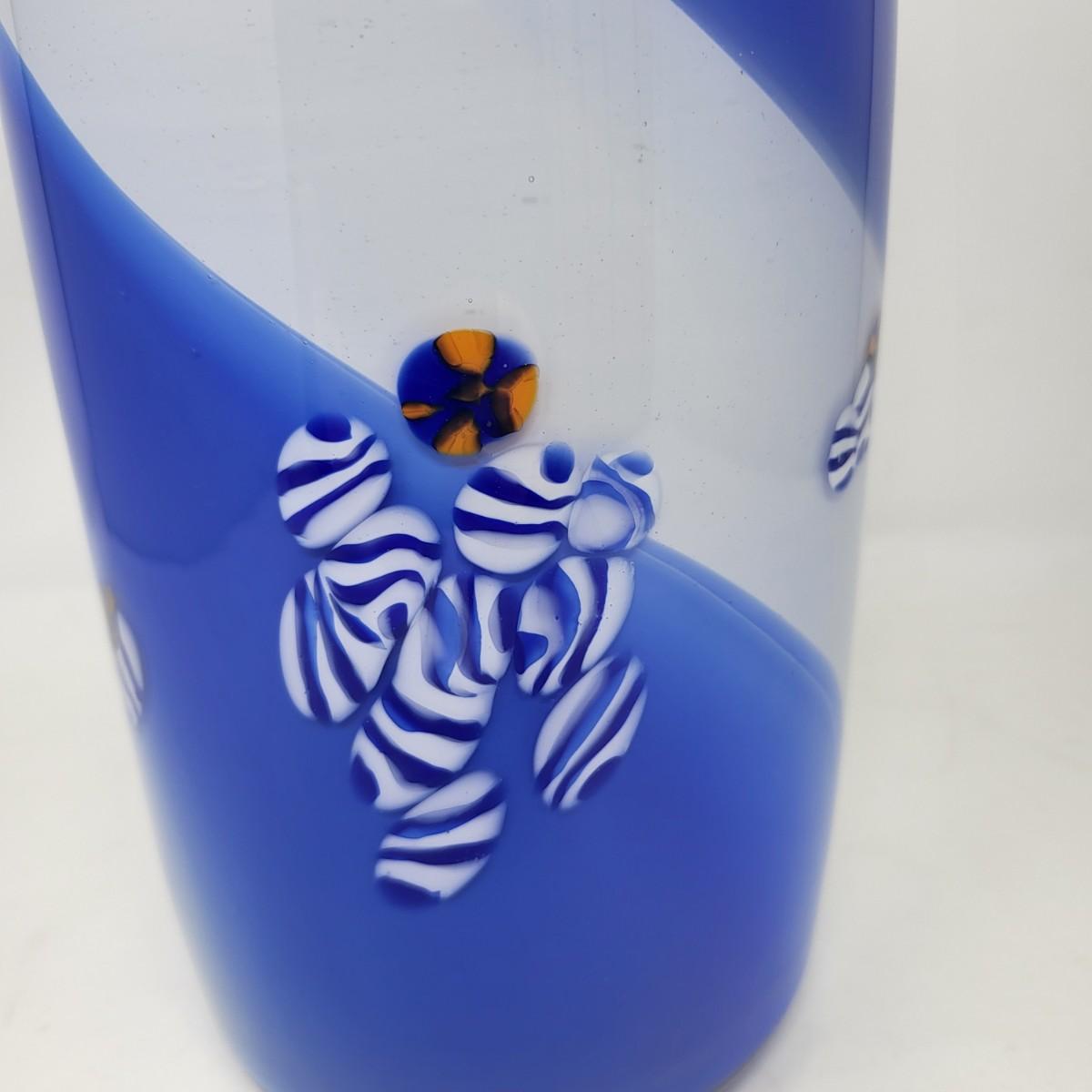 Cobalt blue, white/blue swirl and millefiori striped spots design. Vase is 13" tall x 5" round.