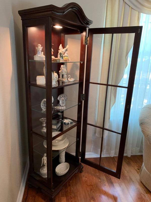 Very nice size! Beautiful lighted curio display cabinet in a cherry finish. Measures 20" Wide 14" Deep 74" Tall