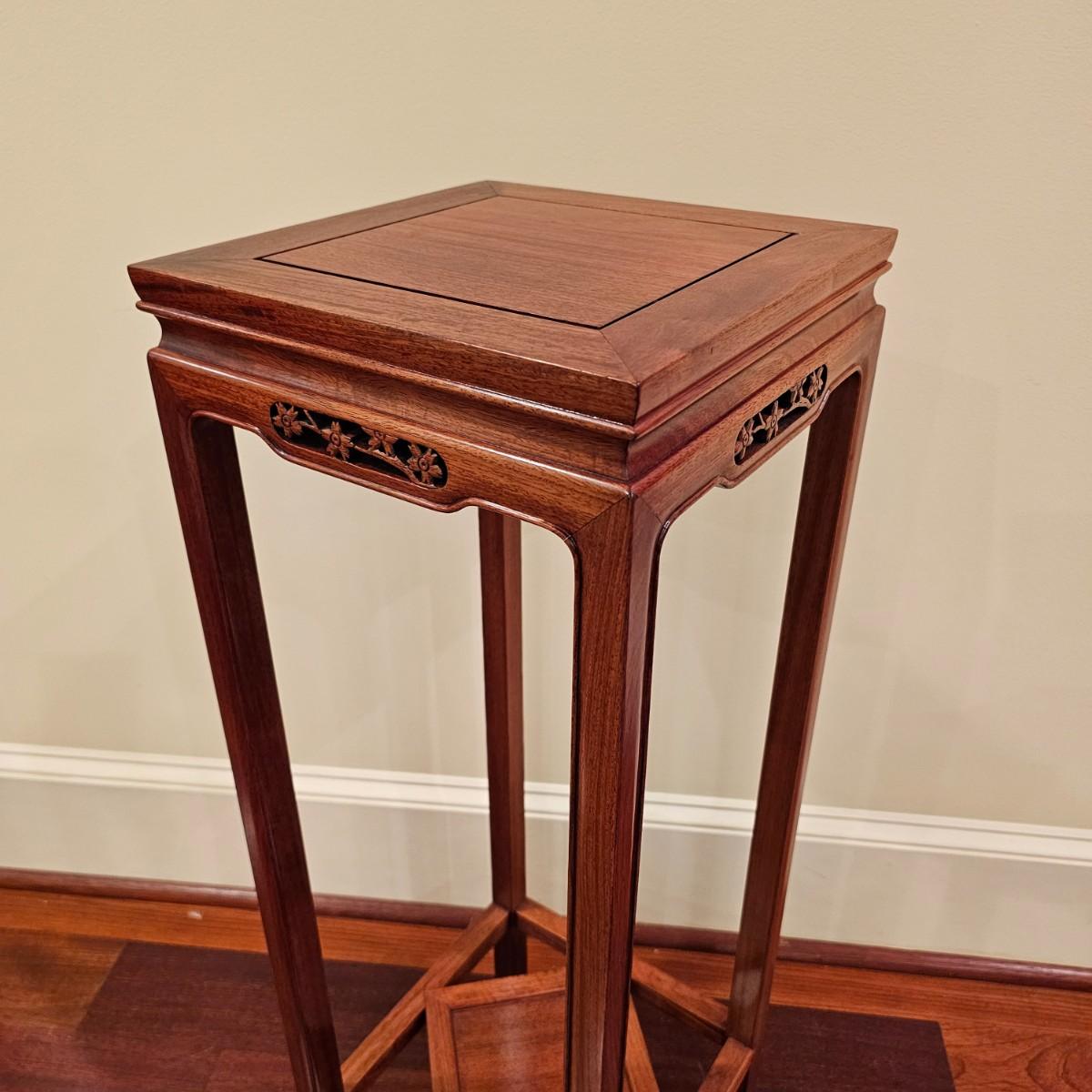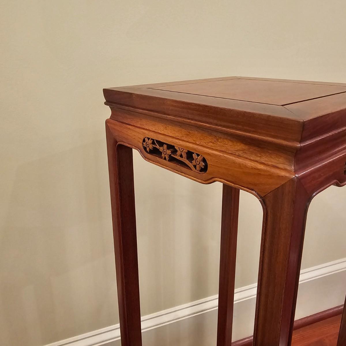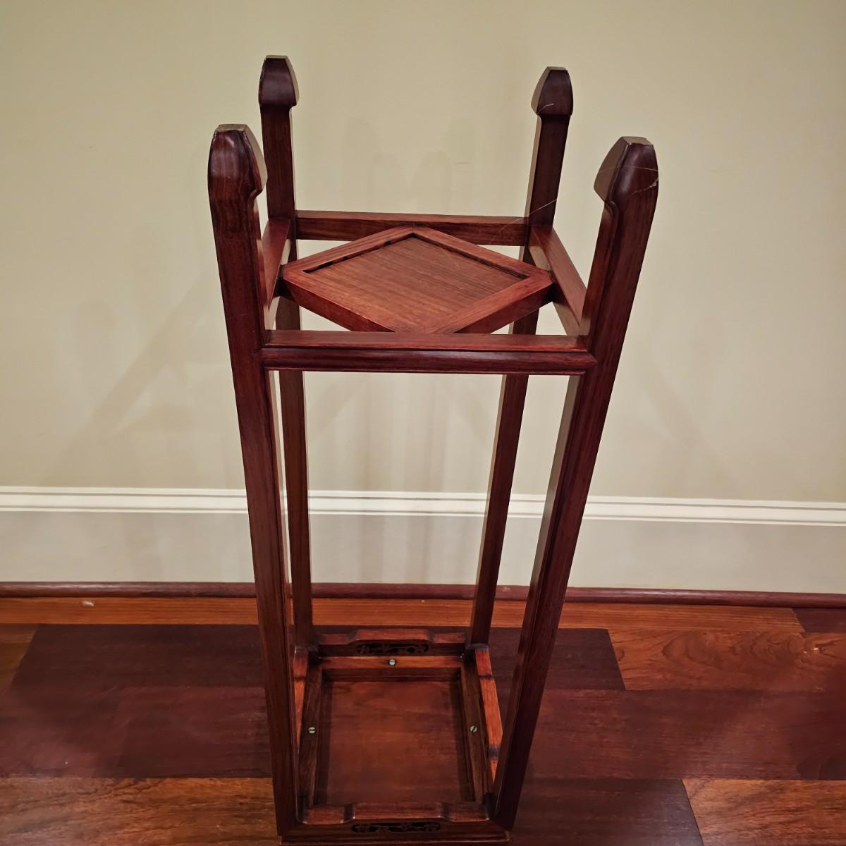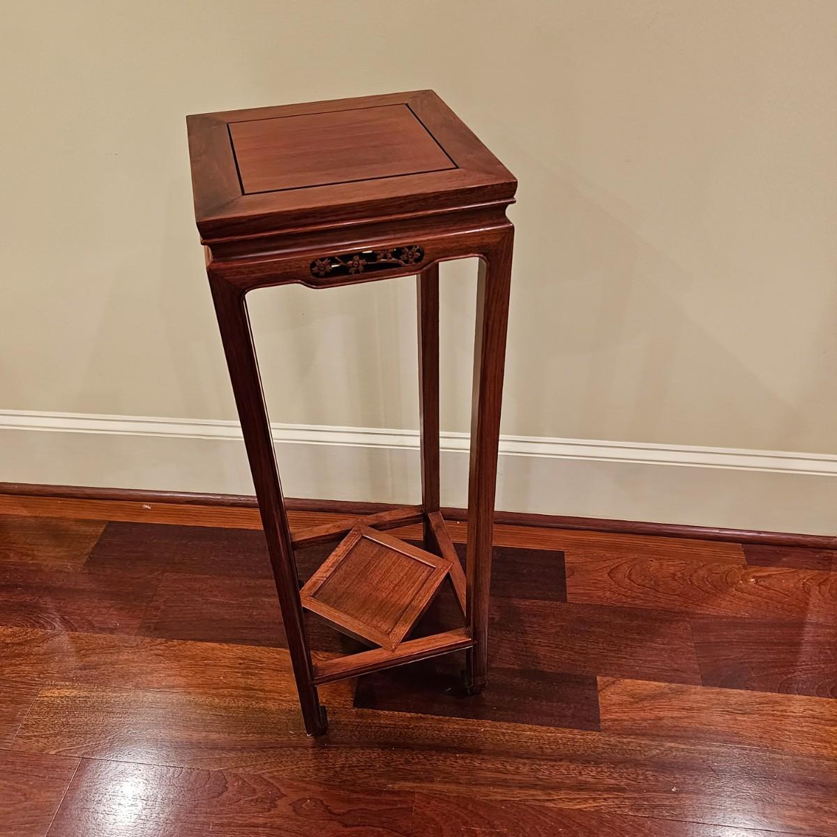 Elegant wooden plant stand with decorative accents on top. Slender legs , small shelf at bottom. Stand measures 12" x 12" x 36"H. See photos for details. Has matching piece in dark mahogany color in this auction. Local pickup only.