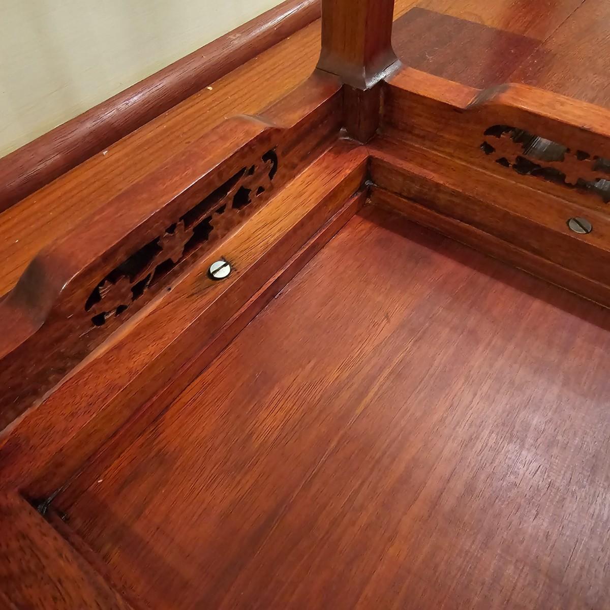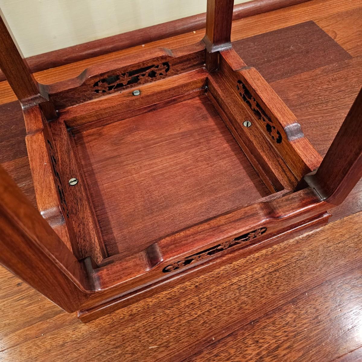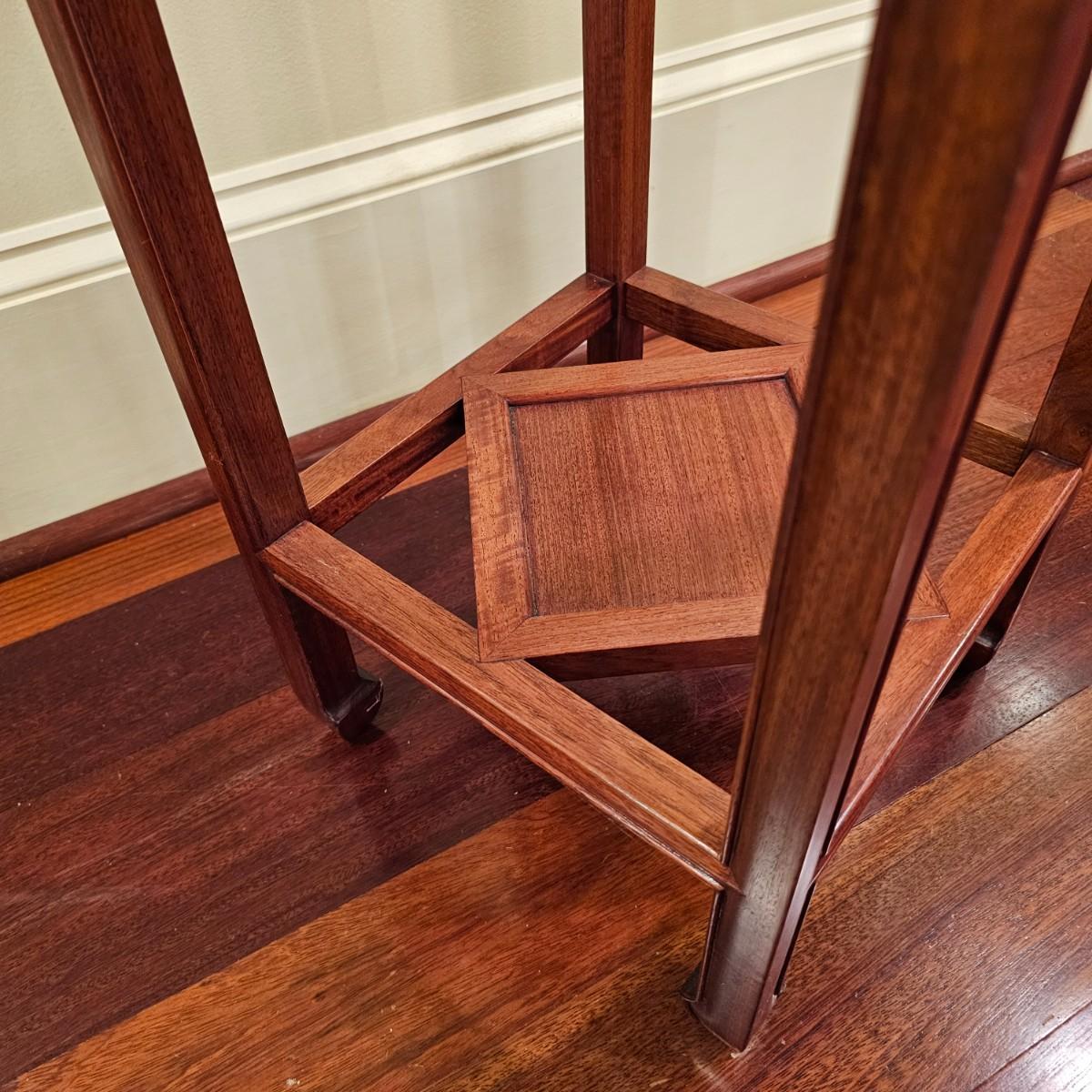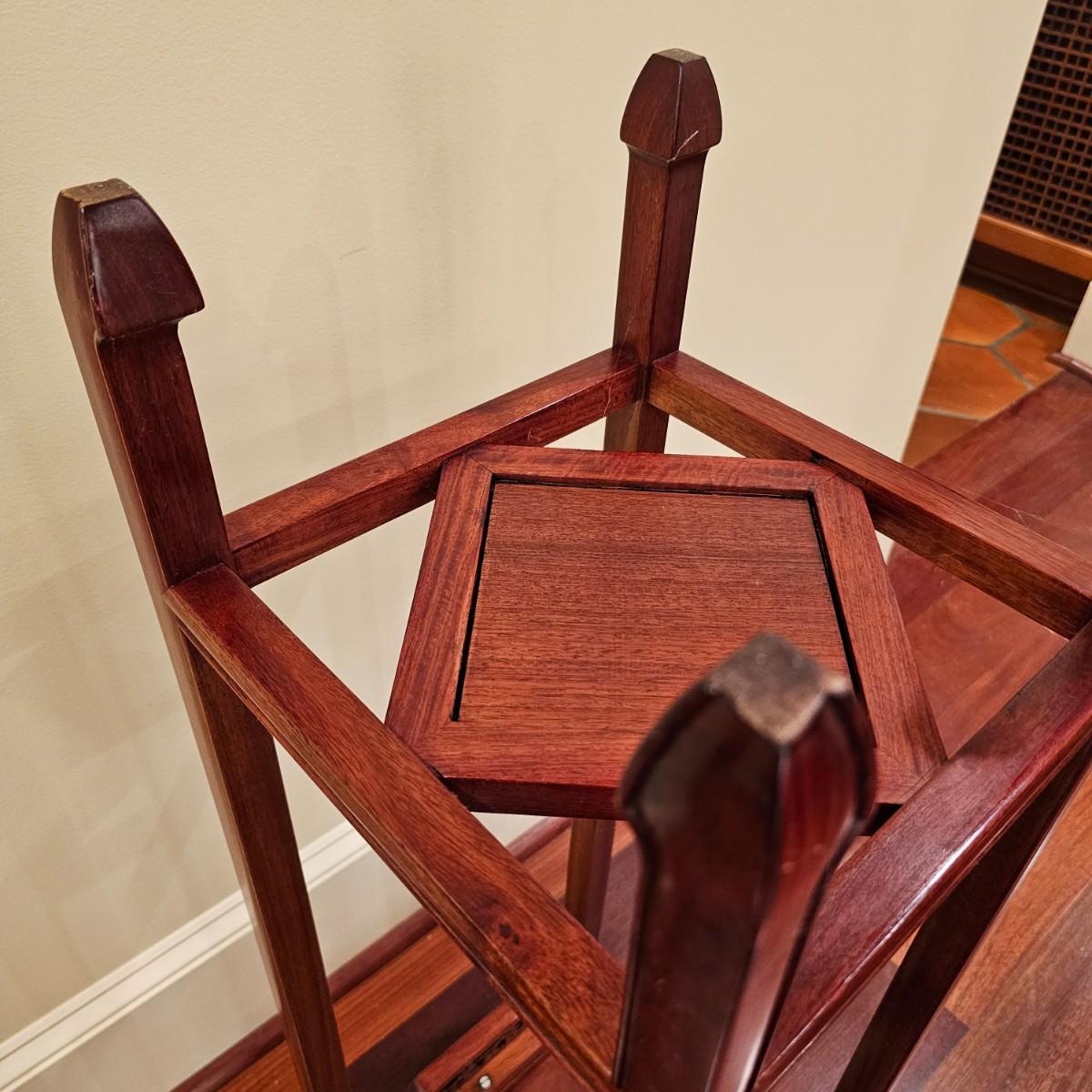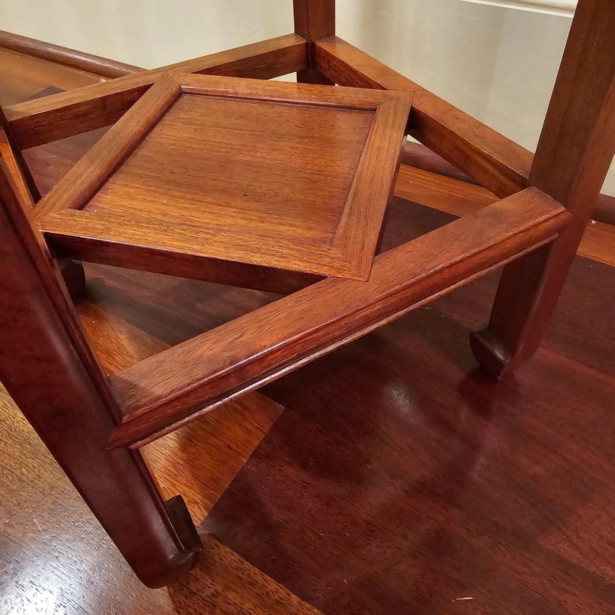 Elegant wooden plant stand with decorative accents on top. Slender legs , small shelf at bottom. Stand measures 12" x 12" x 36"H. See photos for details. Has matching piece in dark mahogany color in this auction. Local pickup only.