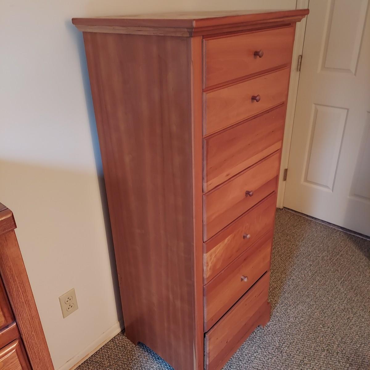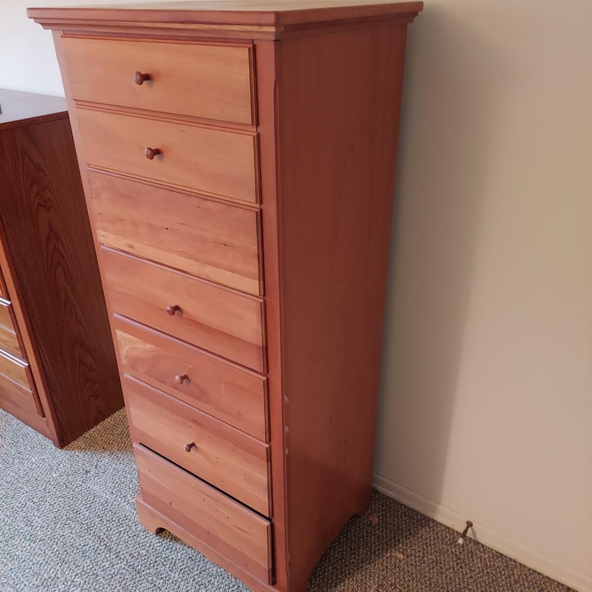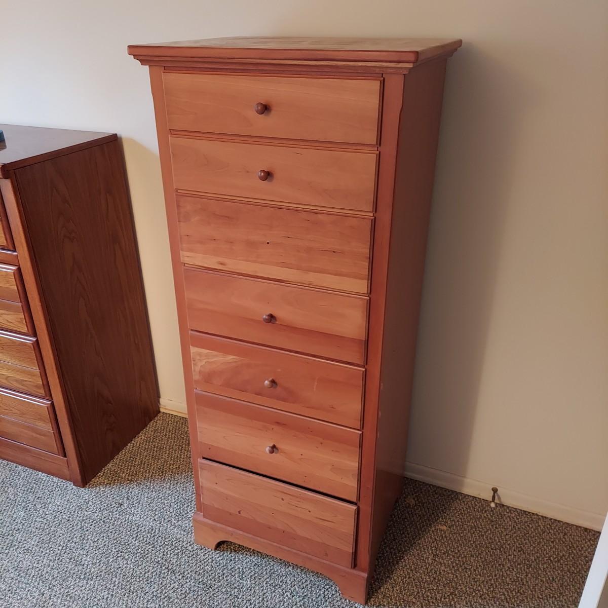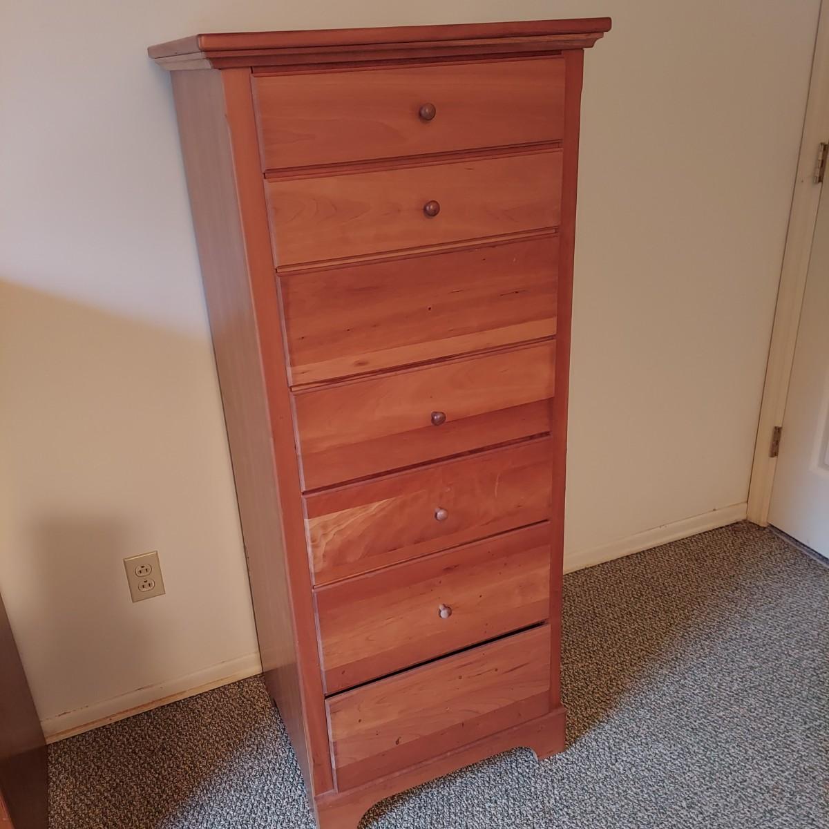 Tall dresser with seven drawers. Has a light finish and is made from solid wood. Measures 23" x 19" x 55"H. There are two wooden knobs missing. Please see photos. Local Pickup Only. Winning bidder must bring assistance to help move and load this item due to its weight and/or size.