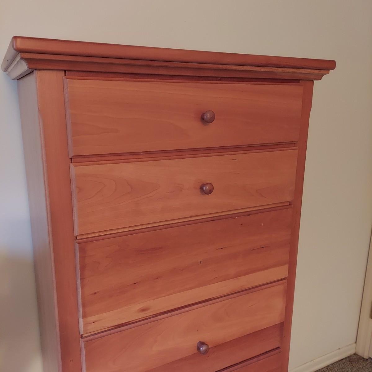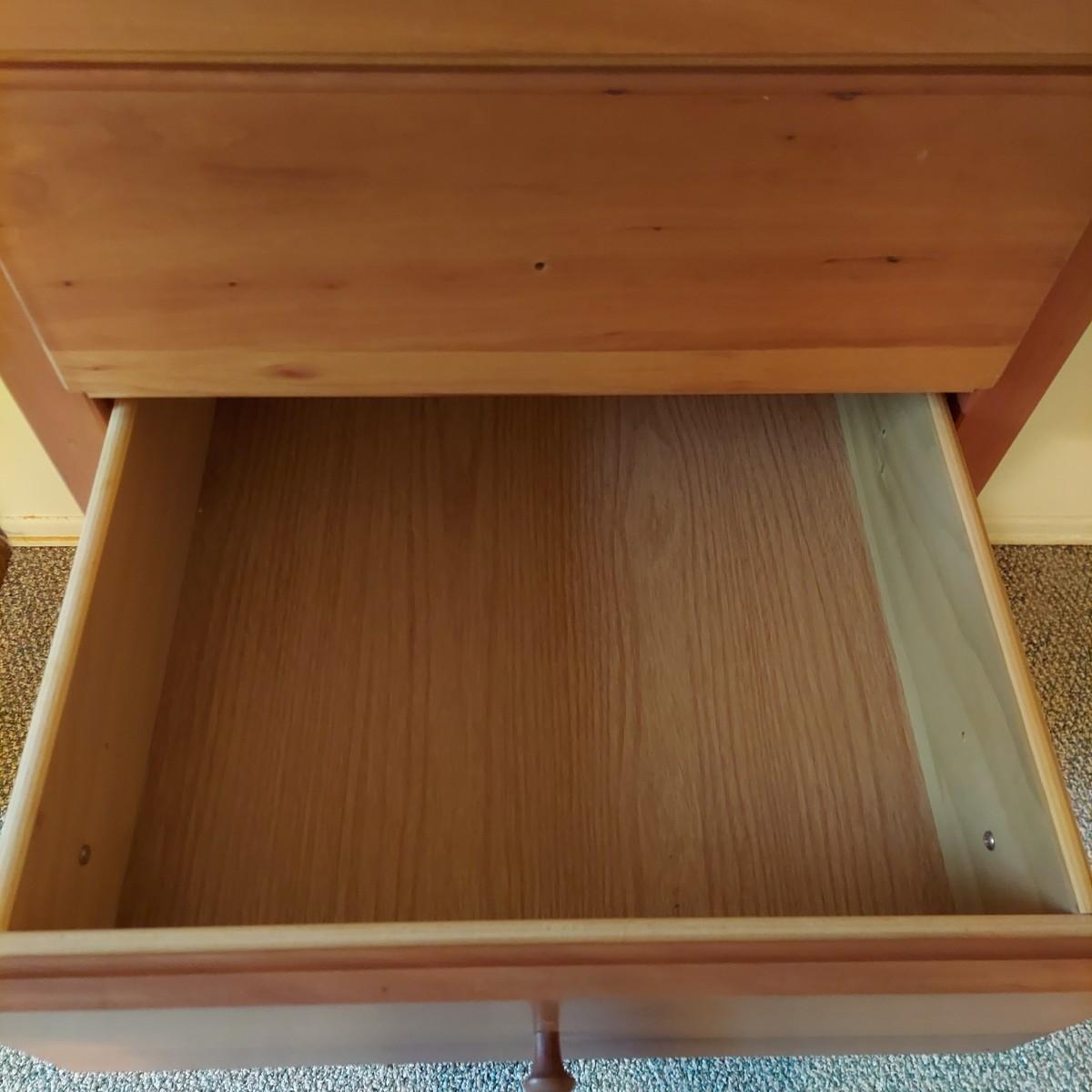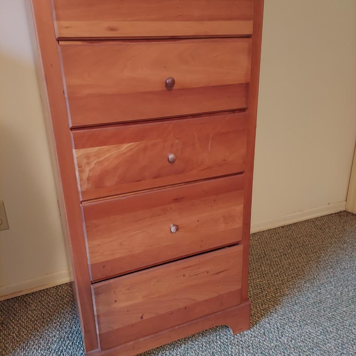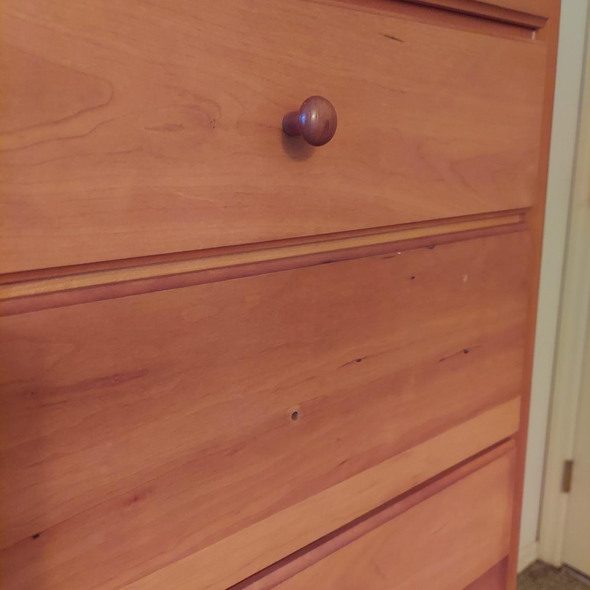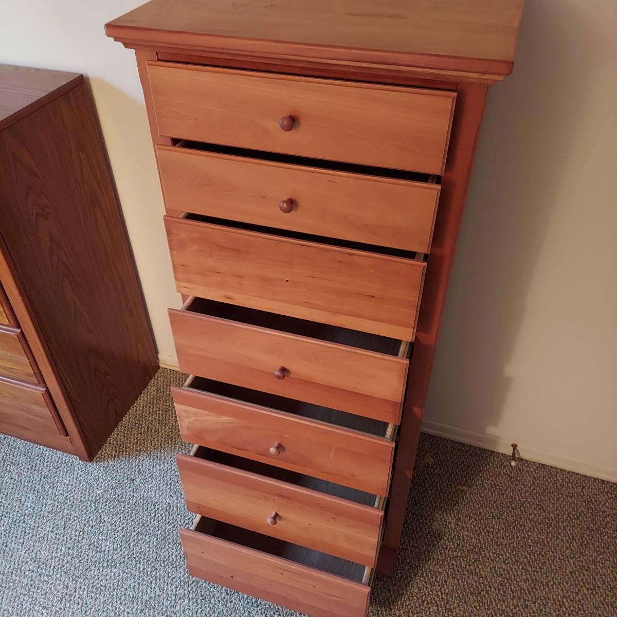 Tall dresser with seven drawers. Has a light finish and is made from solid wood. Measures 23" x 19" x 55"H. There are two wooden knobs missing. Please see photos. Local Pickup Only. Winning bidder must bring assistance to help move and load this item due to its weight and/or size.