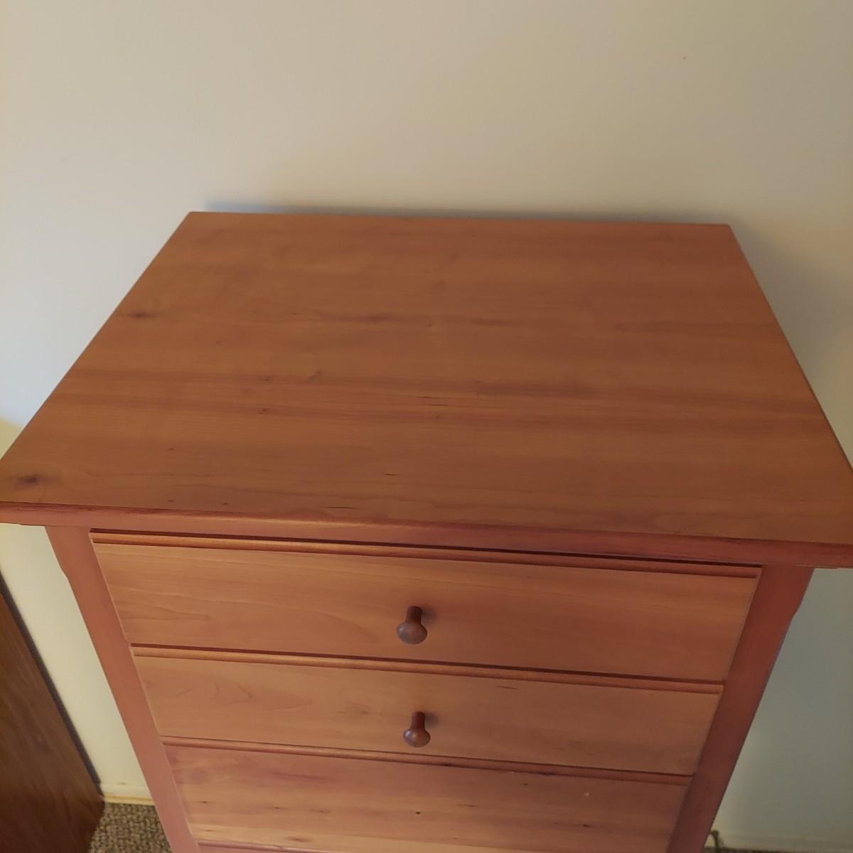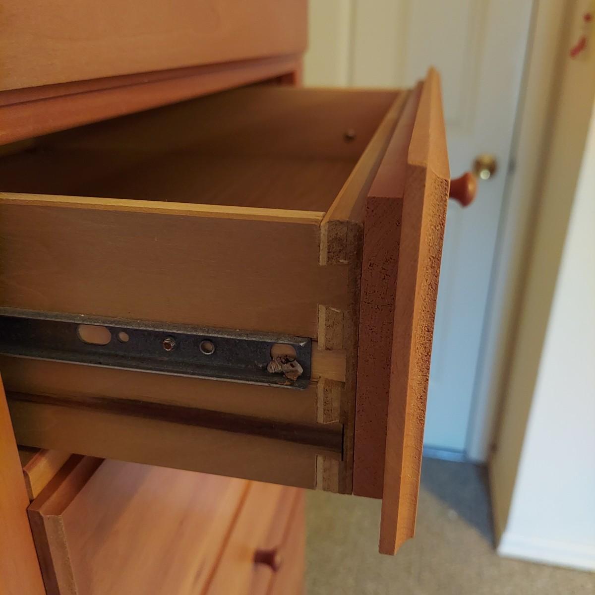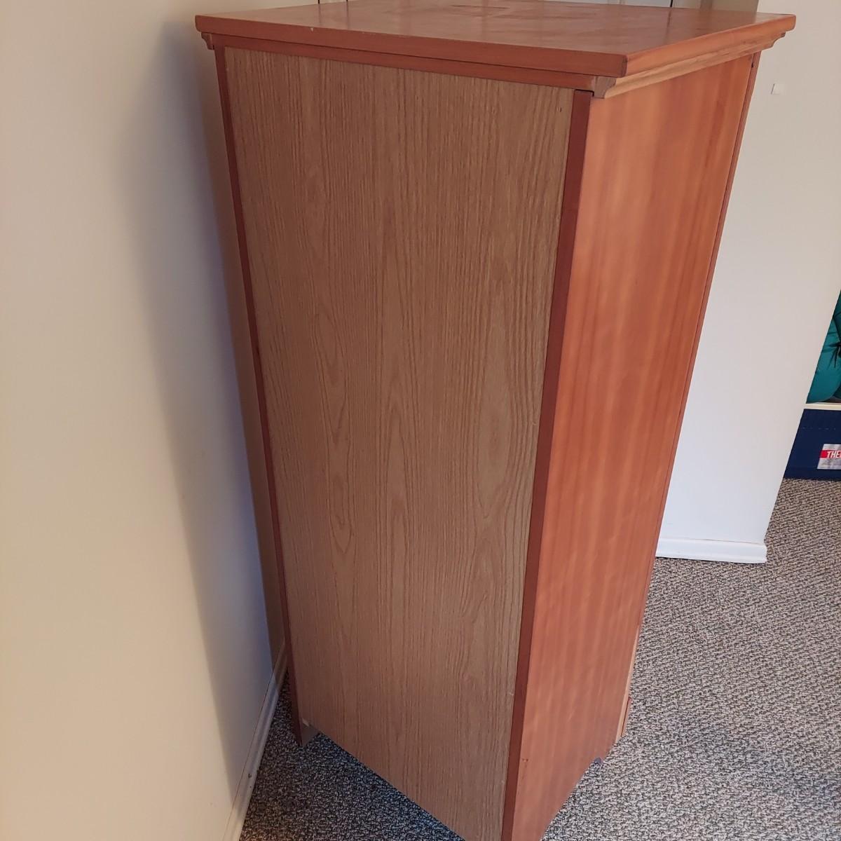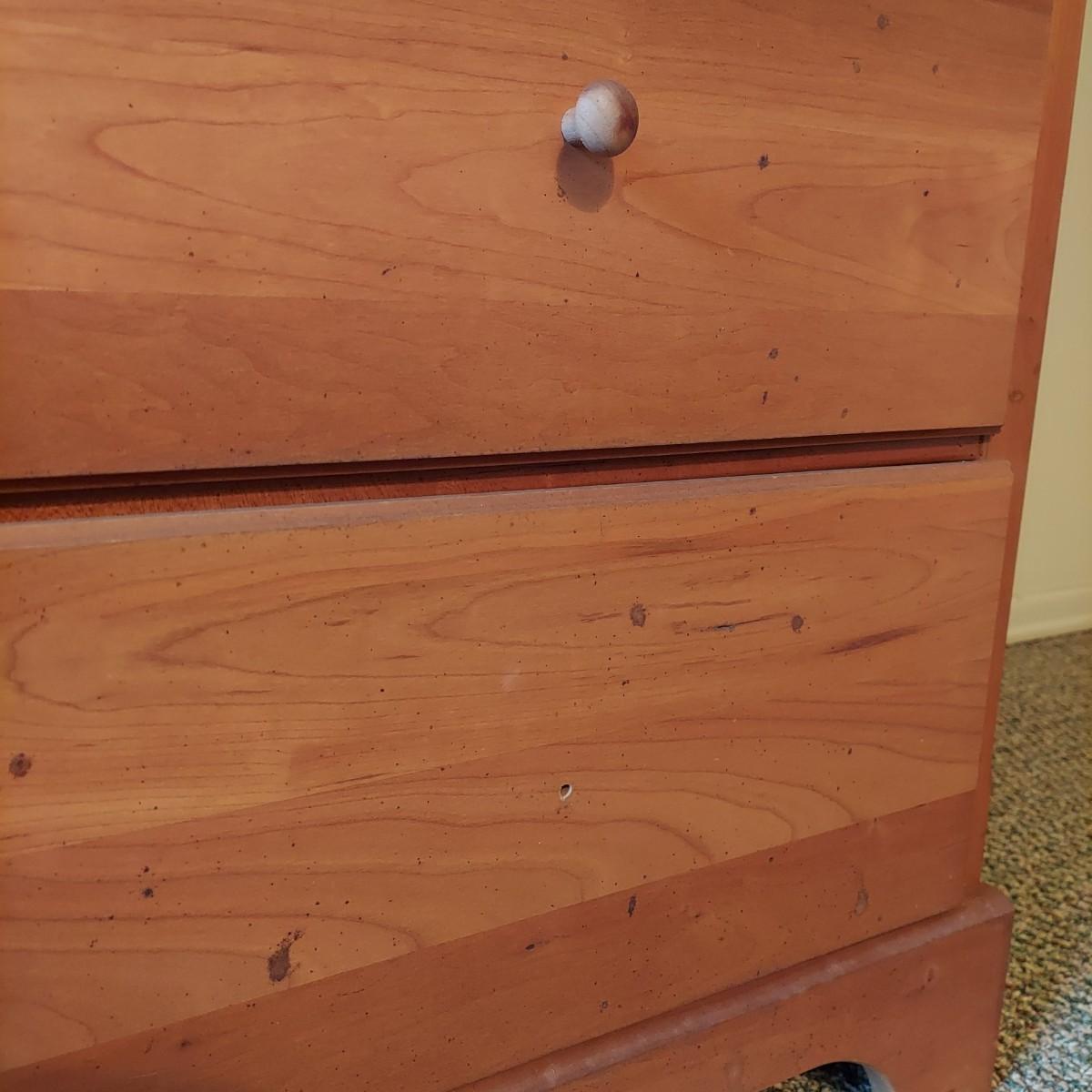 Tall dresser with seven drawers. Has a light finish and is made from solid wood. Measures 23" x 19" x 55"H. There are two wooden knobs missing. Please see photos. Local Pickup Only. Winning bidder must bring assistance to help move and load this item due to its weight and/or size.
