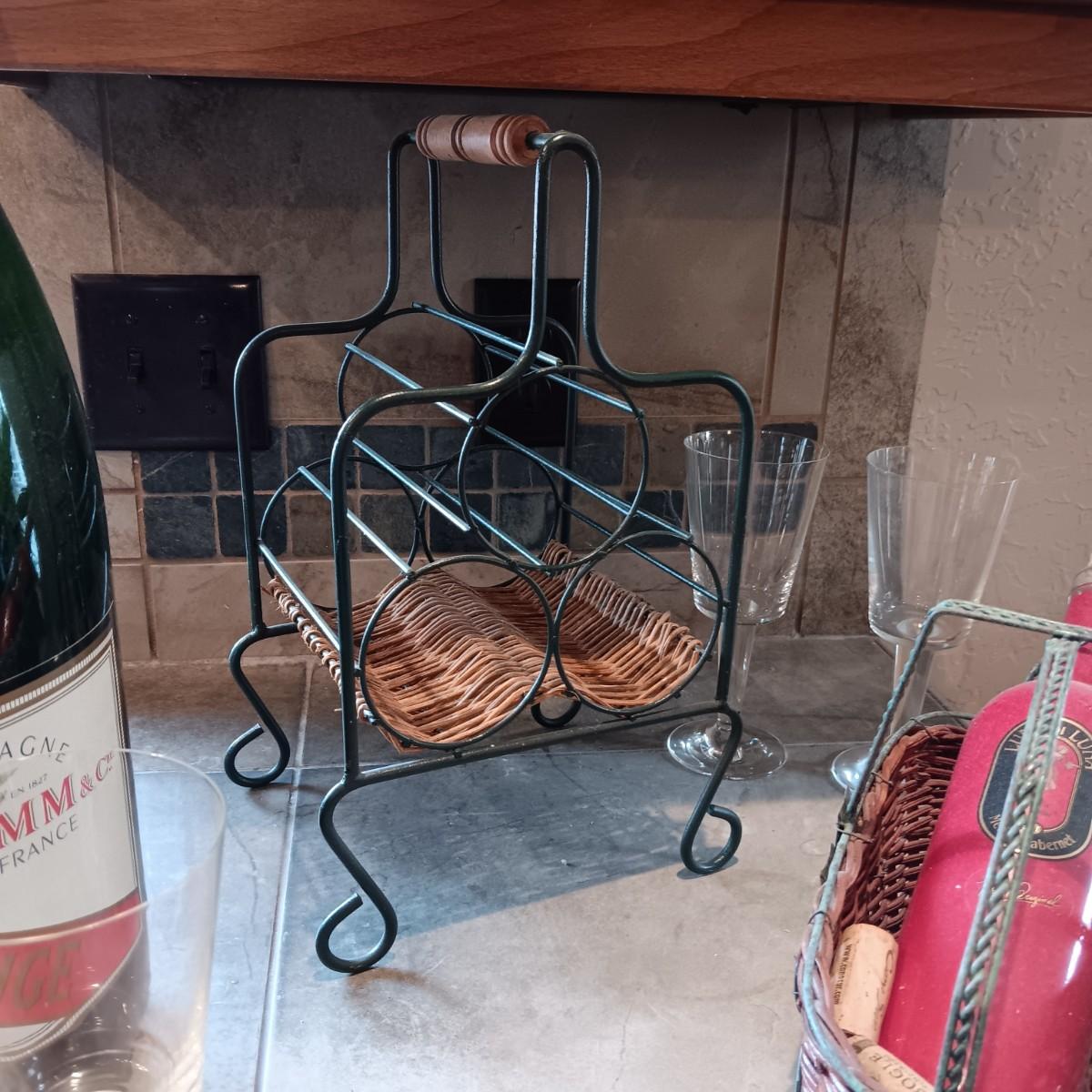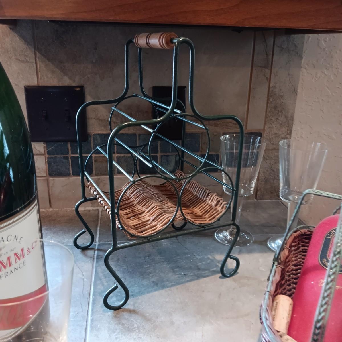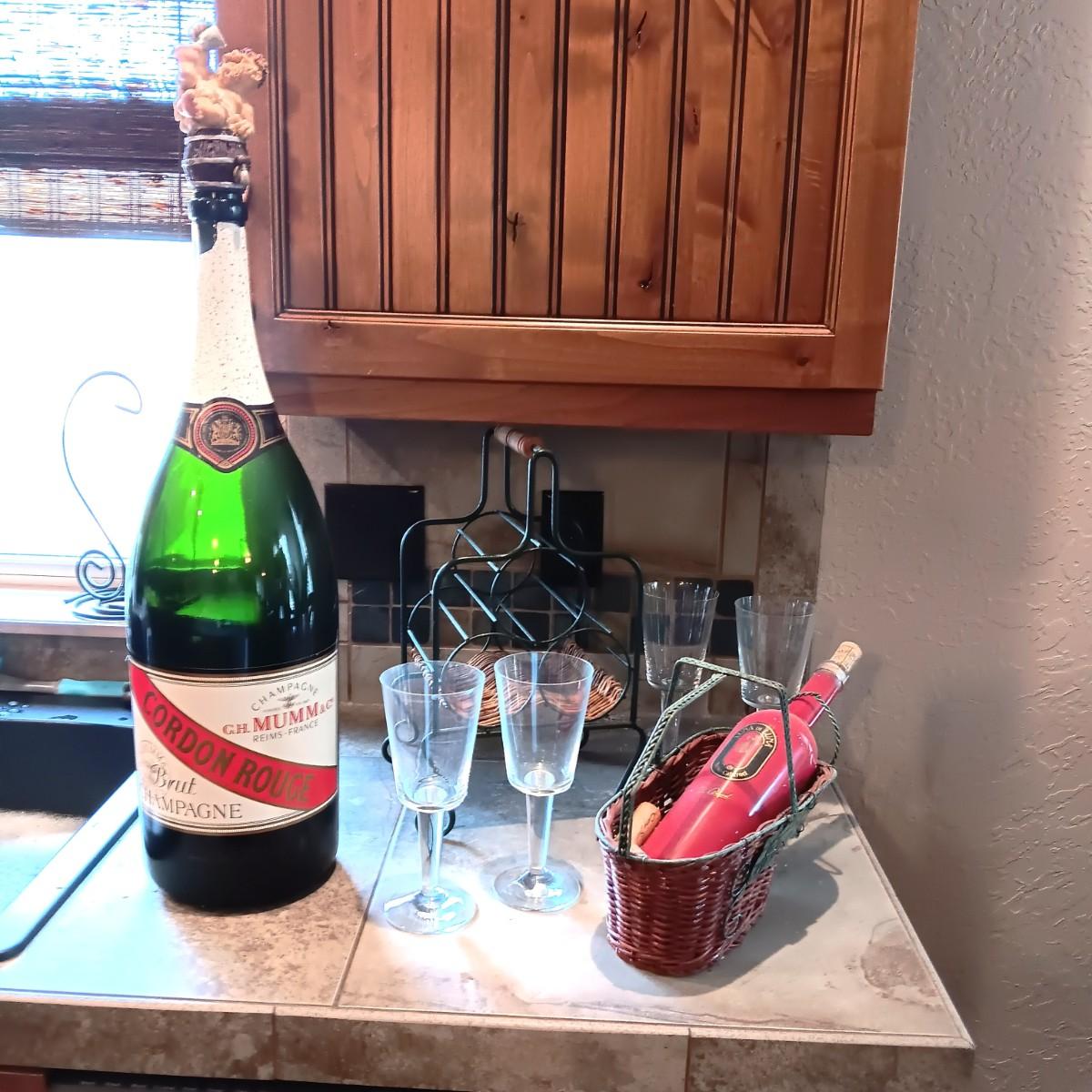 TALL EMPTY CHAMPAGNE BOTTLE, WINE RACK, BOTTLE HOLDER AND 4 STEMMED GLASSES