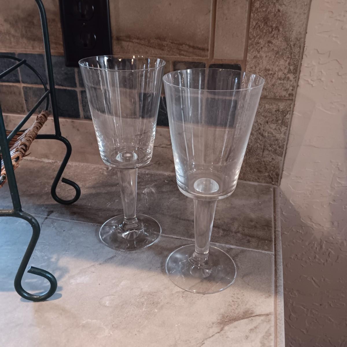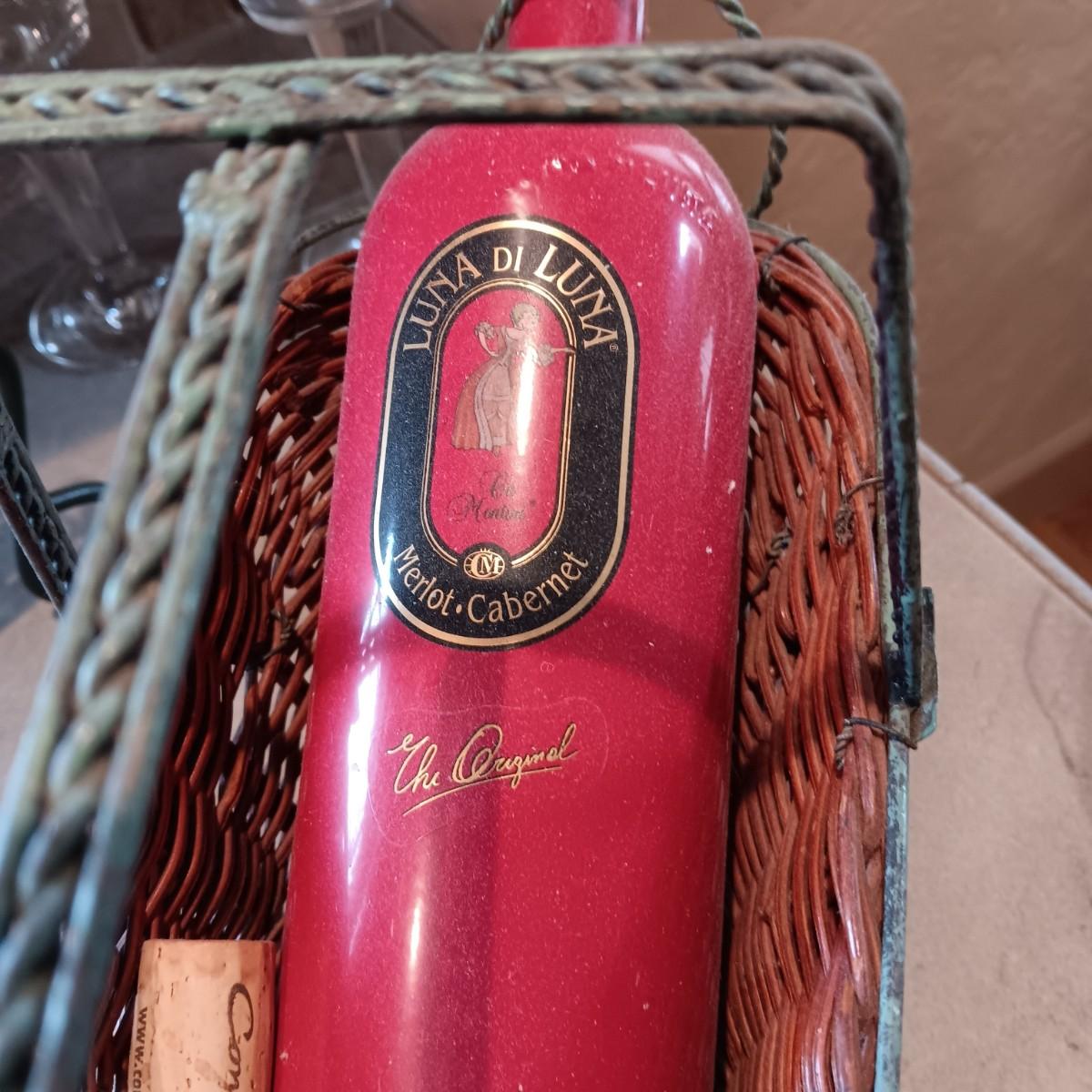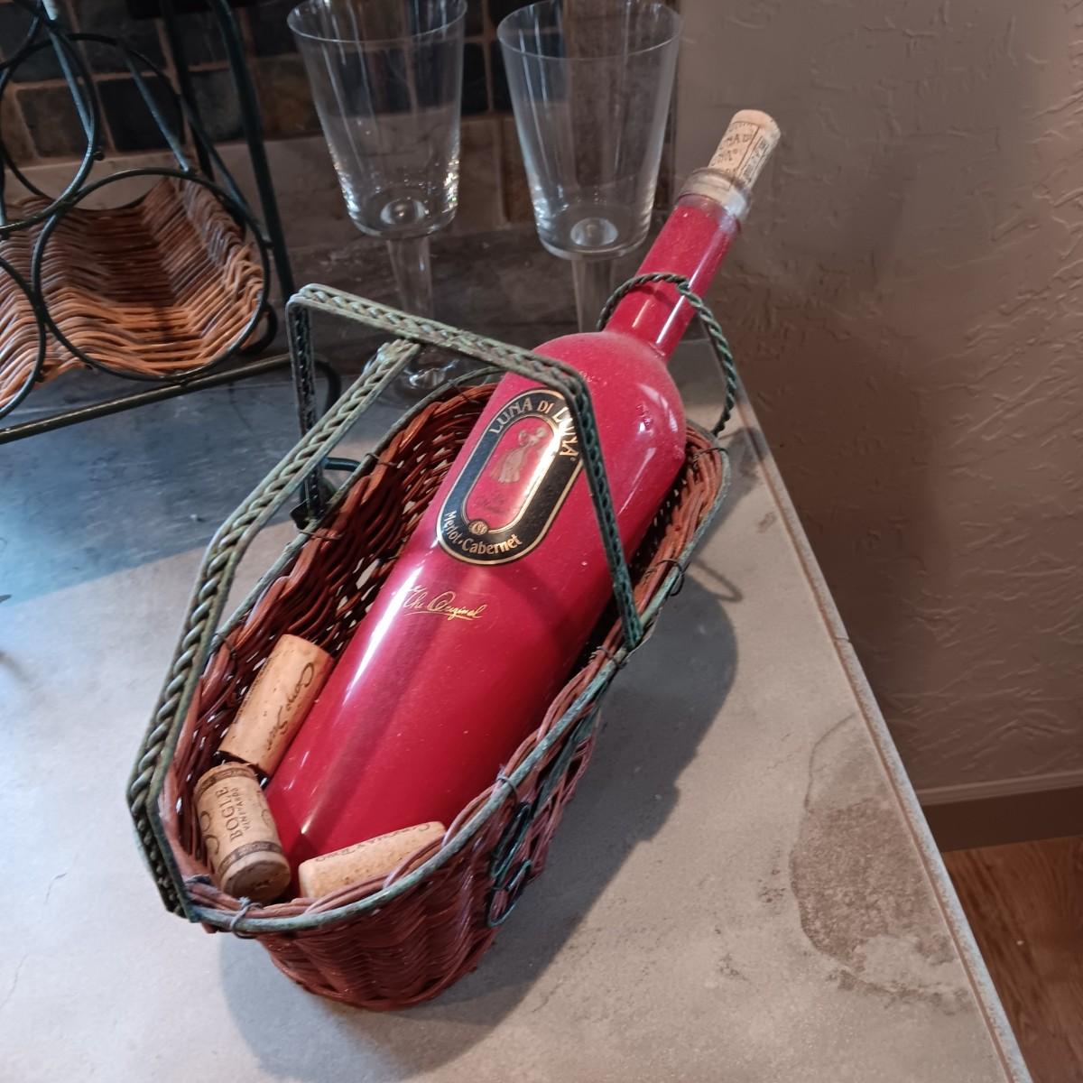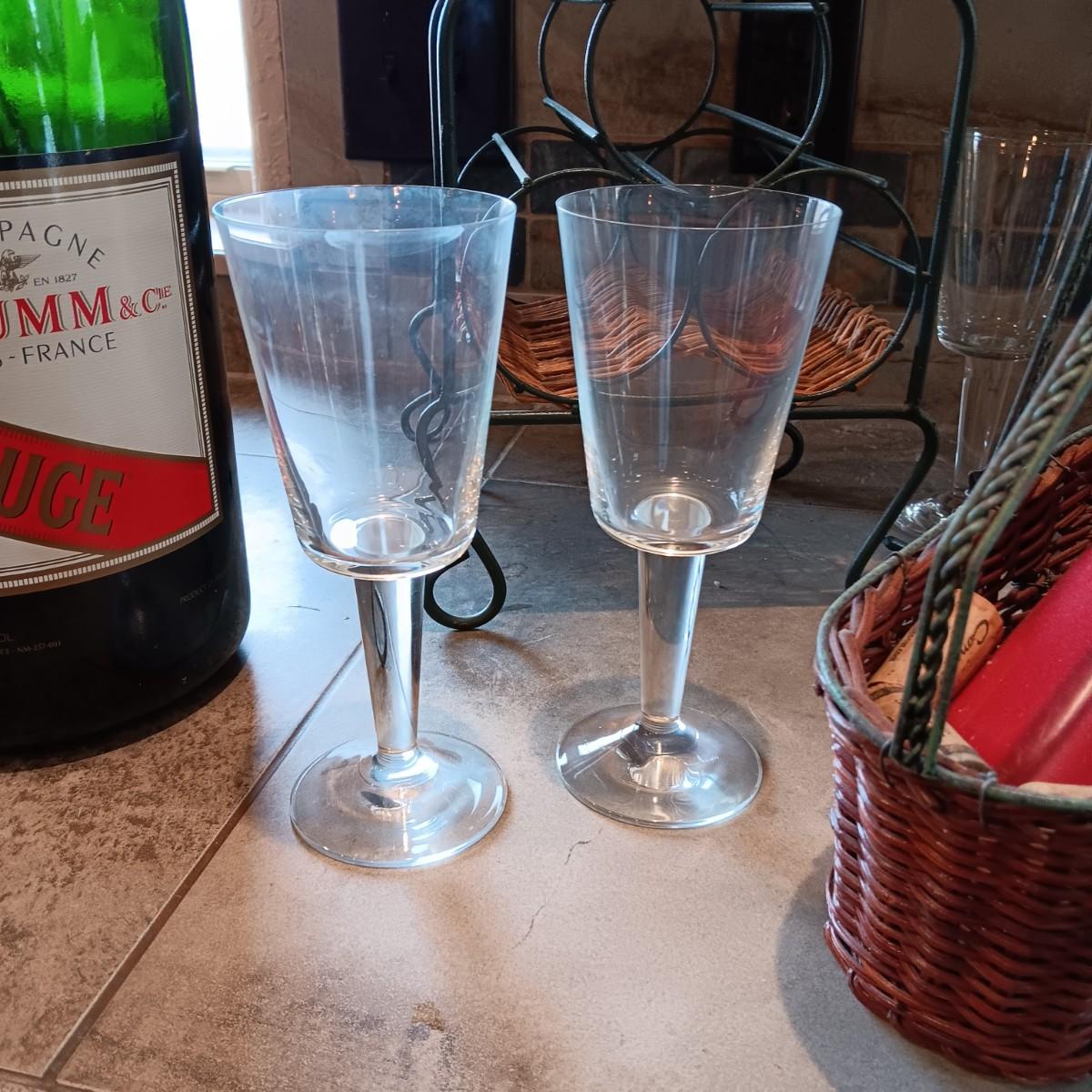 TALL EMPTY CHAMPAGNE BOTTLE, WINE RACK, BOTTLE HOLDER AND 4 STEMMED GLASSES
