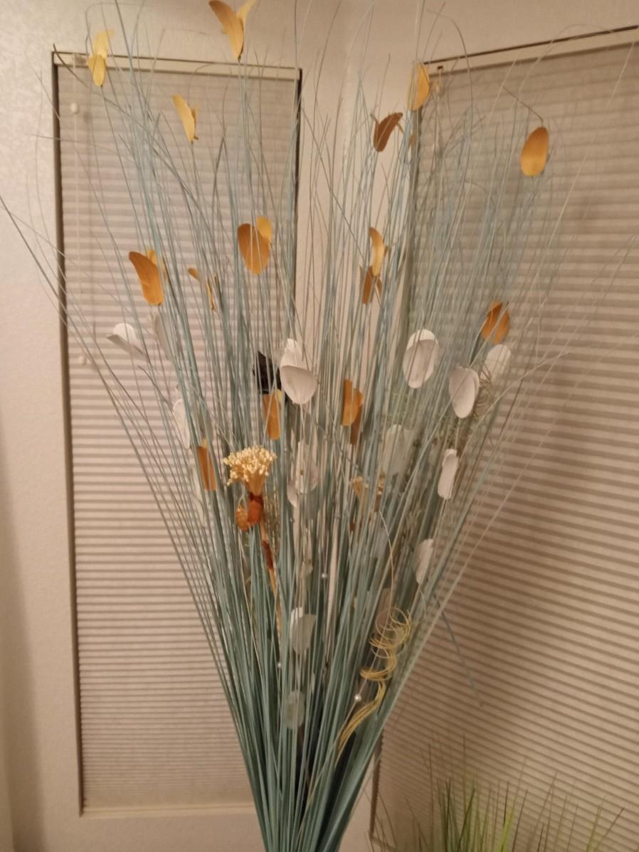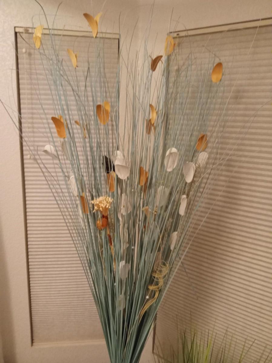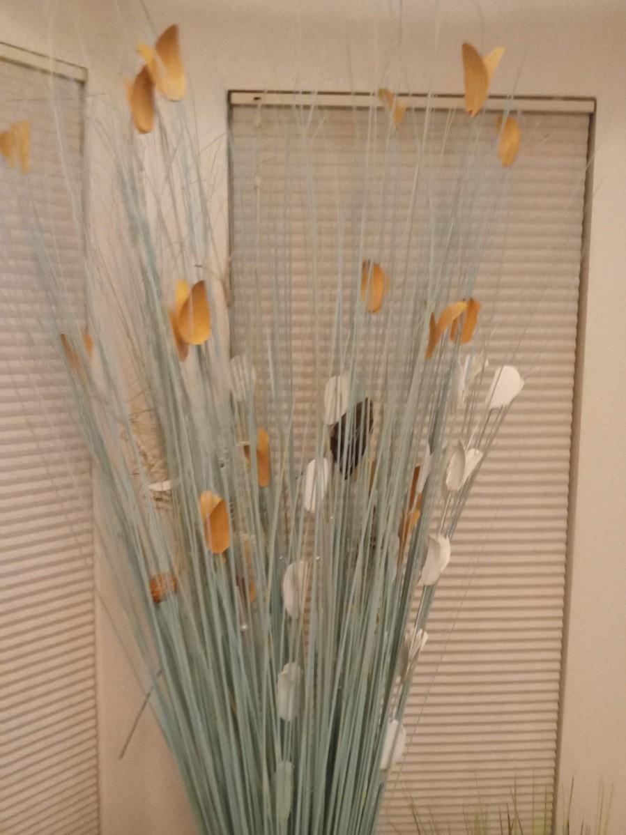 THE TALL FOLIAGE HAS LIGHT ORANGE AND CREAM LEAVES, IT STANDS 60"