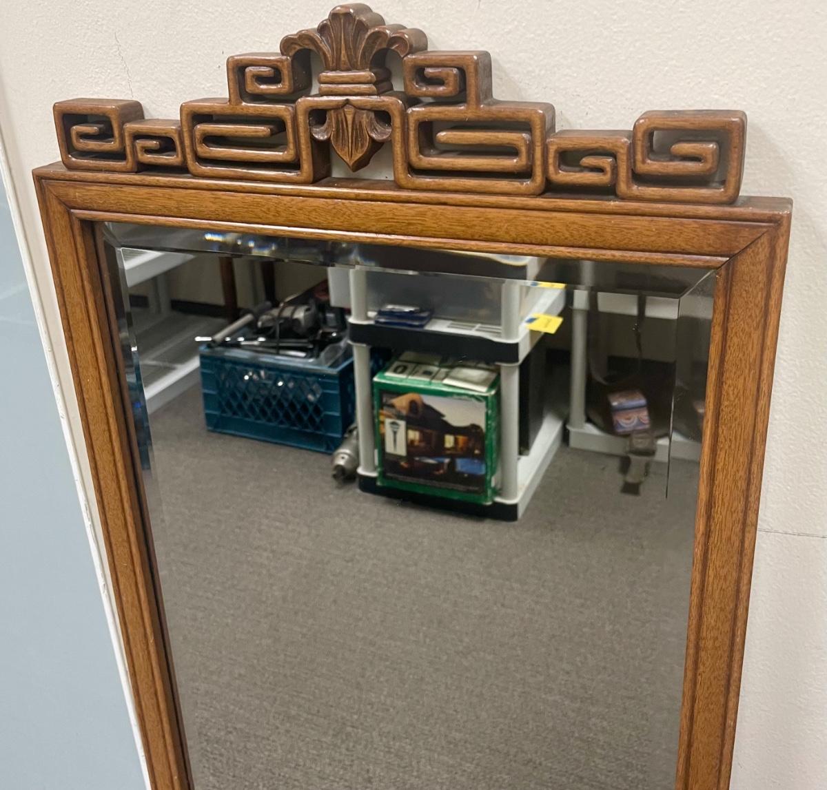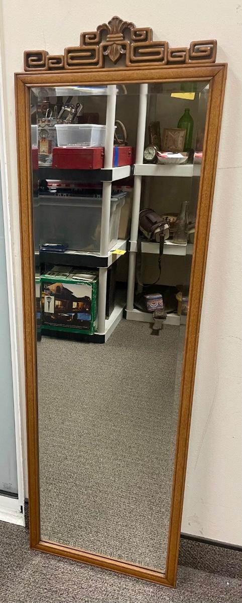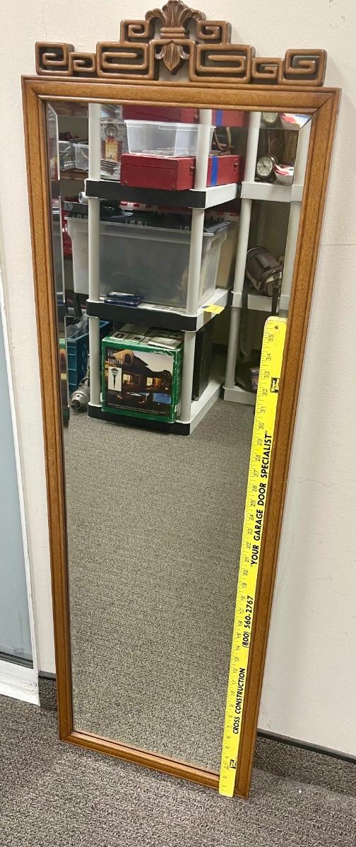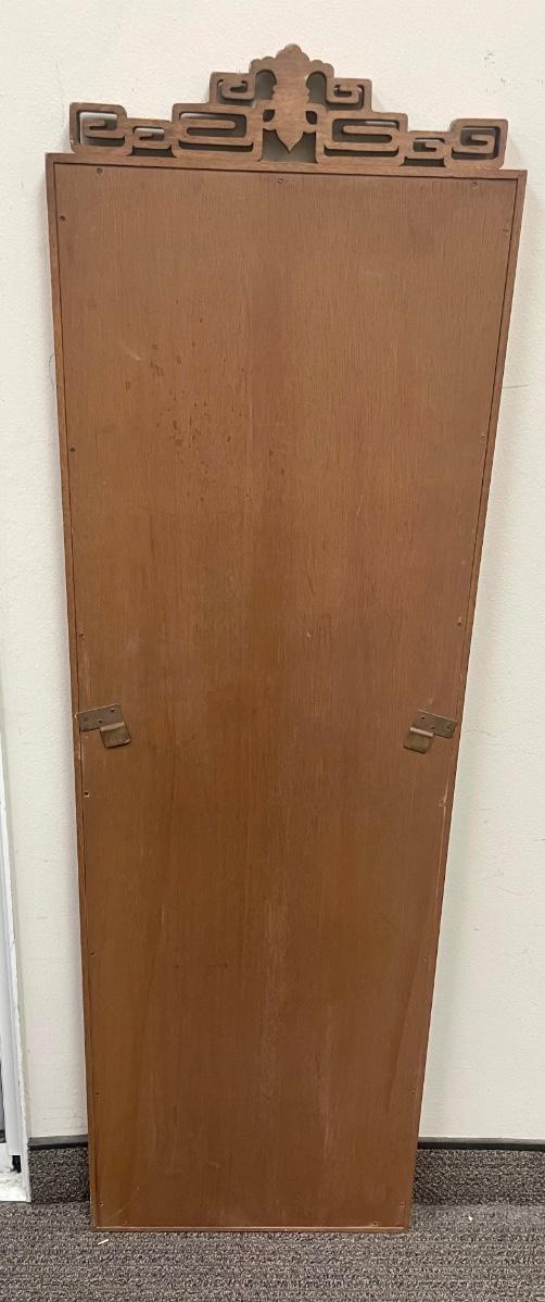 Approx. 15” x 48”. Frame looks like furniture grade walnut with scrollwork at the top. Plywood fully covers the mirror on the back. Very good condition.