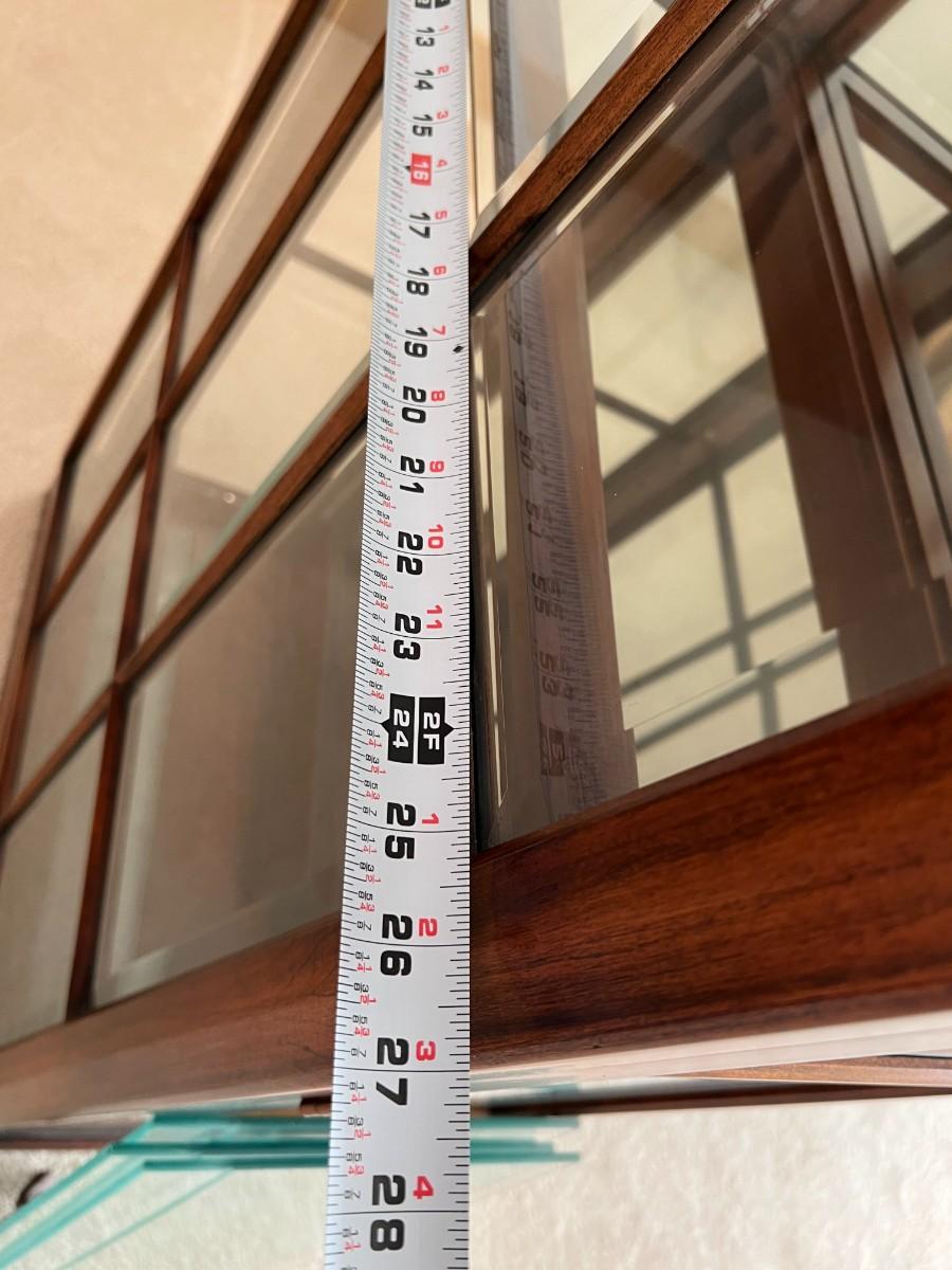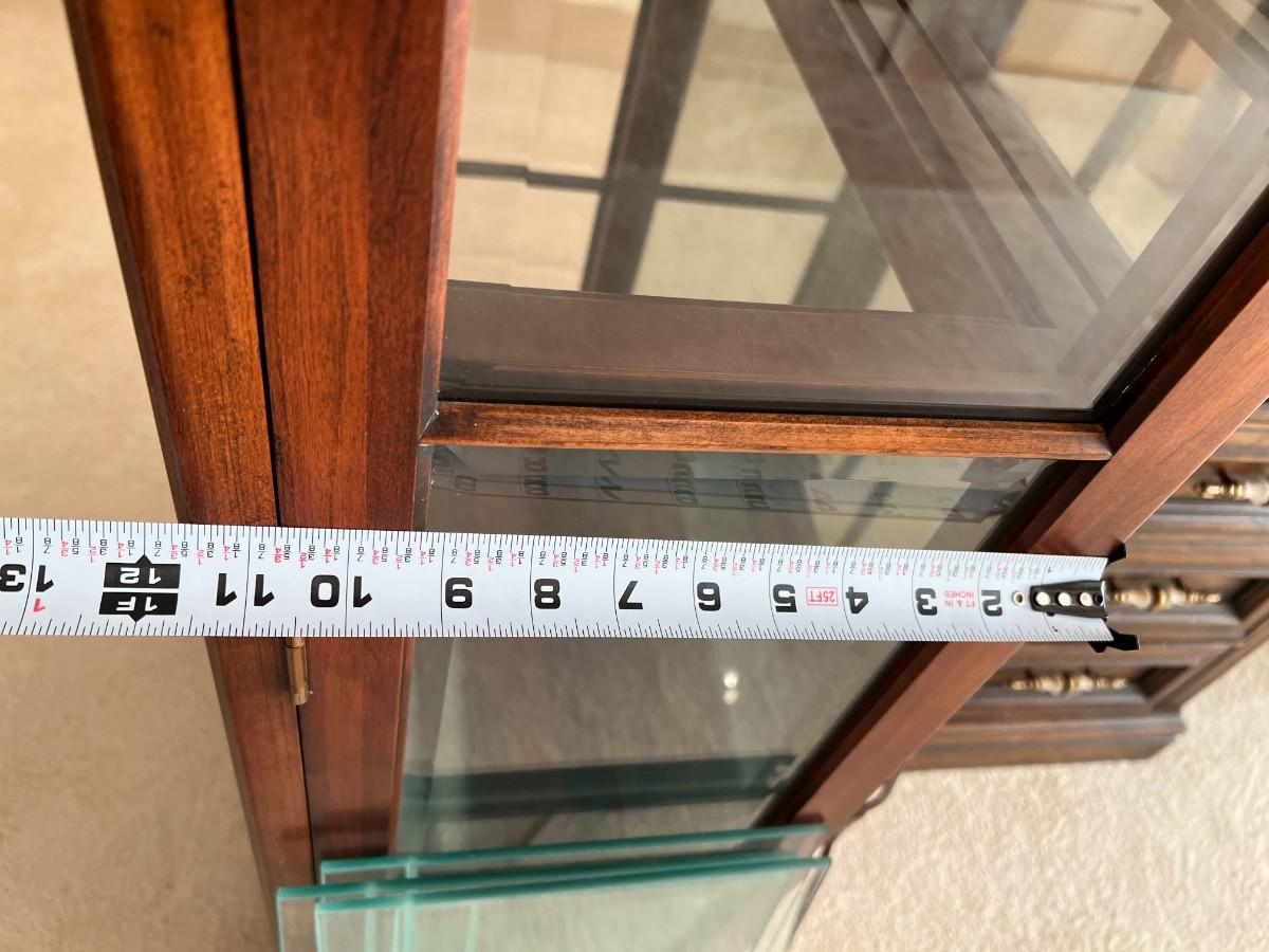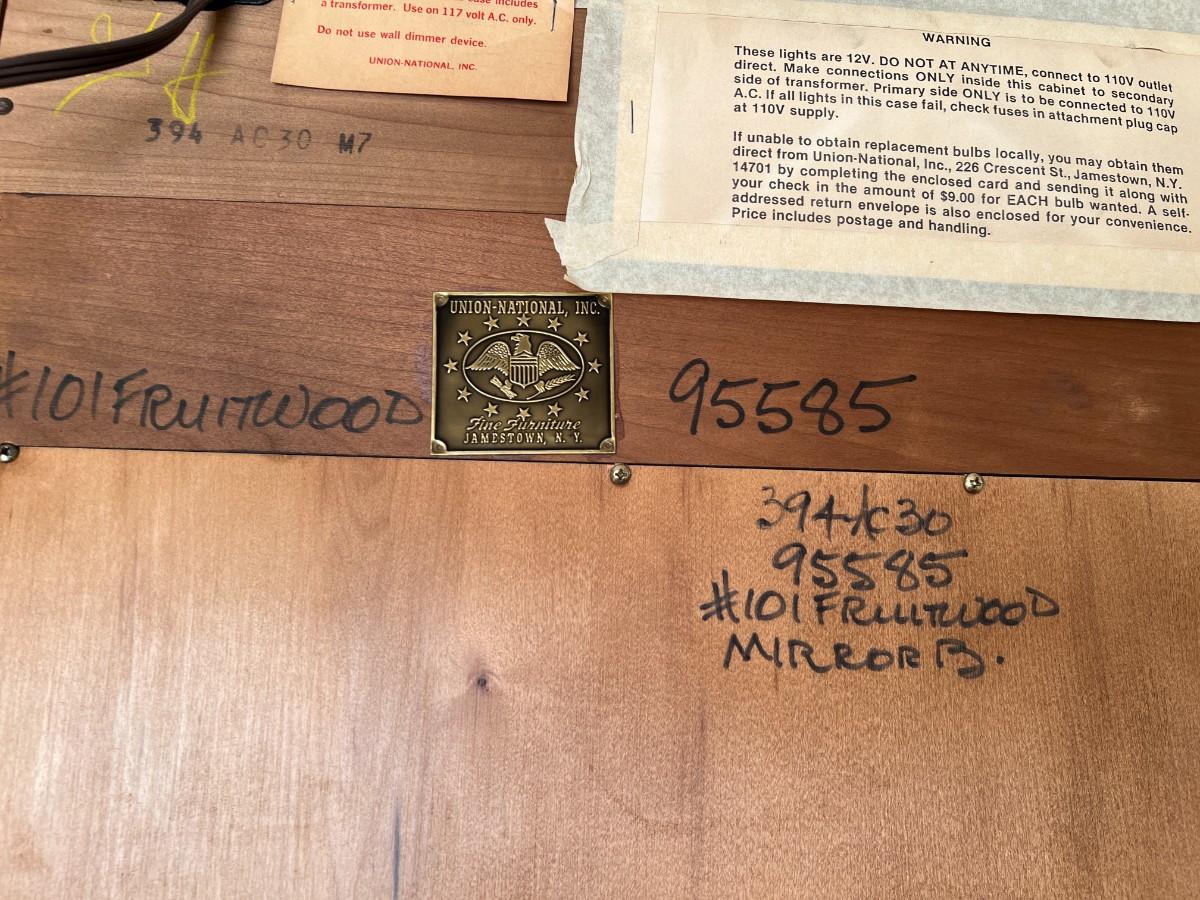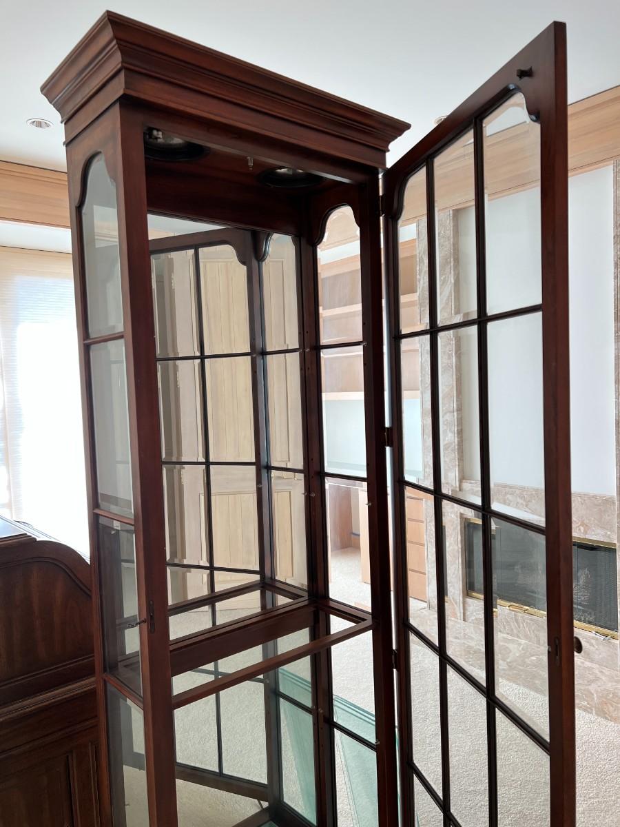 Tall Fruitwood Union-National Inc Fine Furniture Wood and Glass Lighted Display Cabinet, with extra glass shelves. In excellent, working condition.