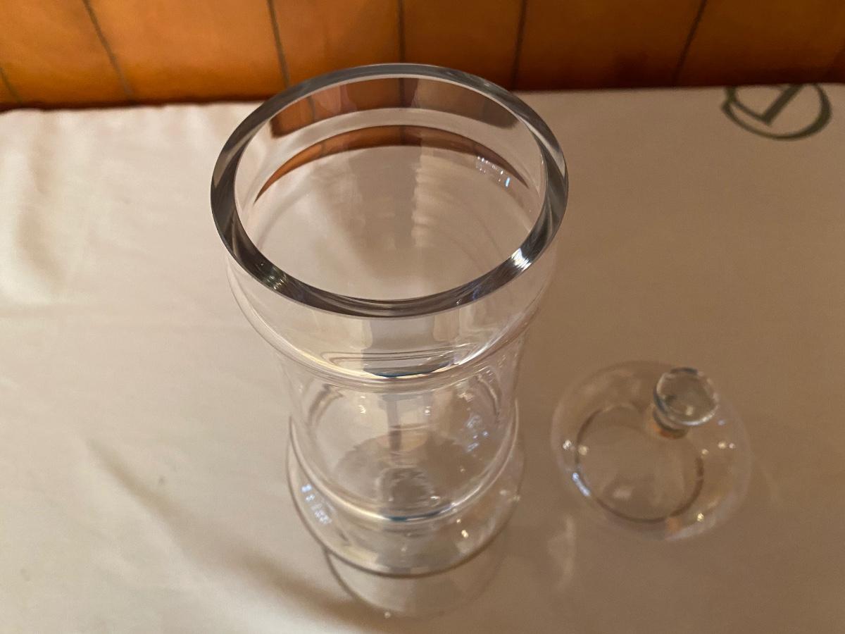 Tall glass apothecary jar on pedestal with lid. Approx 16”h x 4-1/2” base. Excellent condition